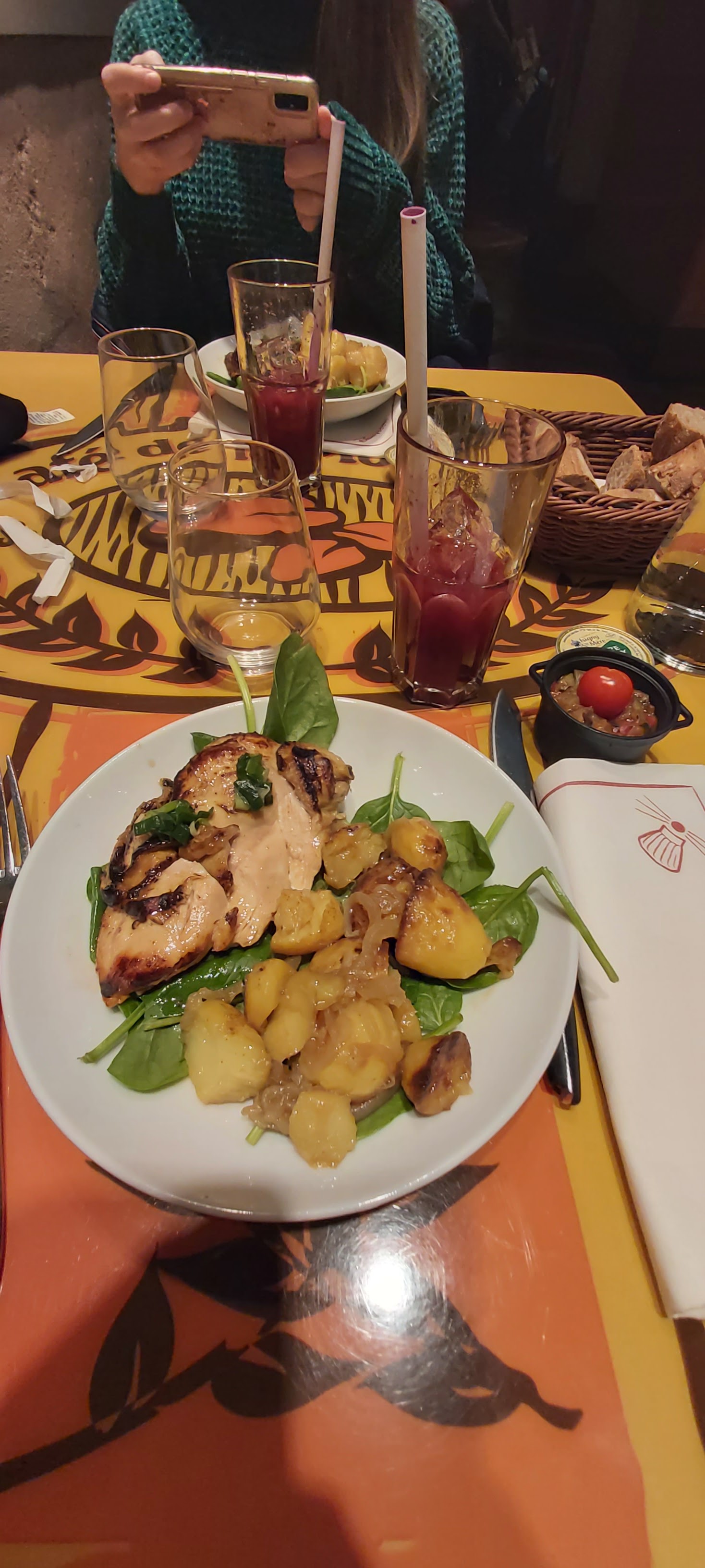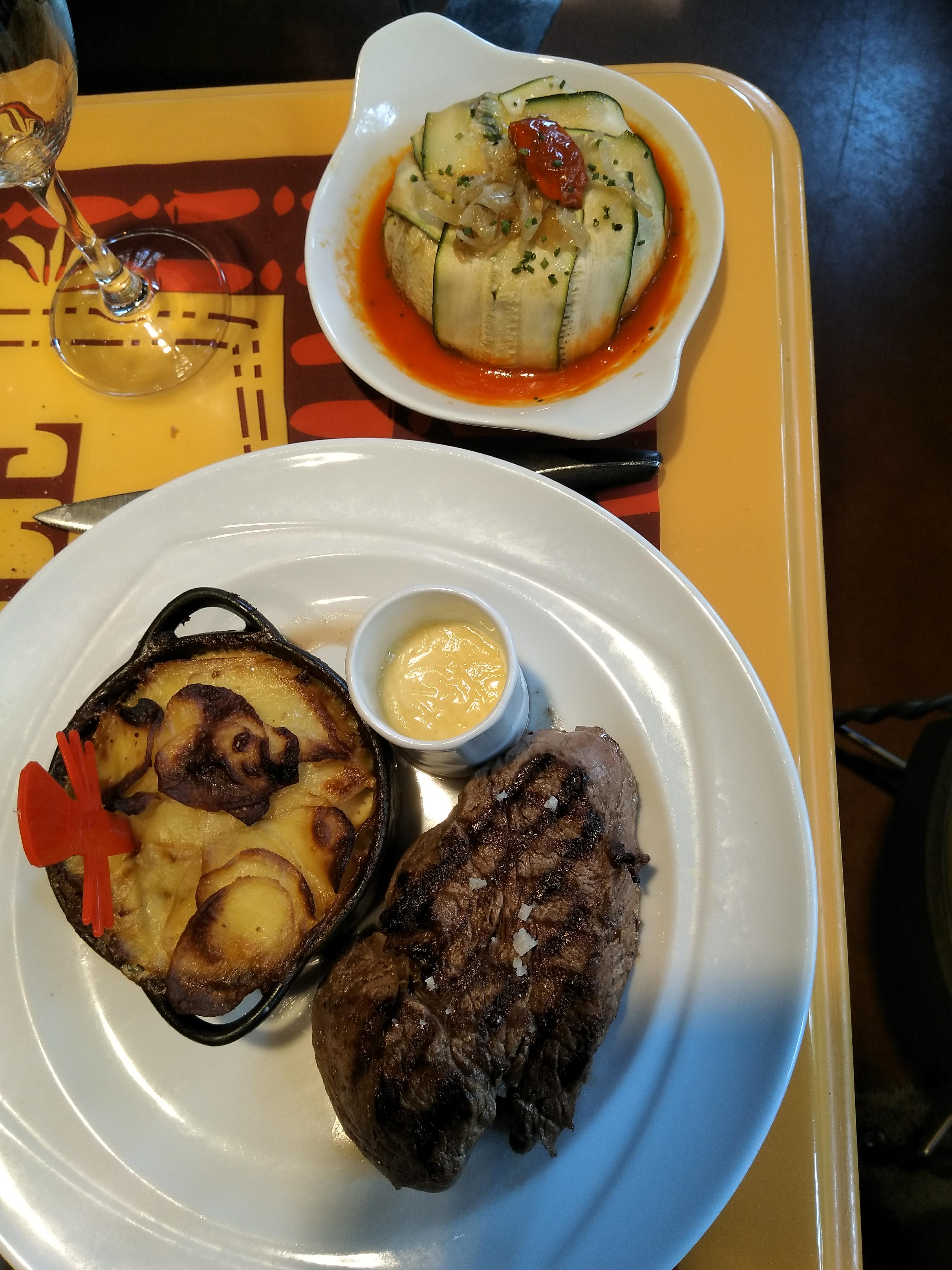 Très bon service et accueil par notre serveur~ J'ai un peu râlé du fait qu'a notre arrivé dans la salle d'attente, une serveuse ne nous a pas prise en charge mais d'autres personnes qui venaient de rentrer alors qu'il y avait du monde devant ces personnes là. Mais comme tout français je râle beaucoup :) Dès l'entrée, mon estomac était déjà remplie, j'ai eu du mal à finir le plat dont la viande ainsi que la sauce (chef) était très bonne mais moins les frites... La ratatouille ça allait. Par contre le dessert n'est que du décongeler et j'avoue n'avoir pas été fan. Je remercie aux cast pour mon anniversaire!
