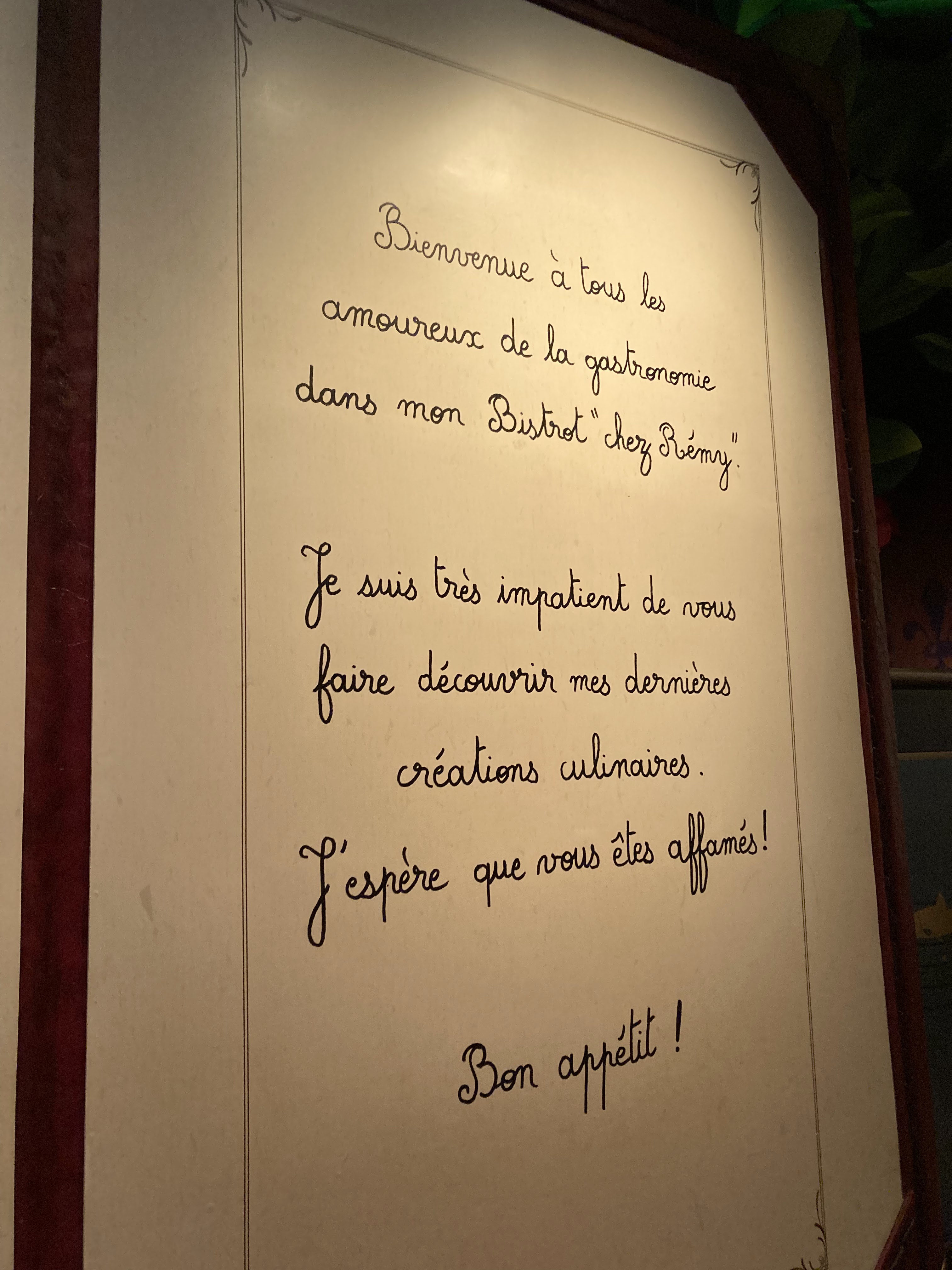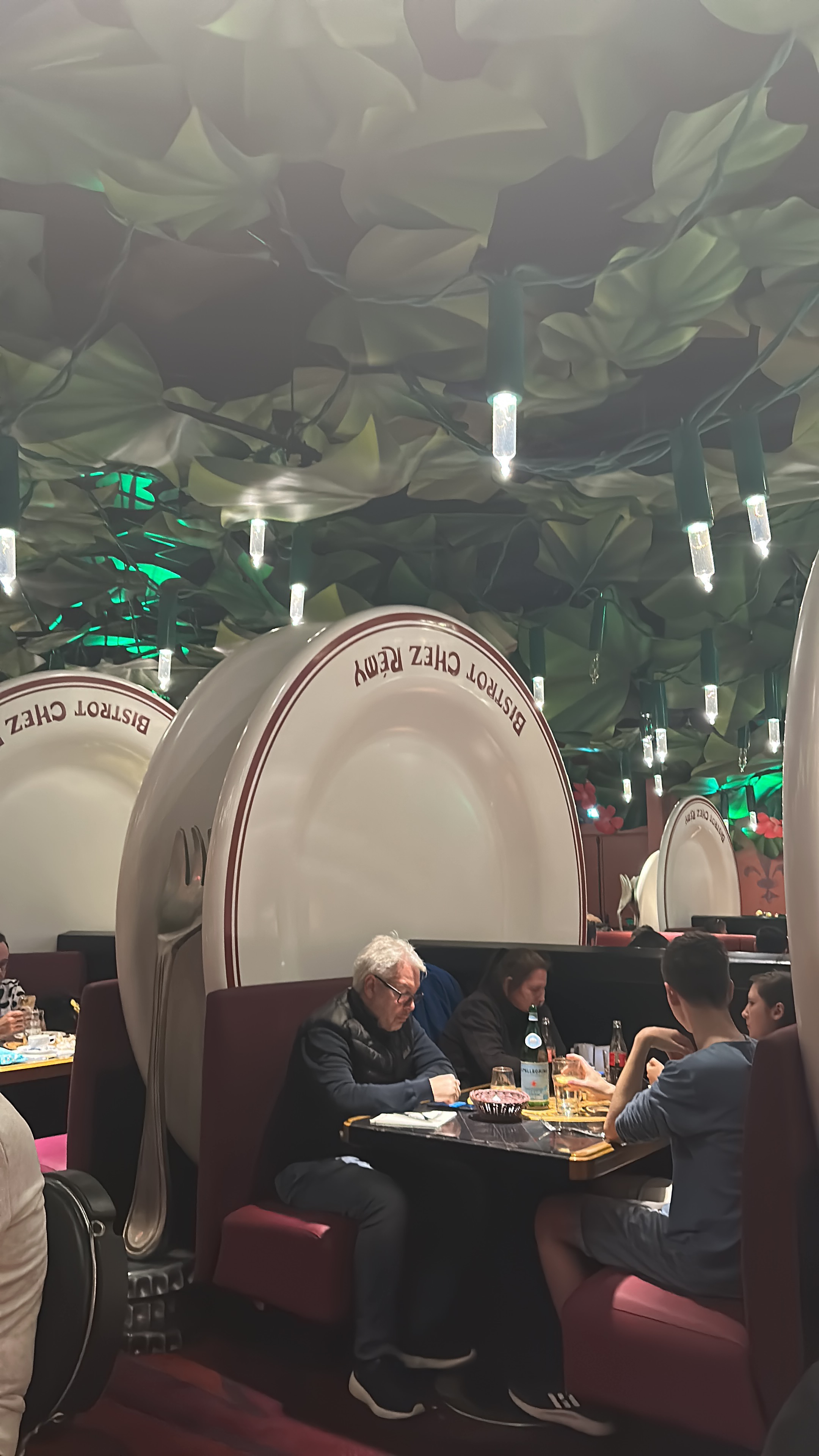 Le bistrot de Rémy est dans le top de l'immersion. Les décors sont somptueux, tout est fait pour qu'on se croit à la taille d'un rat. Le personnel est agréable et souriant. La nourriture est bonne et quel plaisir de découvrir son petit bol de ratatouille ^^