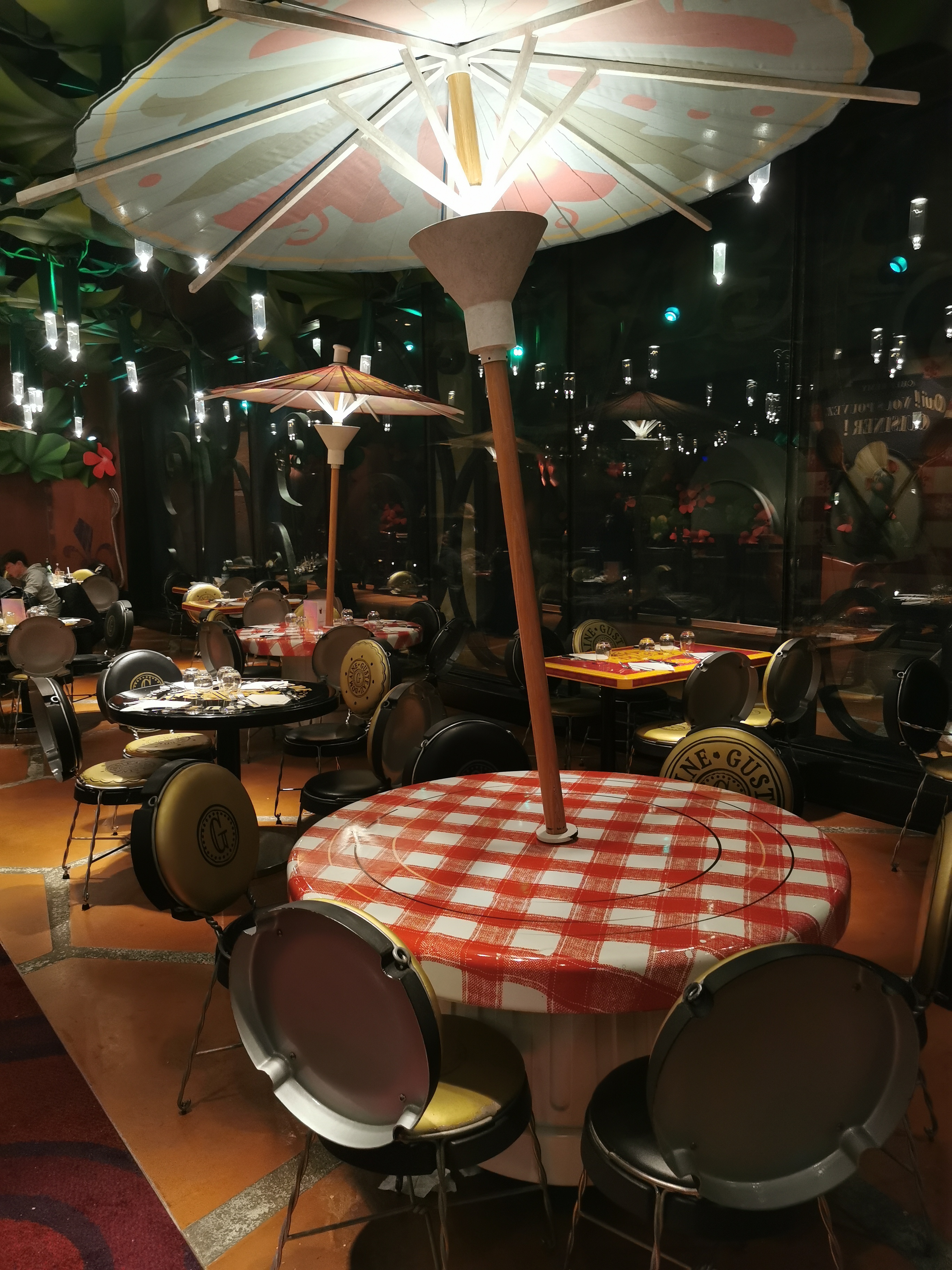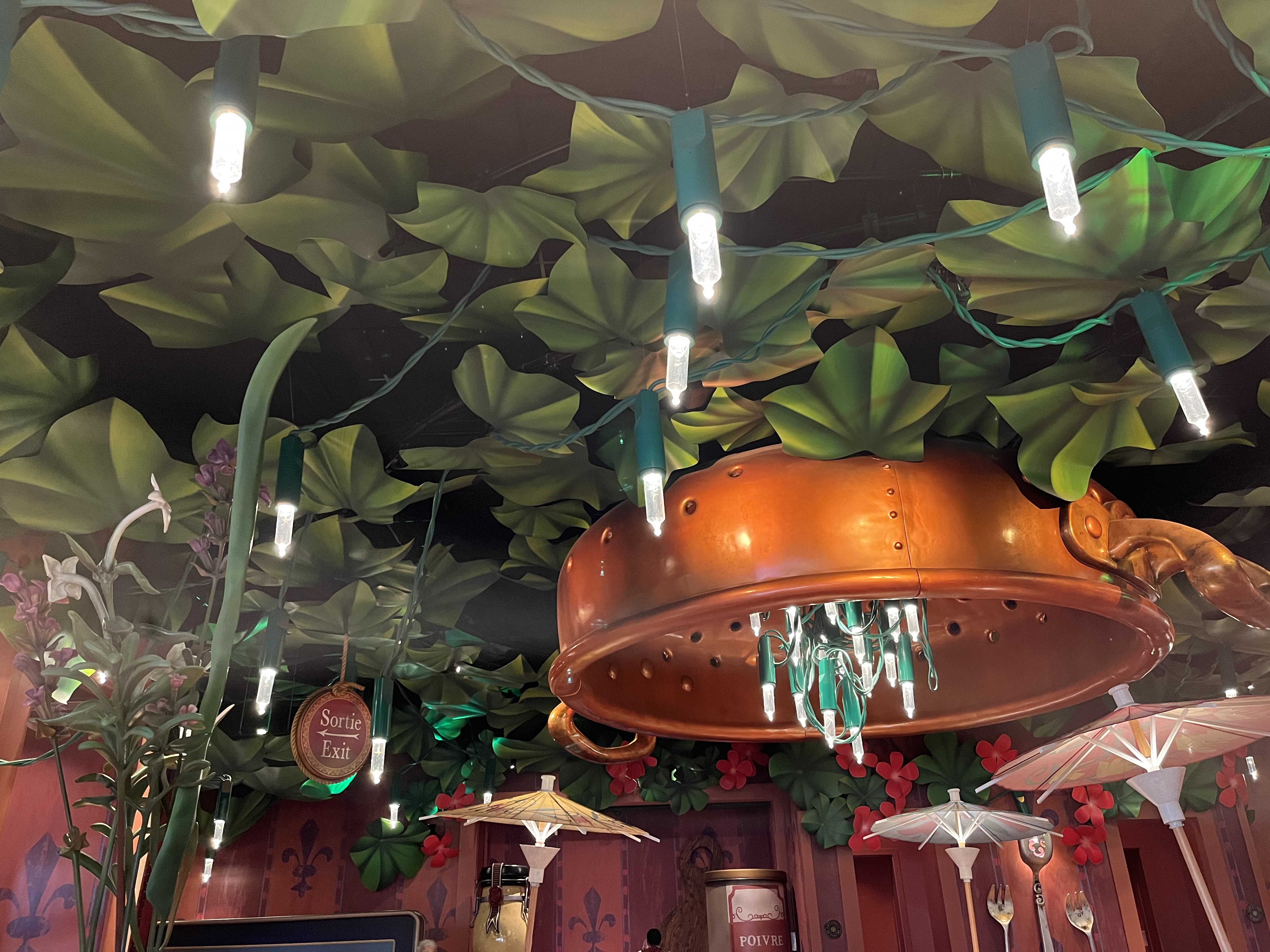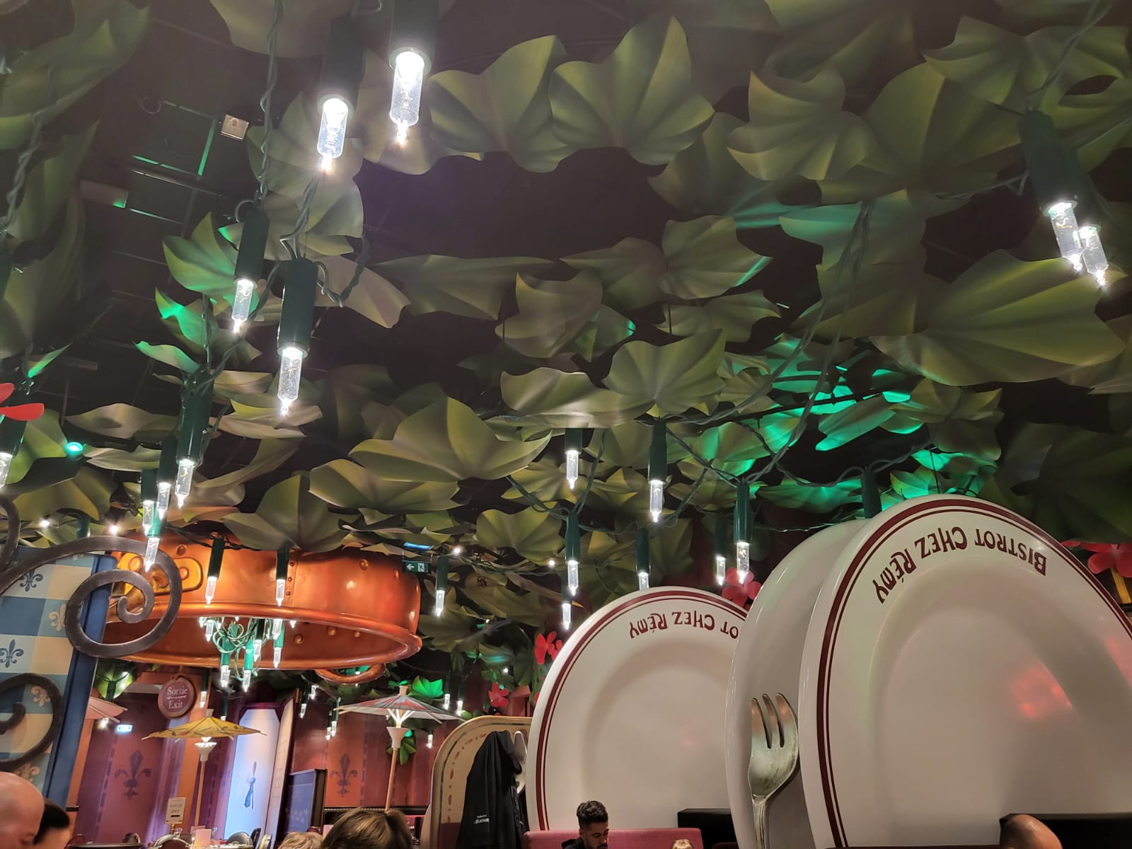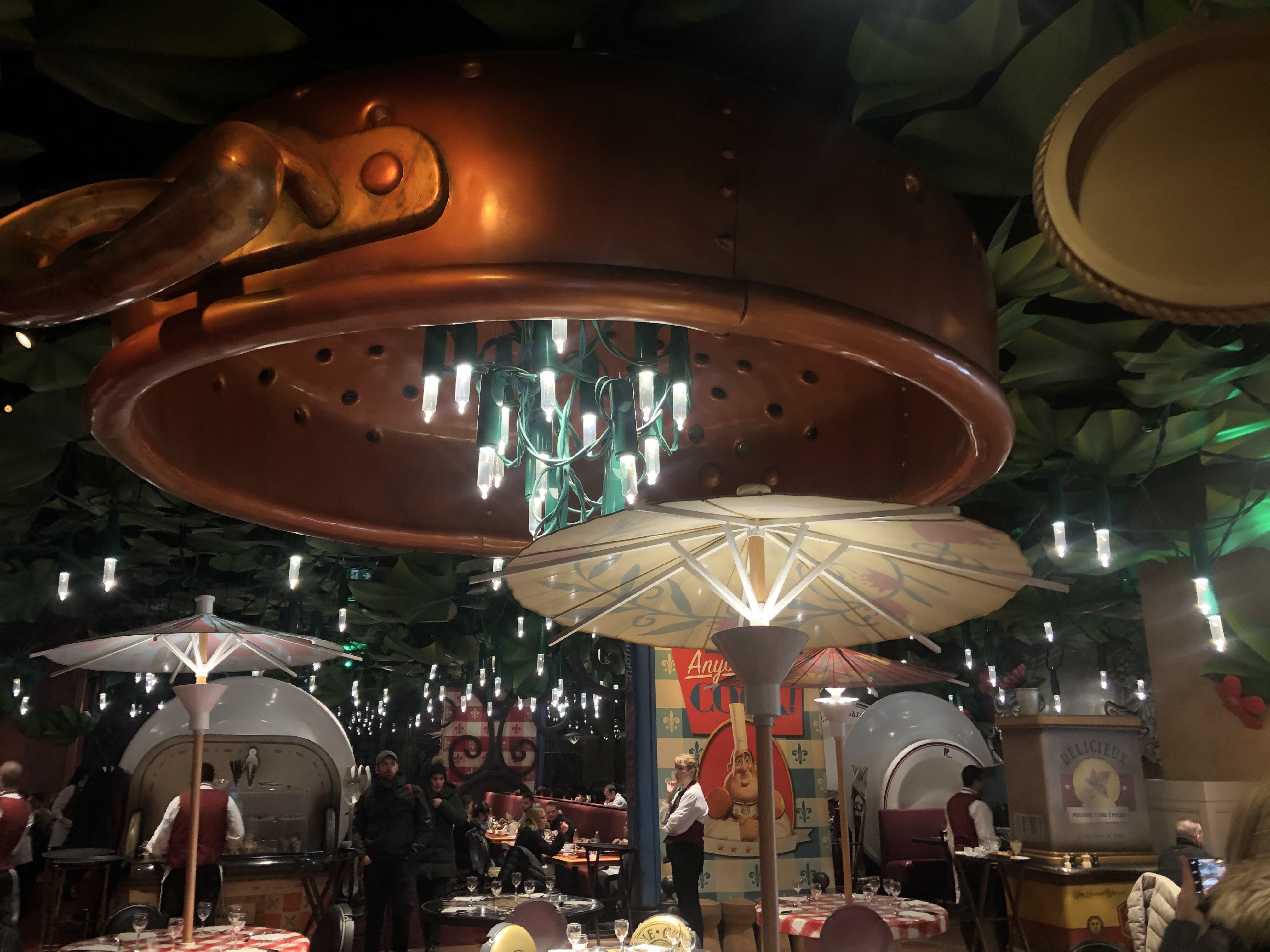 Autant le dire tout de suite, il ne faut pas y aller pour la nourriture mais avant tout pour le lieu! Le décor est incroyable, tout est pensé pour qu’on se sente une petite souris en train de déguster les plats de Rémy. C’est superbement bien conçu. Nous n’avions pas pu réserver avant le séjour car le restaurant affichait complet sur l’application. Nous y sommes donc allés à l’ouverture et nous avons pu réserver une table pour 14h. En revanche, en ce qui concerne la cuisine… ce n’est pas ça. Déjà le prix, 40 euros pour entrée plat (et non pas plat dessert, pour un dessert vous devez prendre le menu complet à une cinquantaine d’euros). C’est beaucoup trop cher si on regarde ce qu’il y a dans l’assiette (menu à 13.50 dans n’importe quel autre routier ou bistrot) mais on est à Disney et tout est cher à Disney. Les entrées ne sont pas très alléchantes ni originales (assemblage). Mon plat de poisson était étonnamment bon, une bonne sauce au beurre blanc et un écrasé de pomme de terres goûteux! Dommage que le poisson était trop cuit… En revanche la « pièce du boucher » une bavette très caoutchouteuse, une sauce à la moutarde sans intérêt et des frites surgelées. Tous les plats proposent de la ratatouille évidemment, mais quel dommage de ne pas la présenter au moins un peu comme dans le dessin animé !!! J’ai demandé à goûter l’éclair de Rémy (dans le menu enfant normalement). Aïe. Je pense que c’est le pire éclair que j’ai mangé, même au supermarché il y en a des meilleurs. C’est du surgelé, et du mauvais surgelé. Pâte à choux sèche, crème au beurre écoeurante… A noter que le personnel est super agréable et souriant !