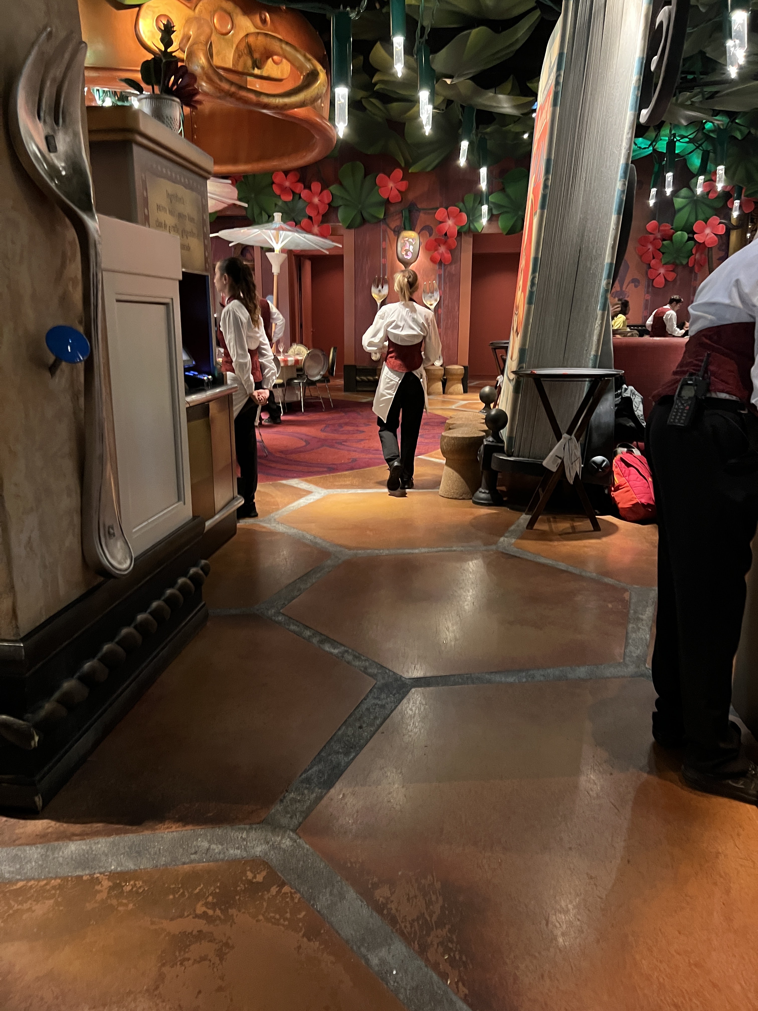Bonne atmosphère. Disney a fait un excellent travail pour donner vie au film. Cependant, la nourriture et le service étaient en dessous de la moyenne pour le prix. Et obtenir une réservation ici est presque impossible. Prévoyez de réserver au moins un mois et devez vérifier quotidiennement la disponibilité.