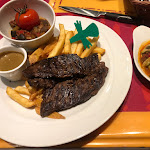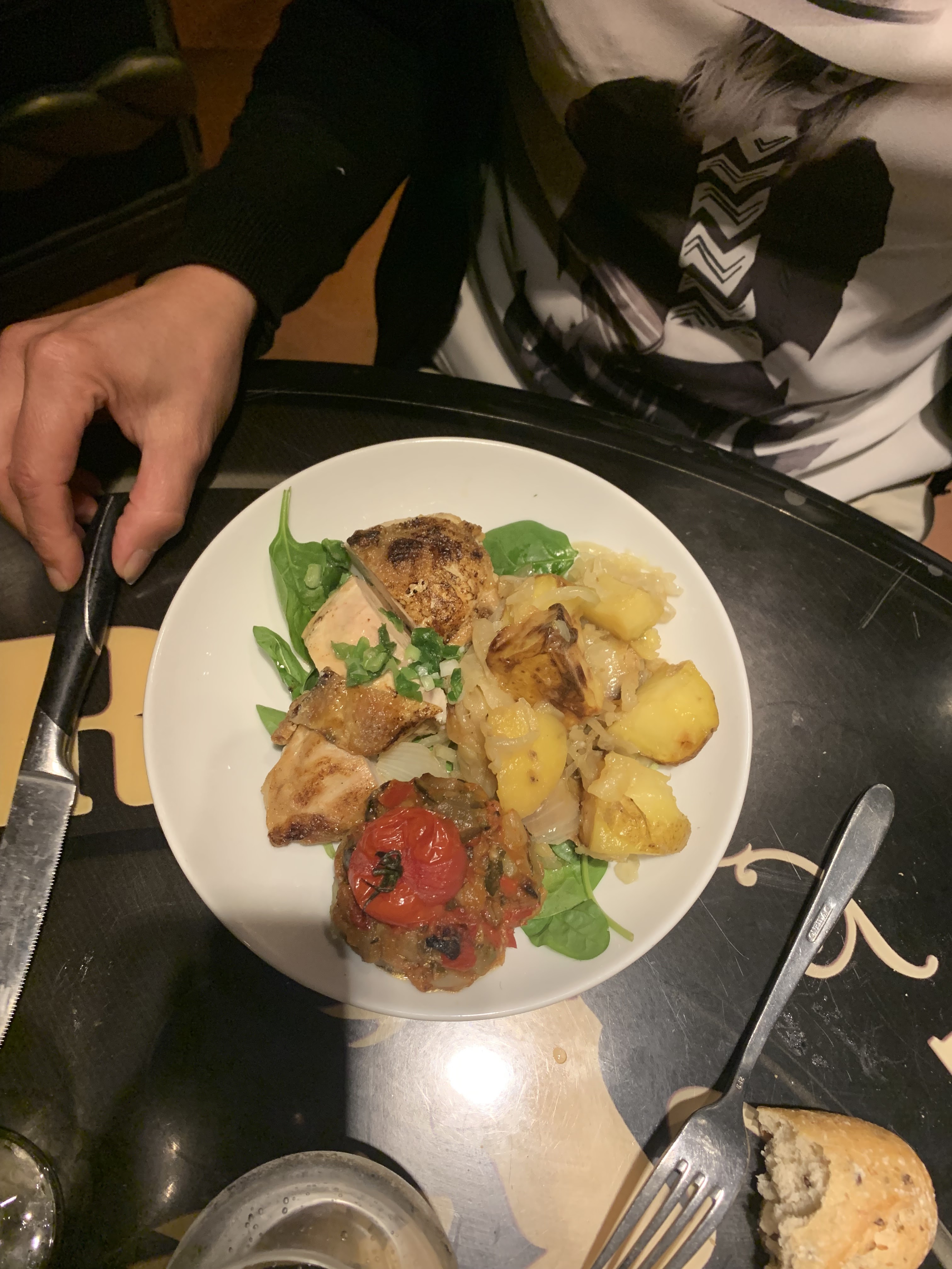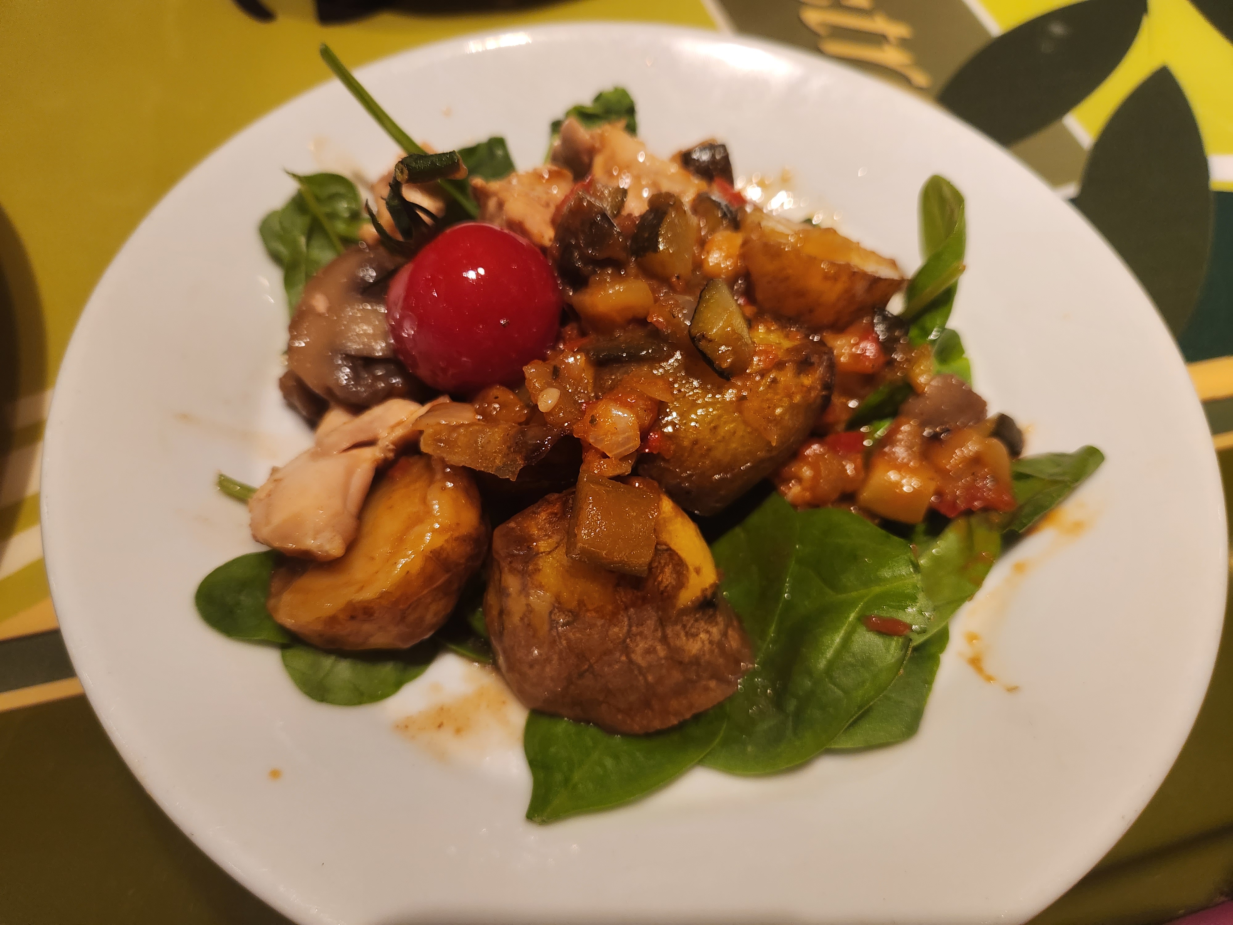 La décoration est certes amusante, mais si vous recherchez un excellent repas assis, vous ne le trouverez pas ici. La nourriture à l'extérieur est si belle après le repas ici. La ratatouille est vraiment bonne. C'était rafraîchissant au goût avec la pomme de terre écrasée. Cependant, la morue était trop cuite et sèche. Je me demande s'ils l'ont passé au micro-ondes. Le steak était aussi un peu sec. C'était dur de finir.
