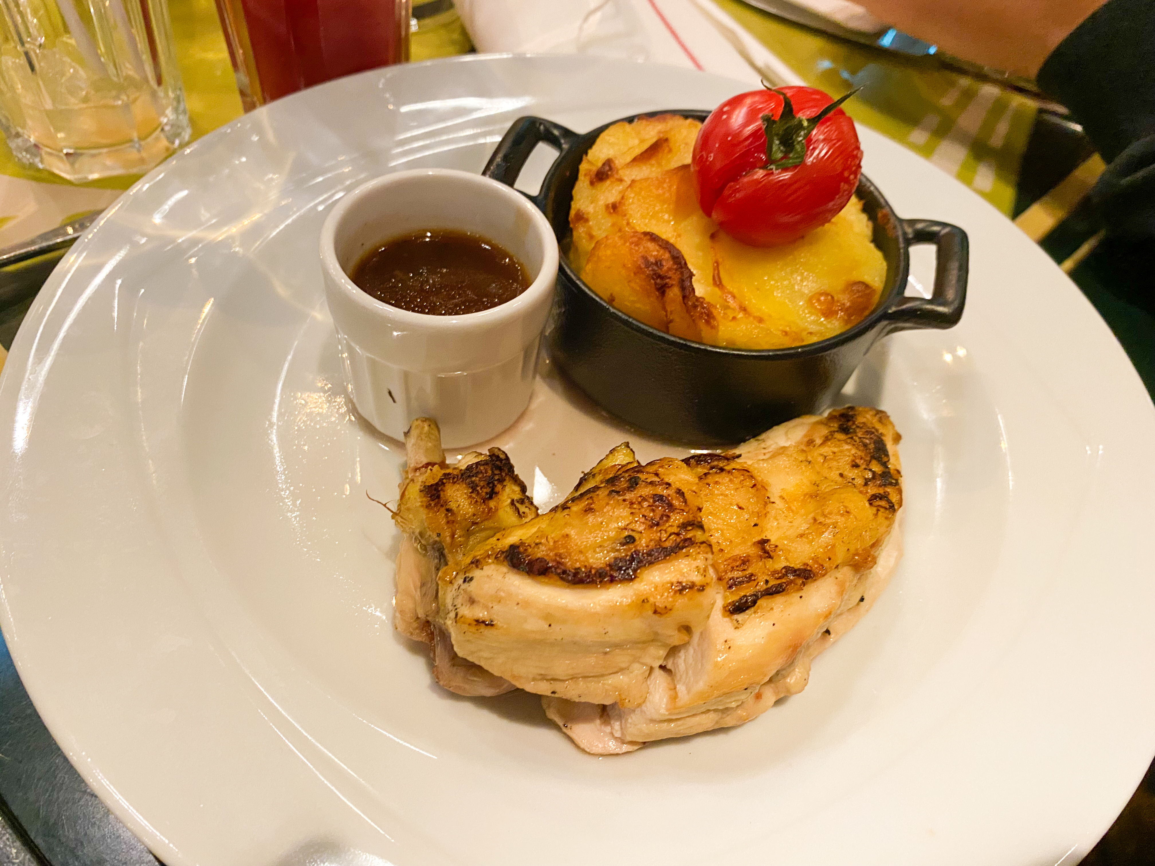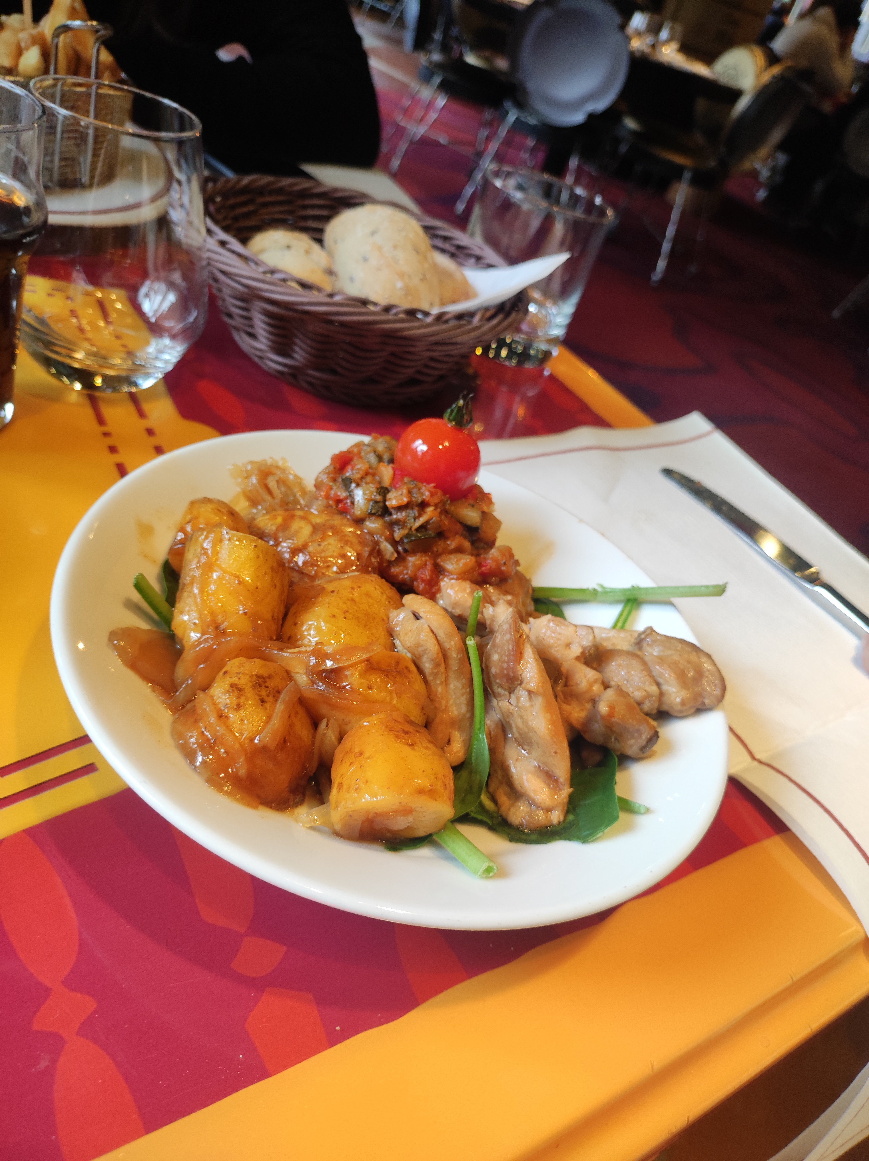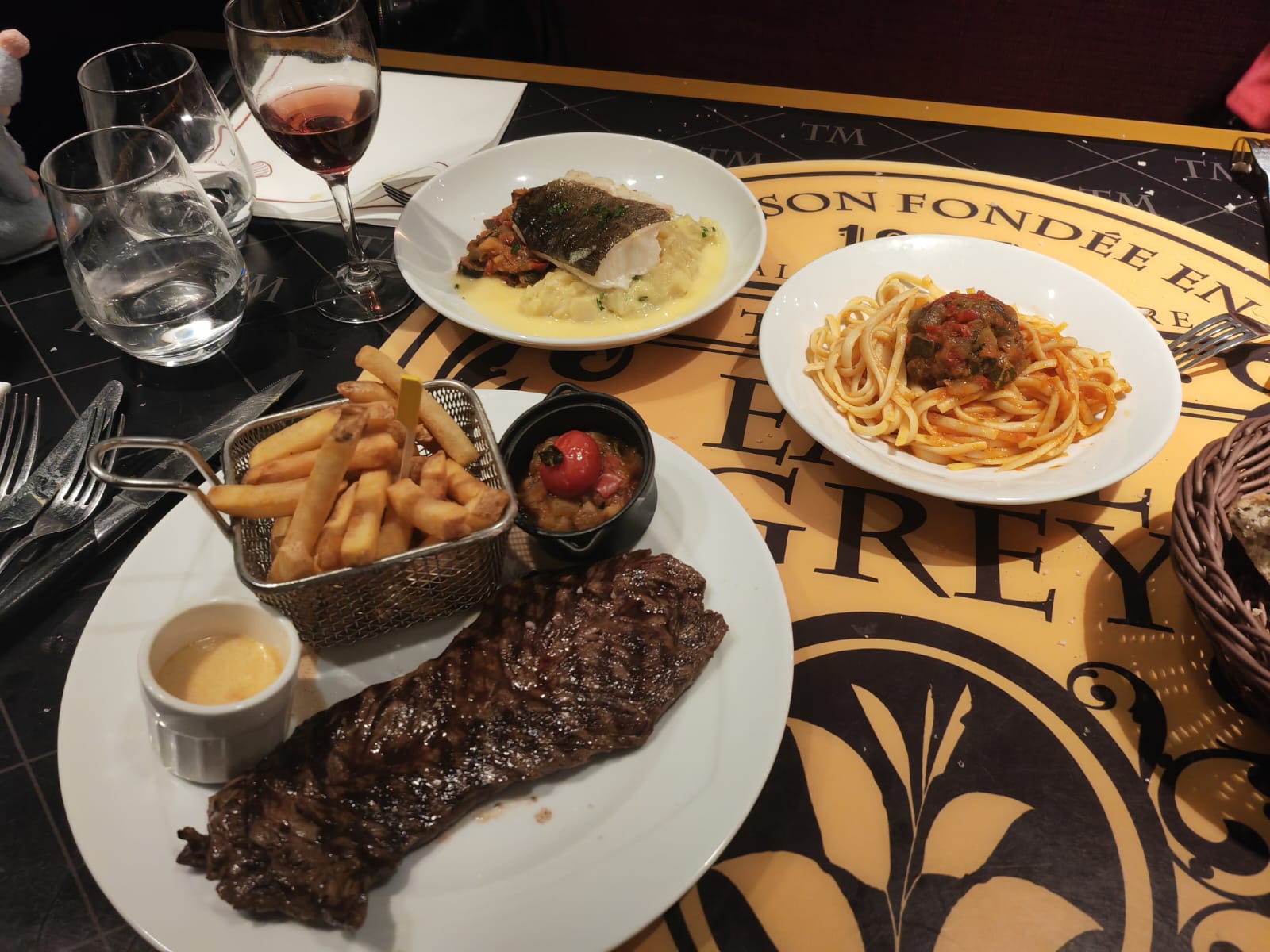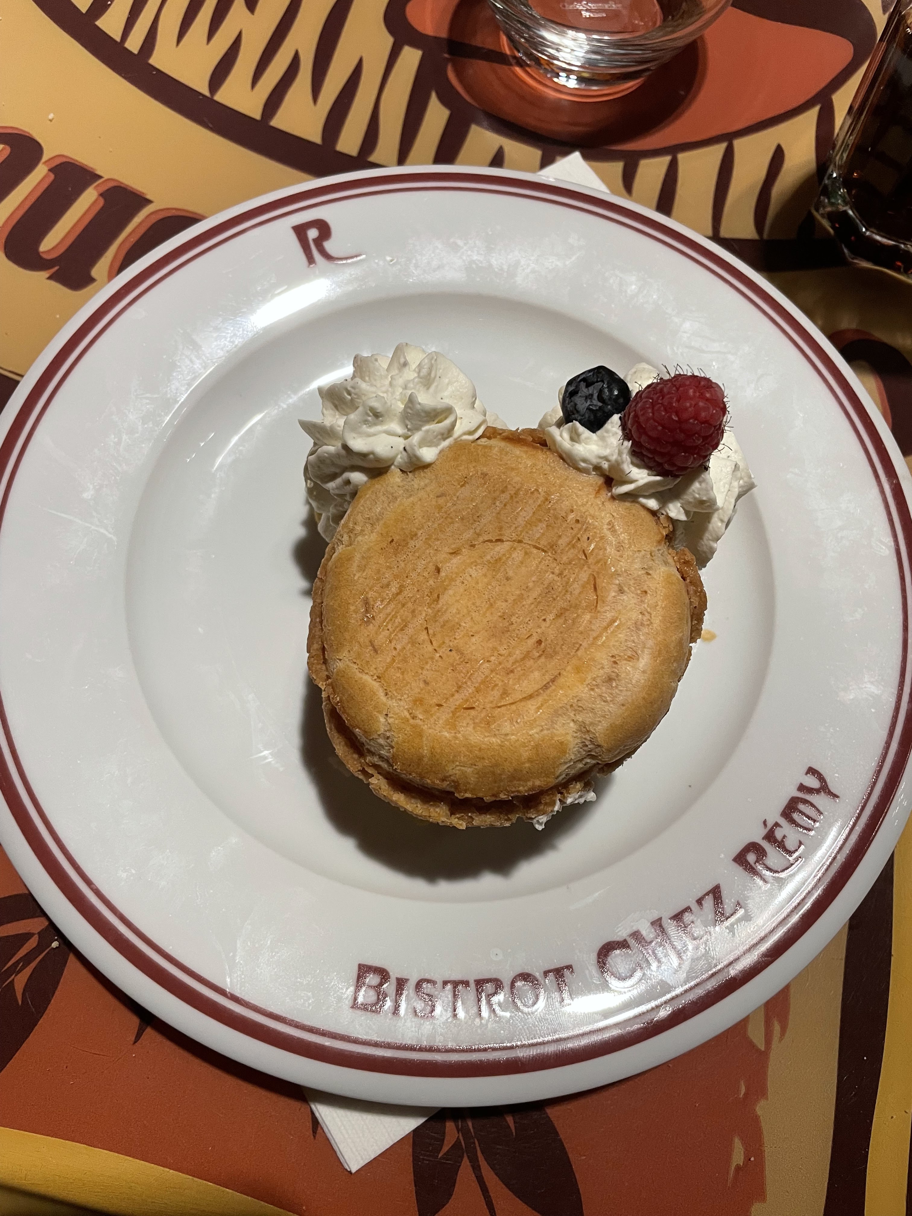 L'accueil est moyen. Un restaurant de disney qui accueille un grand volume toute l'année pourrait moderniser et accélérer L'accueil des réservations. On se retrouve dans une queue d'attente mêlant réservations et sans réservation... pour le service à table il a était top, le serveur a été avenant et souriant, un plaisir. Le repas était moyen. Avec une mauvaise note pour les frites... comment peut on rater des frites même congelées... la pièce de bœuf a été la bonne surprise. Les cuissons demandées respectées. Pensez à demander le cocktail de bienvenue possesseur du pass infinity ou magic plus. Il est vrai que ce n'est pas donné, mais le contraire à disney serait étonnant. On a apprécié et profité du folklore. Une petite mascotte de Rémi qui passerait de table en table serait vraiment bien. En photos, menu enfant :rillettes de poulette, cabillaud purée de Pdt, éclair. Menu adulte: soupe ou salade, pièce de viande frites ratatouille.