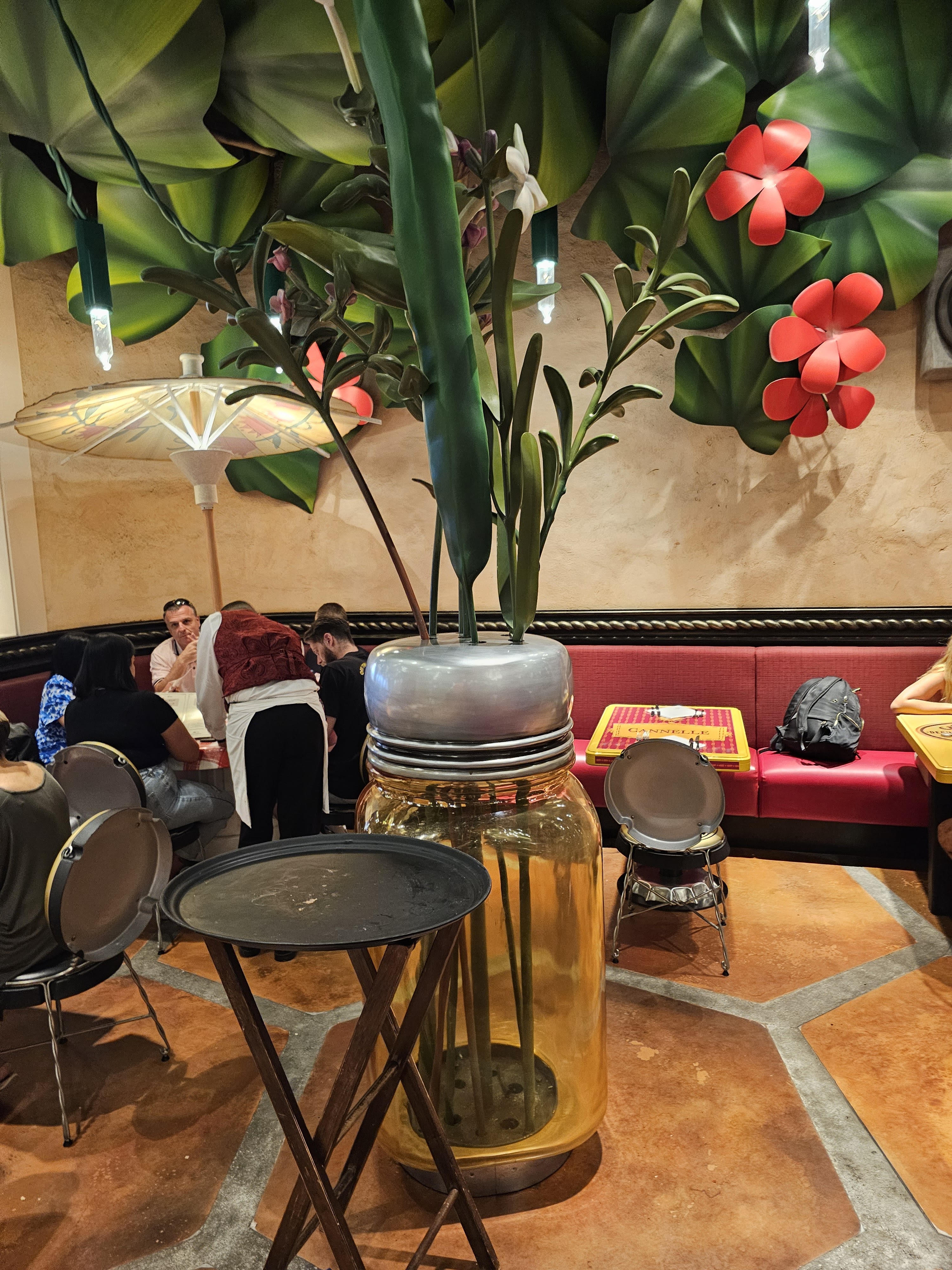 J'ai adoré chaque élément de ce restaurant! La nourriture était bonne. Cependant, le service aurait pu être meilleur, sachant qu'il y avait de la place dans la partie principale du restaurant où se trouvent les assiettes géantes, nous avons été placés à l'entrée du restaurant où le bar était légèrement découragé mais mon mari a demandé. pour que nous soyons émus, et nous l'avons été ! Comme nous étions un groupe d'êtres de couleur, nous ne pouvions nous empêcher de penser que c'était la raison. En prenant notre commande, le serveur semblait impatient et tapait sa main contre le carnet de commande, ce qui nous laissait encore un goût amer dans la bouche. L'ambiance était incroyable !! Même si c'est cher, cela en valait vraiment la peine, nous nous sentions comme des personnages miniatures, de la même manière que les rats dans le film ! J'y retournerais sans hésiter !