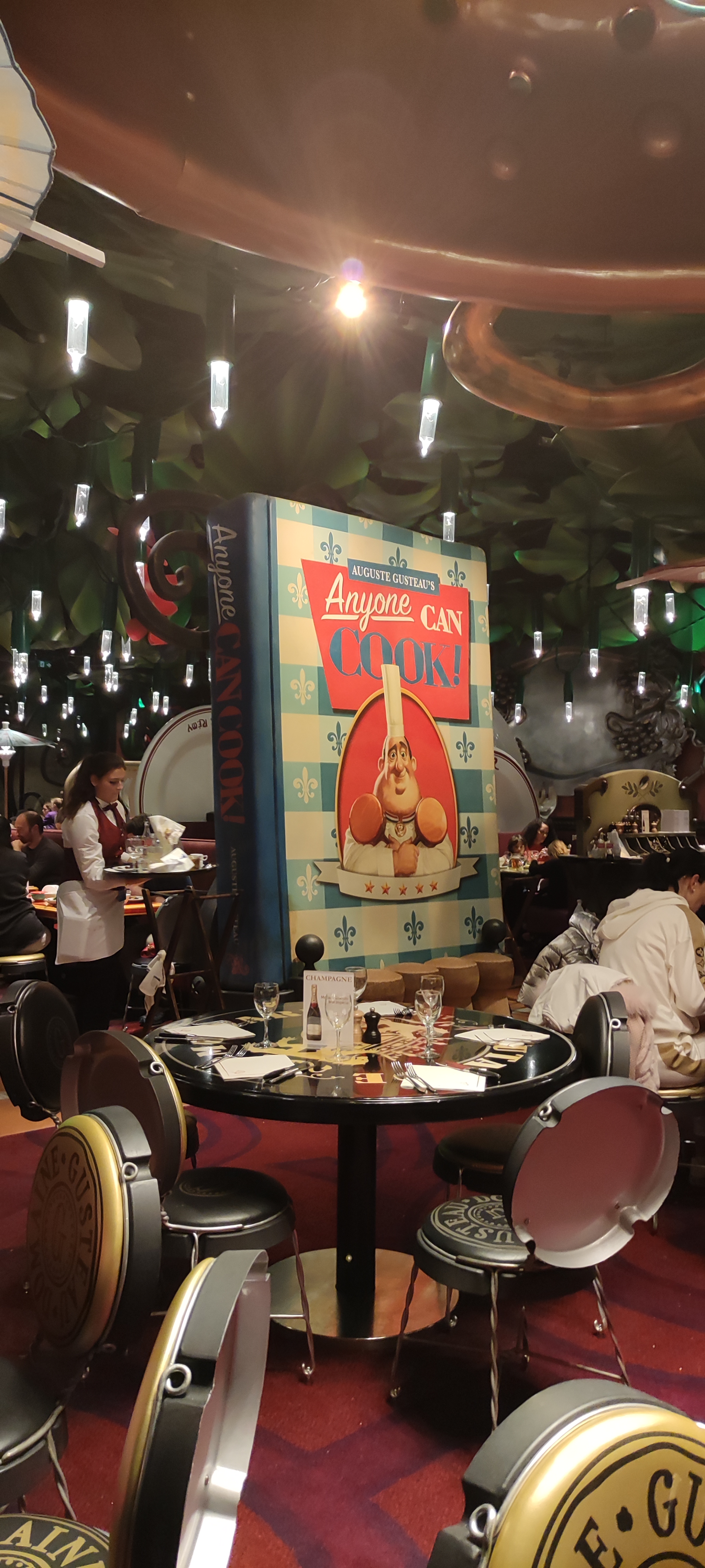 Le décors du restaurant est juste incroyable, ça reprend les codes de l'attraction Ratatouille. Le service est professionnel et sympathique. Les plats sont pas très travaillé mais c'est relativement normal car il ne faut pas oublié que nous ne sommes pas dans une vrai brasserie Parisienne. En revanche ça fait le jobs, on y mange bien et le sentiment final est plus que positif. Une belle expérience.