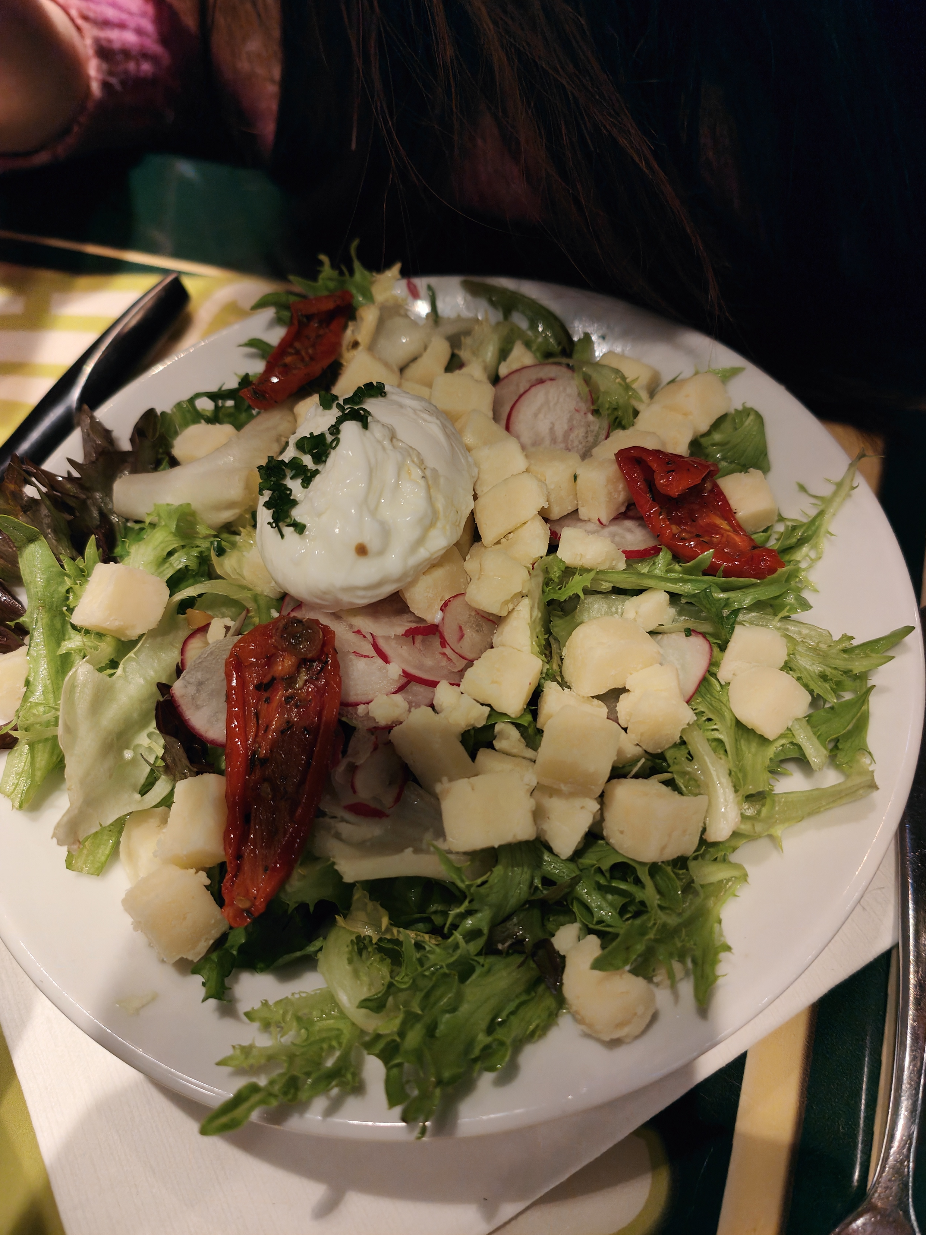 Le serveur était Emeline, très bon serveur. Elle a vraiment fait tout ce qu'elle pouvait pour que nous passions le meilleur moment possible. Ils ont vérifié à plusieurs reprises les préférences alimentaires et les allergies et ont expliqué ce qui était possible de manger et ce qui ne l'était pas. Salade végétalienne et ragoût de boulettes de viande. Parfait.