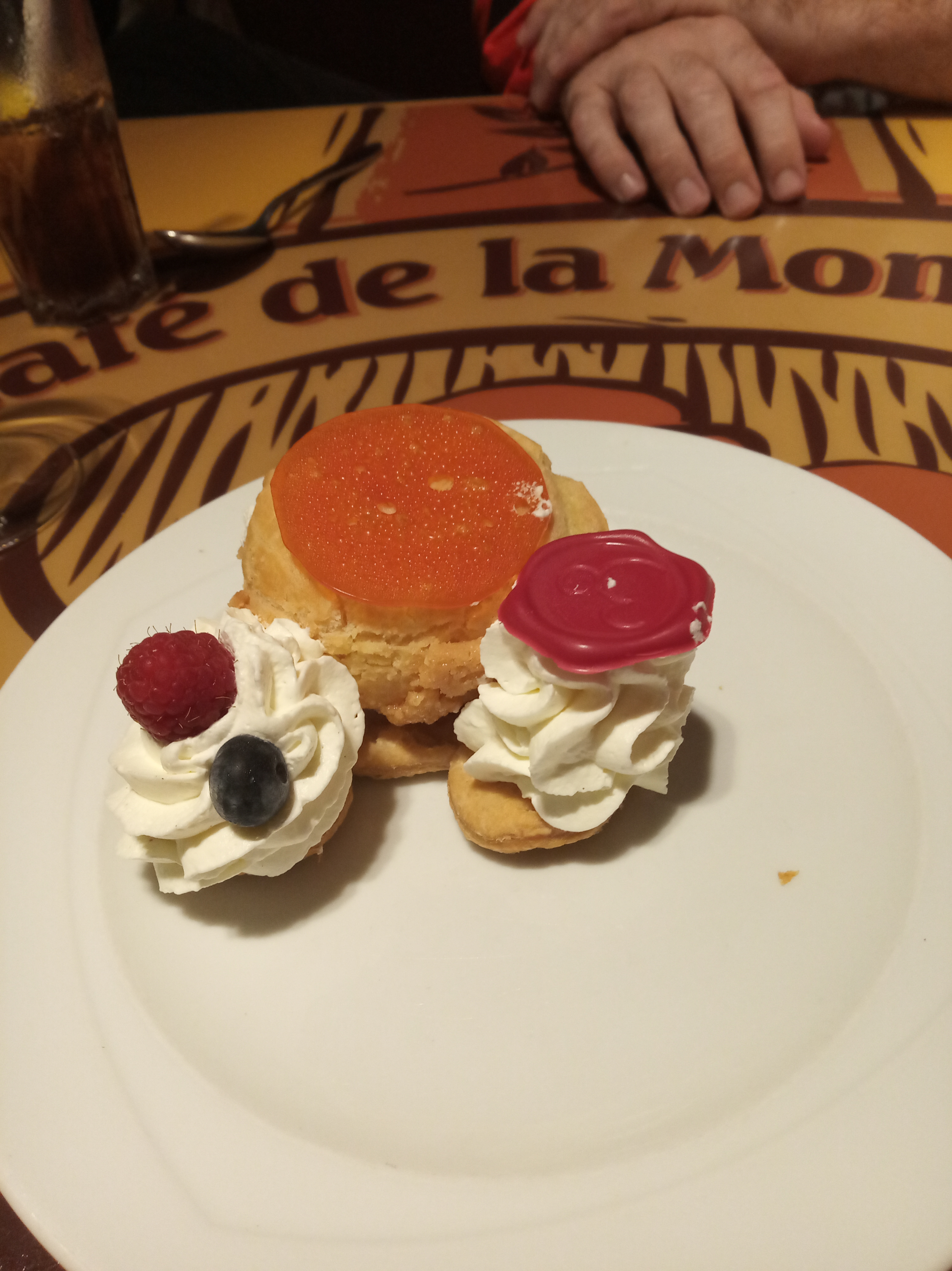 Nous avons fait plusieurs restaurants sur le parc, celui ci est bien à l'image qu'on se fait des restaurants français : personnel moins agréable, beaucoup plus d'attente dans le service... mais le décor reste plaisant et la cuisine, quoique simple est correcte. Dommage pour le dessert délice du bistrot : un biscuit lourd, avec une crème pâtissière trop cuite et compacte et un feuilleté étouffant, limite mangeable qui ne représente pas la finesse de la cuisine française. Dommage et décevant quand on pense qu'il représente le savoir faire et le savoir être de notre pays pour de nombreux visiteurs étrangers...