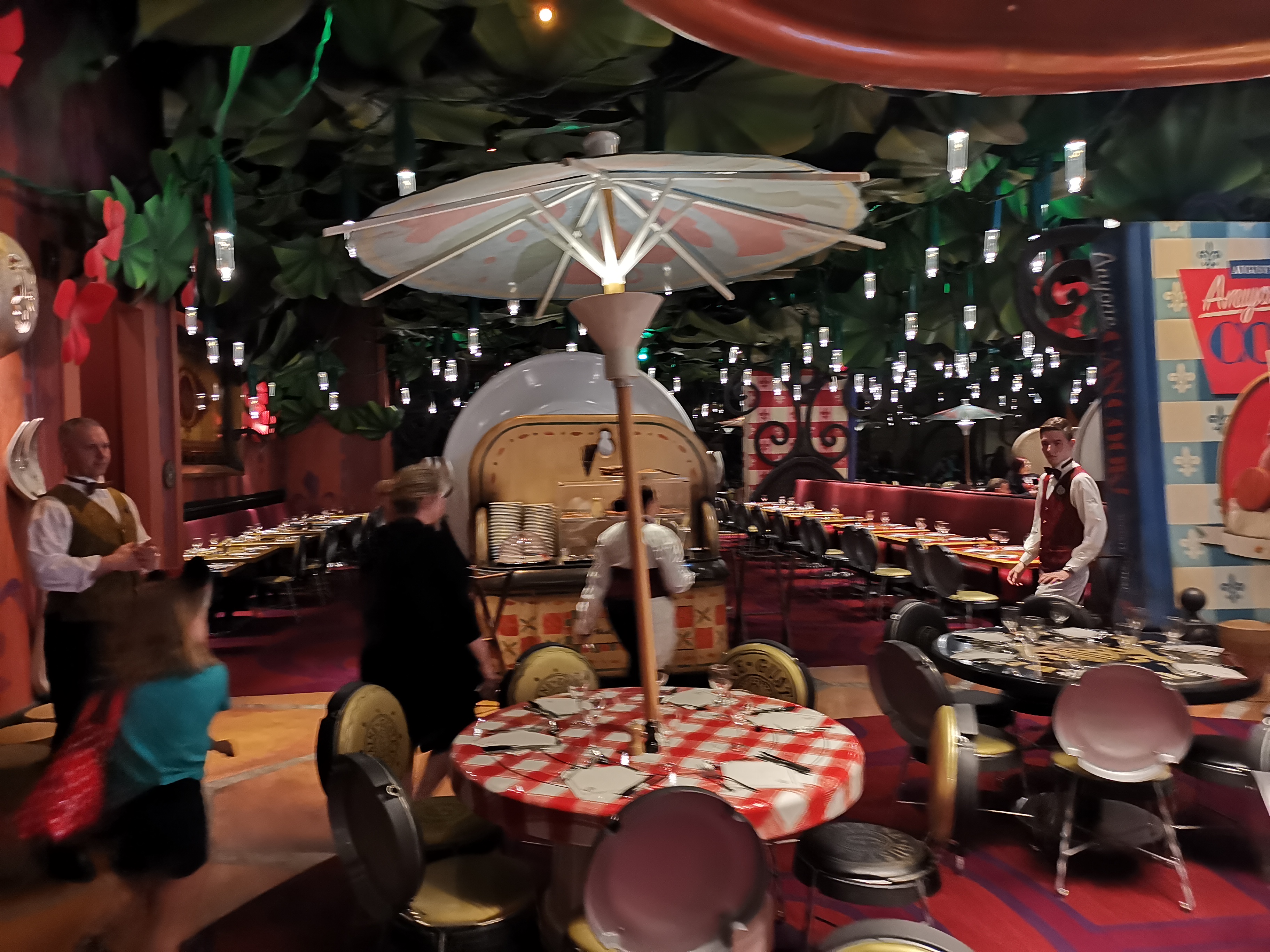 Probablement le meilleur restaurant des Parcs Disney. Le steak frites accompagné de ratatouille et le dessert tarte aux pommes m'ont presque fait croire que nous dînions dans un bistro du centre-ville de Paris. La nourriture était assez bonne. Le décor et l'ambiance sont superbes, faisant semblant d'être réduits à la taille de Rémy (les capsules de bouteilles sont des chaises, les fourchettes sont des cintres). Les enfants et les adultes apprécieront, mais notez le prix élevé.