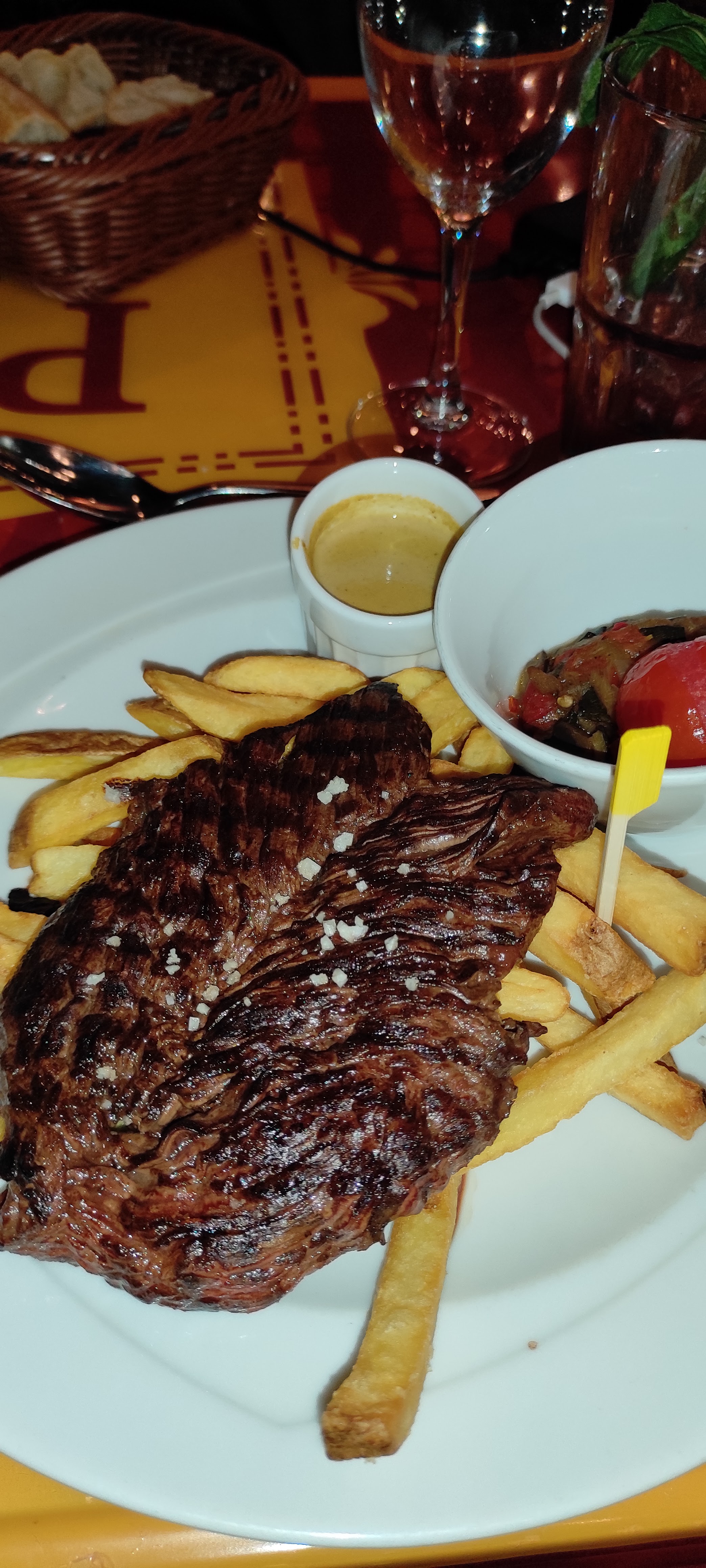 Super restaurant ! Depuis le temps que je rêve d'y aller c'est chose faite ! En entrée salade mélangée fromage tomates radis , c'était vraiment très bon , bonne quantité. En plat la pièce de bœuf avec des frites et de la ratatouille, la cuisson de la viande est respecté, la ratatouille et les frites sont bonnes . En dessert le délice du bistrot qui est vraiment très goûteux !! Très bon cela dit ! J'ai adoré ! Le cadre est vraiment très beau et la décoration est bien réussi ! Le seul bémol est que c'est un peu bruyant