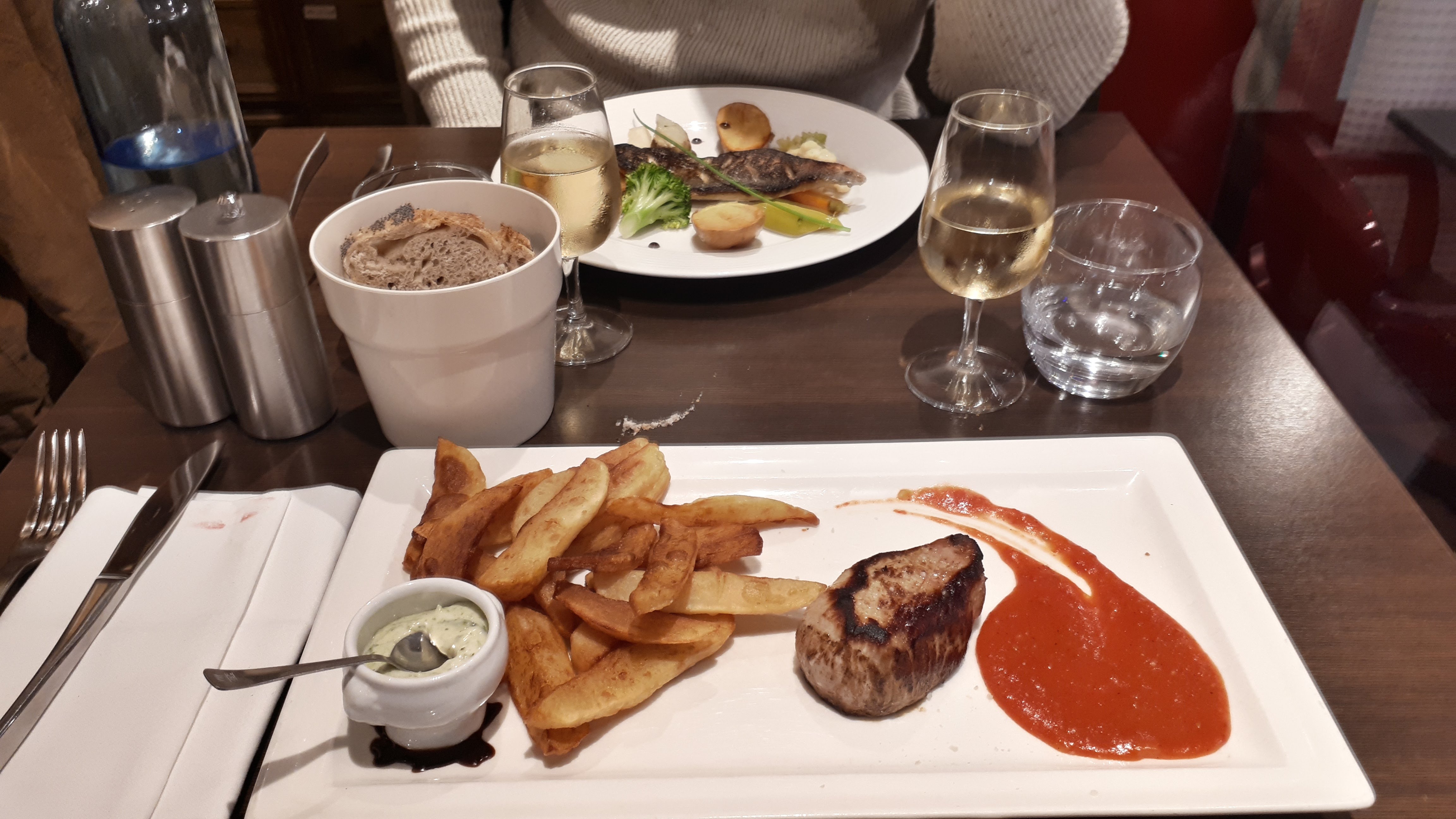 Malgré avoir spécifié au chef de rang que nous souhaitions prendre le temps de déguster nos huitres planche de cecina avant de faire marcher la suite, les plats nous ont été servi au milieu des entrées non finies, avec comme explication que c'était de la faute de la cuisine qui avait décidé elle même d'envoyer les plats. Le poisson et garniture étaient froides, nous avons demandé la carte des vins en attendant que les plats reviennent, elle n'est jamais venue nous avons donc dû fixer notre amie, manger seule son tartare de bœuf. C'est très dommage
