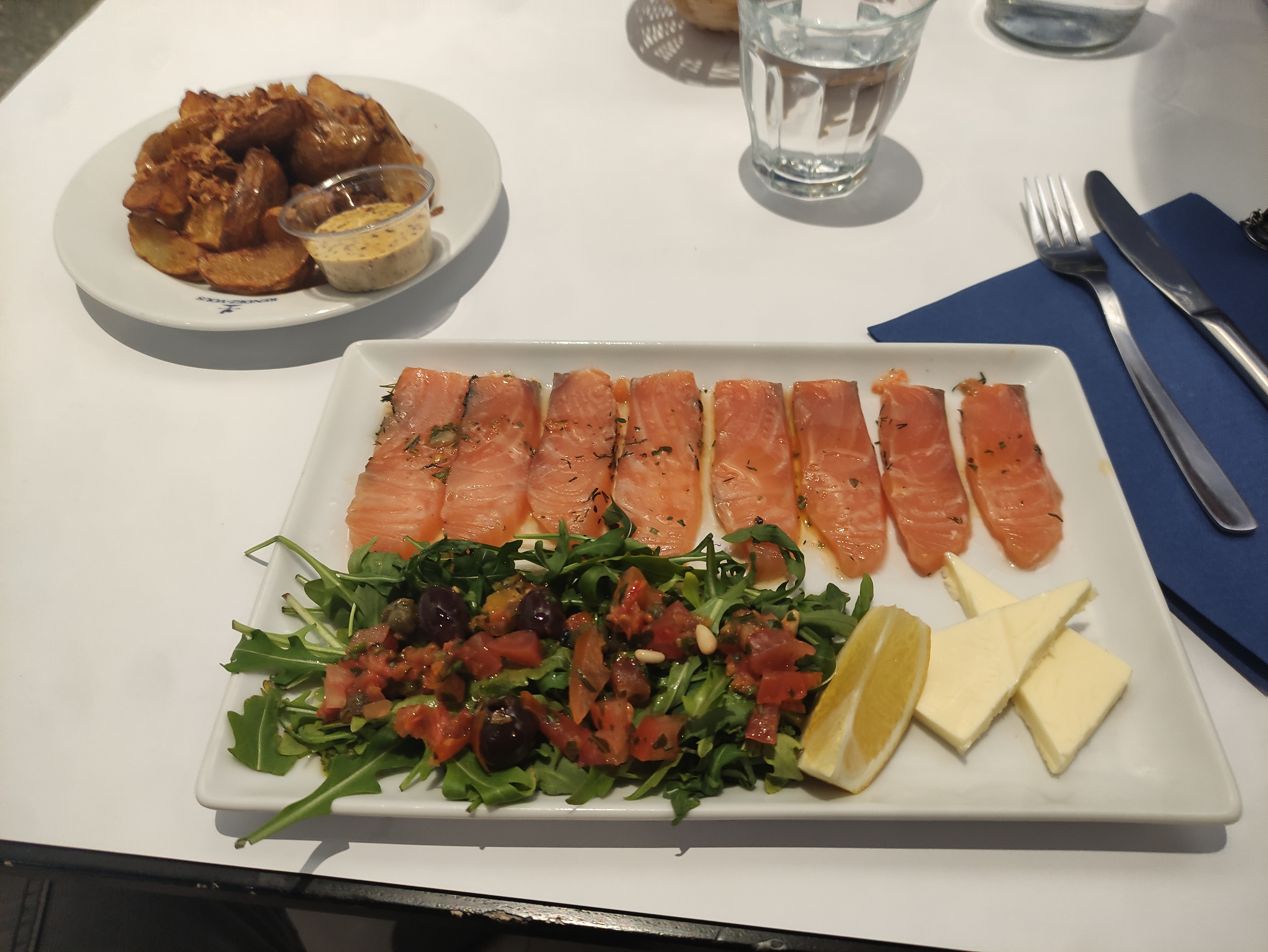 Tartare de saumon bon et copieux, brioche pain perdu sauce caramel beurre salé delicieuse. En revanche salle bruyante, table vers la cuisine donc beaucoup de passage et il faisait un peu froid dans la salle. Autrement serveuse très agréable.