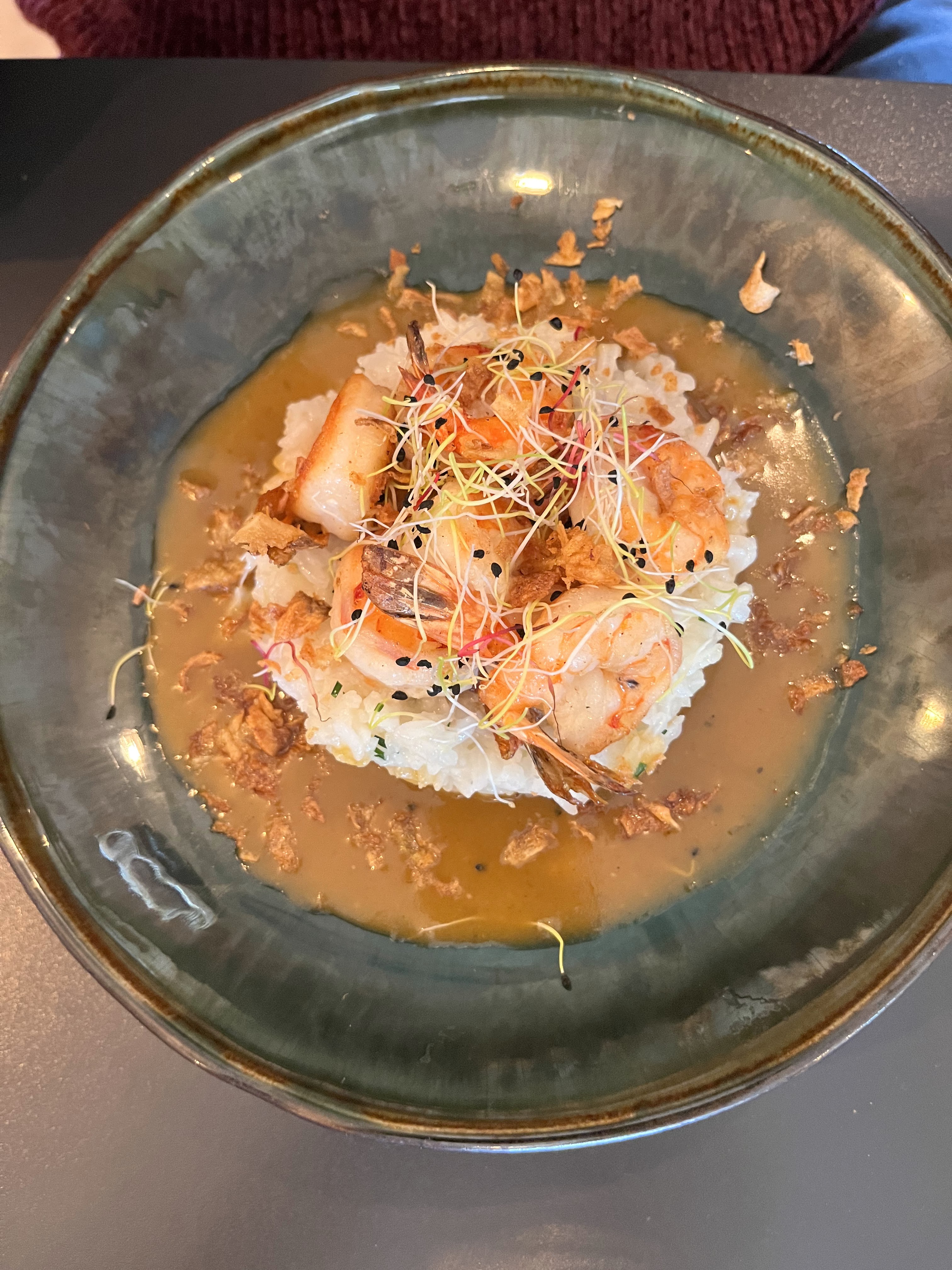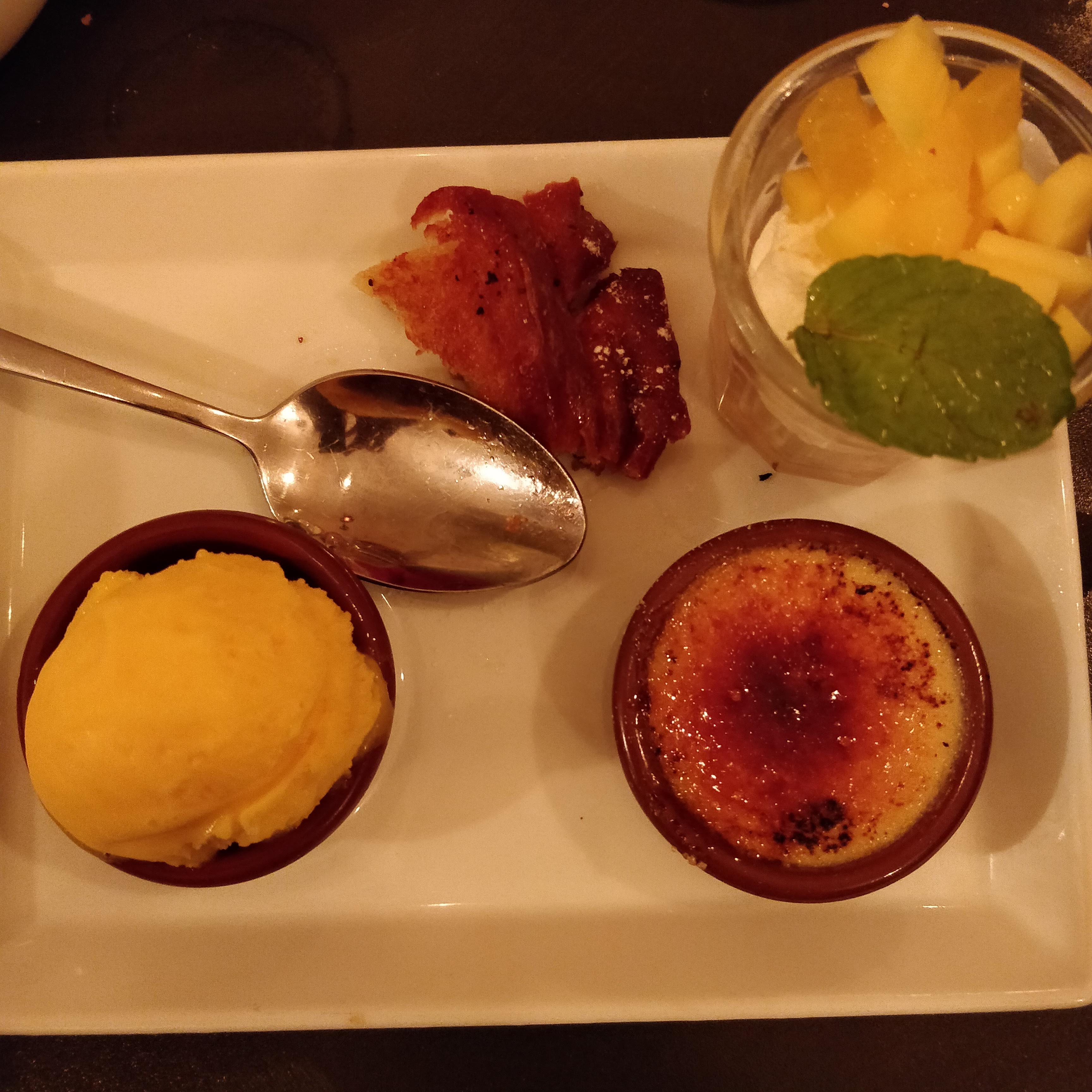 Les plats sont bien construit et bien gouteux et savoureux. Le tartare a la thaï manquait un peu d'assaisonnement, mais la viande etait top. Gambas au risotto magnifiques. Crème brûlée au miel et romarin, tres bien dosée en gout.