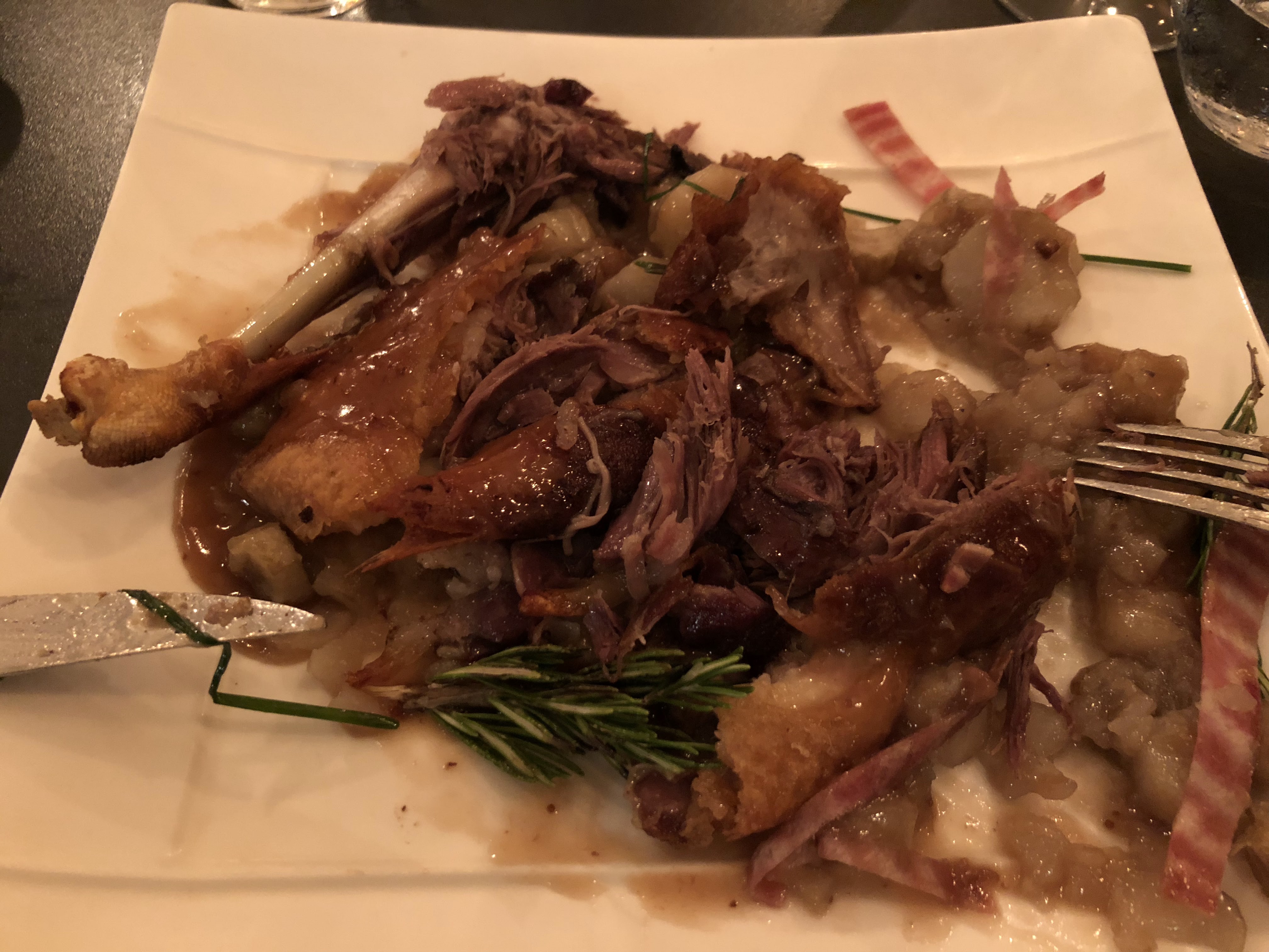 Déjà un peu déçus par la carte, car quand on sort au restaurant un samedi soir, on espère trouver autre chose qu'un hamburger, une bavette grillée ou un confit de canard que l'on trouve dans toutes les brasseries parisiennes (sinon, il y avait 1 poisson et 2 plats avec supplément). Cela dit, la bavette et le confit étaient tout à fait corrects. Tataki de boeuf sur salade de chou-rouge et blanc à éviter (trop de nerfs, pour un tataki il faut une viande impeccable) Le vin choisi était cher mais bon, les desserts étaient plutôt réussis et beaucoup plus créatifs que le reste. On venait de Rueil pour tester ce restaurant, mais ça ne valait pas le déplacement, malgré la jolie déco de Noël.