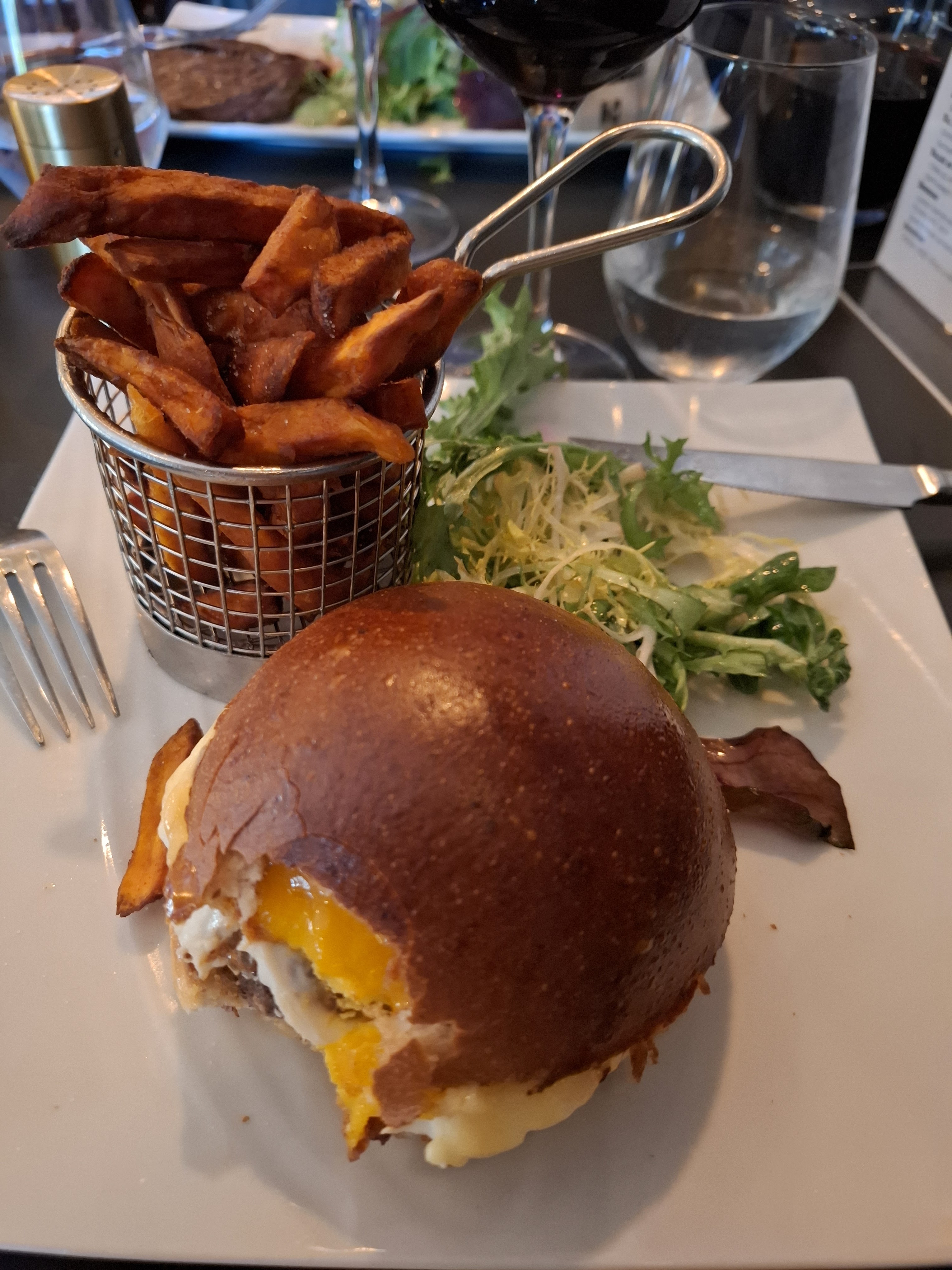 Accueil chaleureux ! Service de qualité, très attentif au bon déroulement du dîner ! Dîner avec petits enfants, plat, dessert ! Burgers très très bon, frites patates douces bien cc uites, choucroute de la mer goûteuse, bien garnie, bavette boeuf Angus, provenance Royaume-Uni, dommage ! Frites croustillantes ! Les desserts : brioche façon pain perdu, très bonne, part trop petite pour moi, gâteau moelleux chocolat, top, poire délicieuse ! Qualité prix correct quoique toujours un peu cher Mérite de revenir un midi en été pour tester la terrasse !