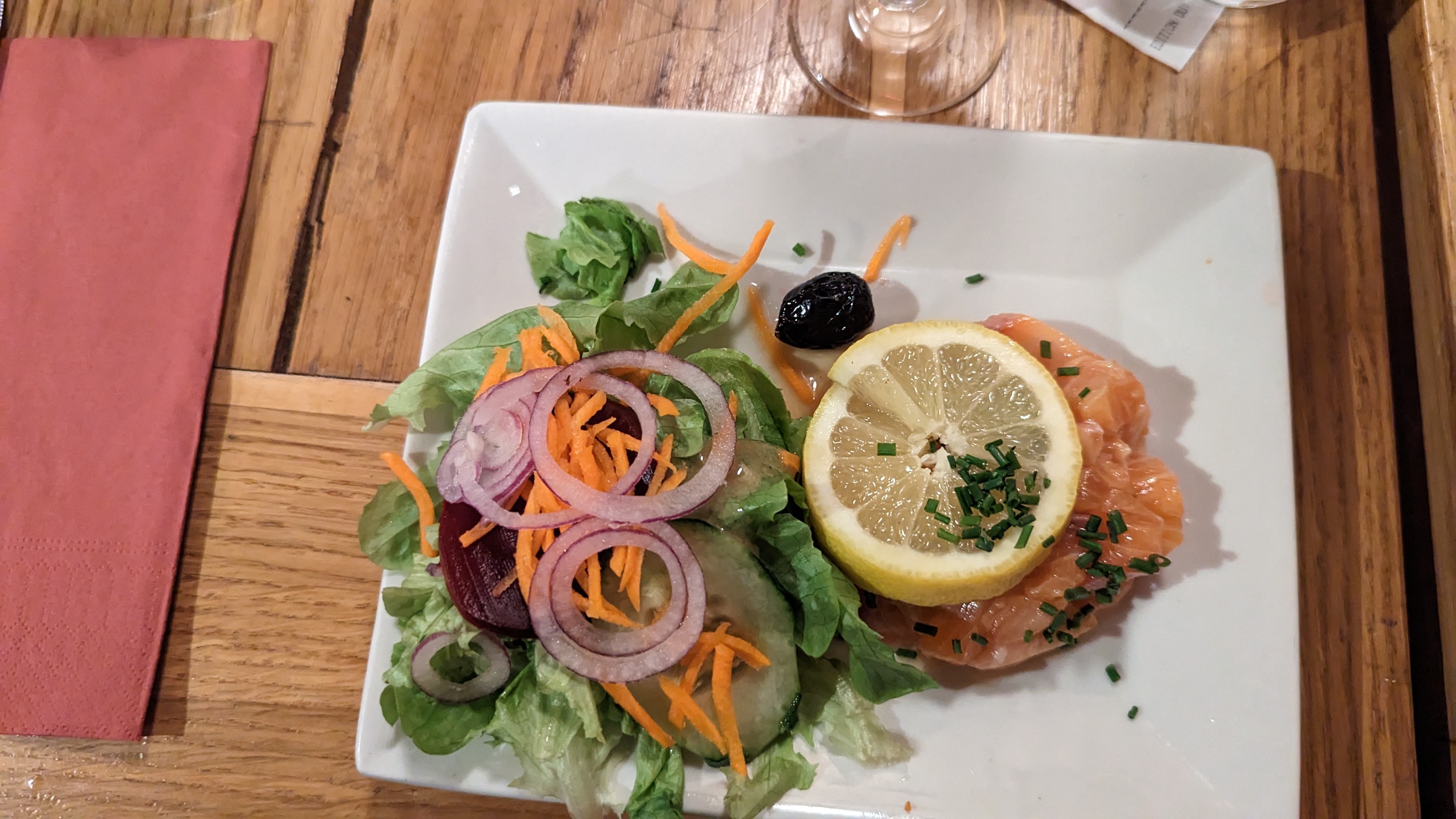 Malheureusement le vin rouge était glacé, la salade „végétale“ avec beaucoup de lard sans indication sur le menu et les plats sont arrivés en vagues… dommage