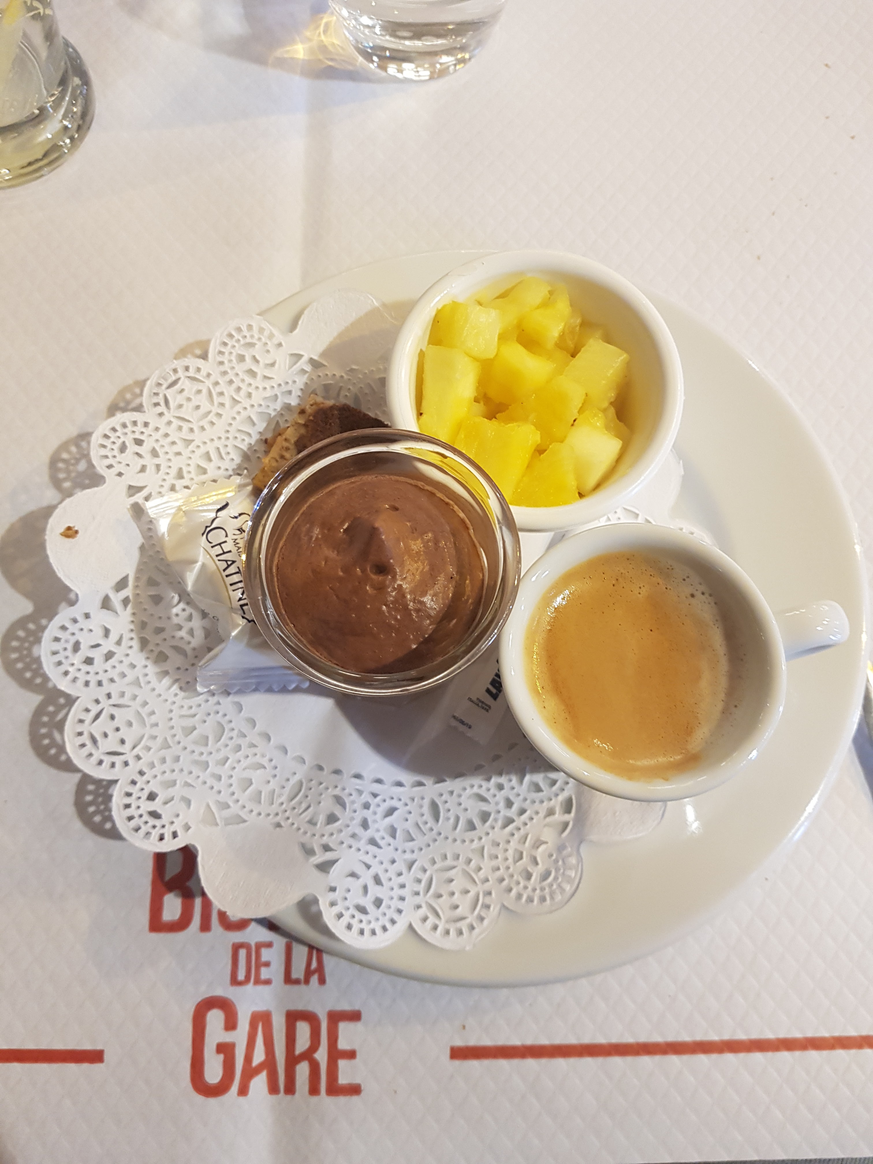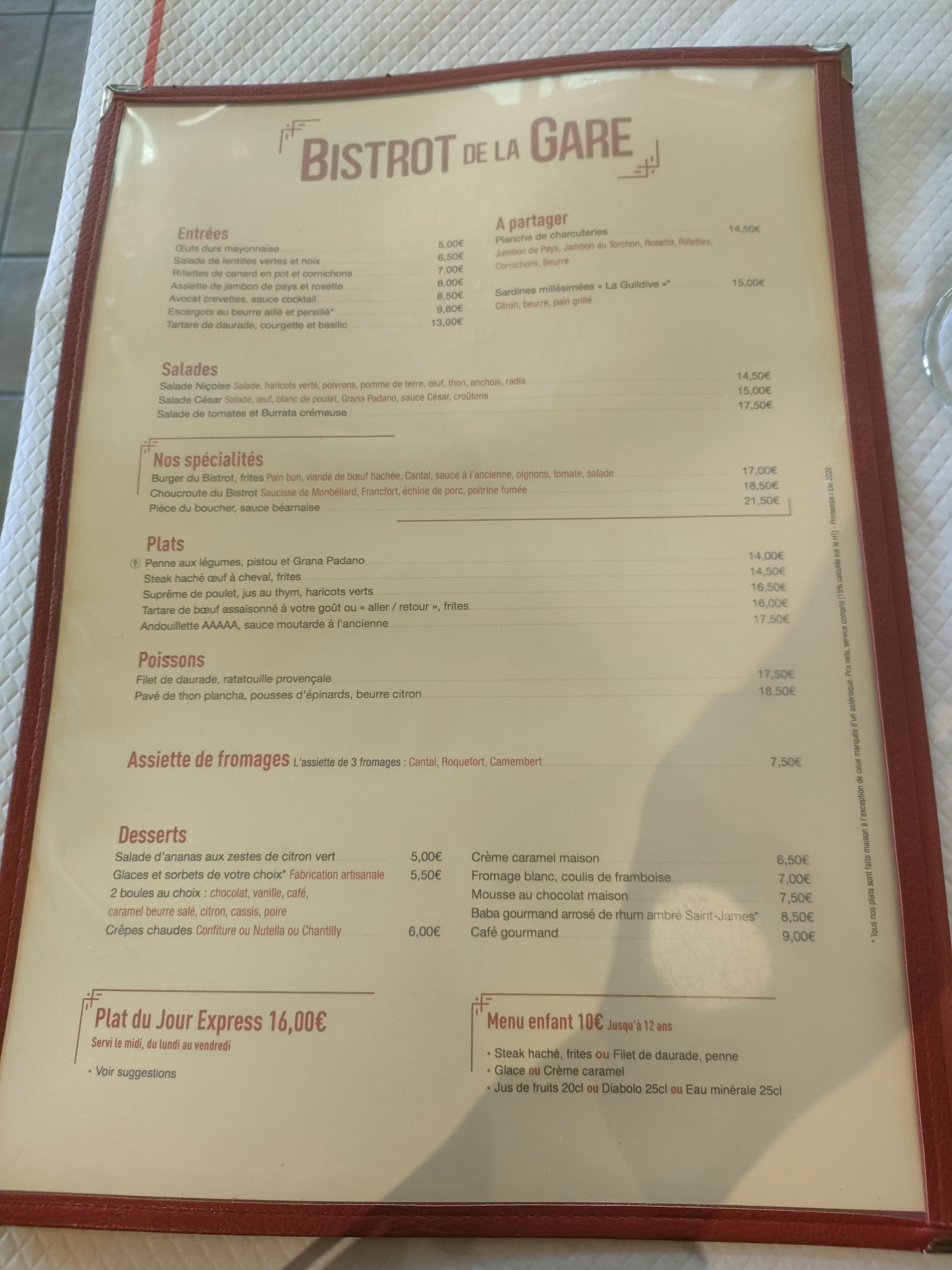 En attendant notre train, nous sommes allés au bistrot de la Gare. Bonne cuisine pour un prix vraiment raisonnable. Serveurs très sympathiques, mention spéciale à Nath et Louis qui sont exceptionnels. Très souriants, enthousiastes, réactifs et toujours au petit soin du client. Quant au lieu, il est rempli de charme avec beaucoup d'authenticité : moulures apparentes, escalier en bois sur mesure, tissus rouge carmin ! Marine Caro architecte