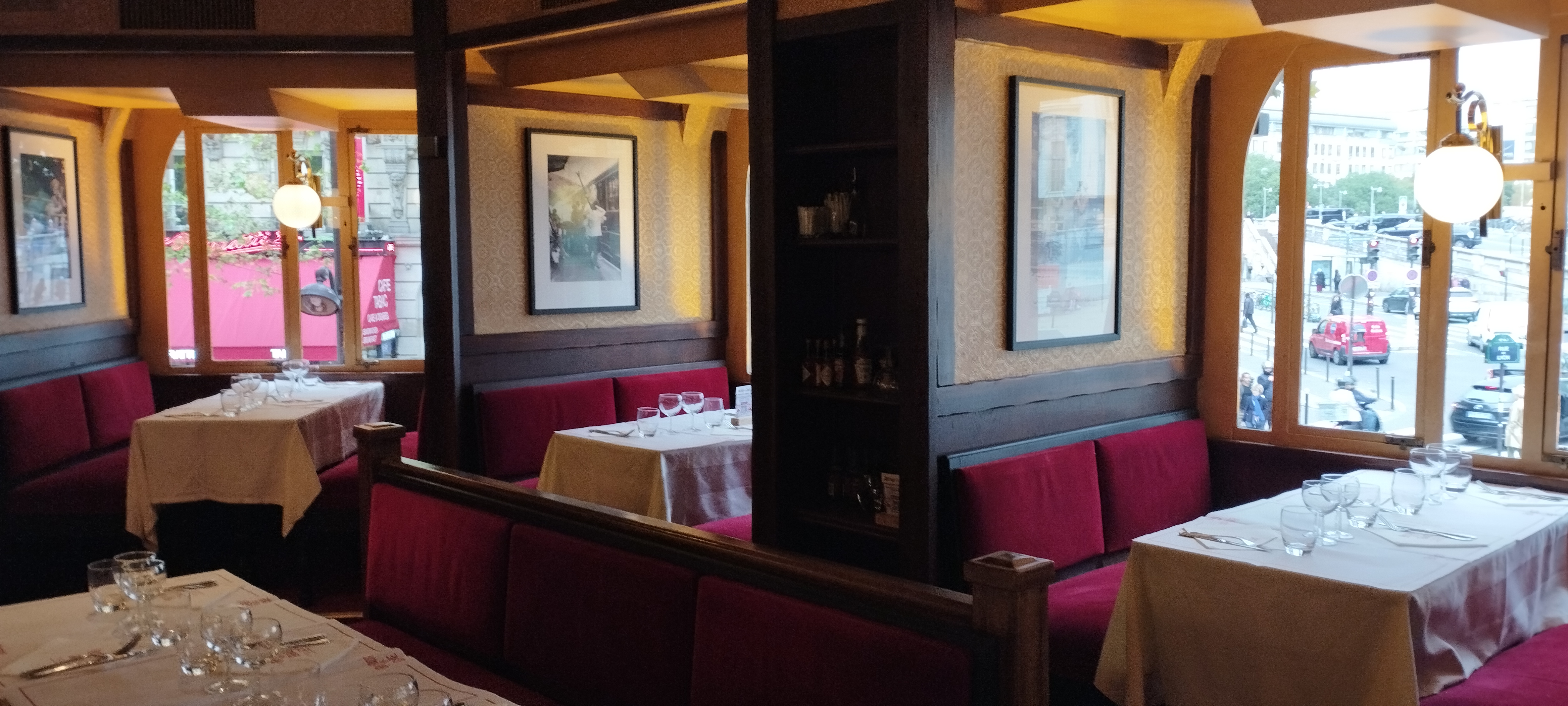 Etablissement très sympathique, situé en face de la Gare de Lyon. J'aime beaucoup ce décor style 1900, avec la banquette rouge, les couleurs boisées et les grosses boules blanches (lampadaires). C'est plus une brasserie qu'un bistrot, car l'etablissement peut accueillir jusqu'à 300 couverts le midi! Une mezzanine de quelques tables en entresol et une vaste salle à l'étage avec des box plus intimistes. A noter, les chefs de rang sont en chemises blanches, pantalon et tablier noir, ce qui donne un style certain à l'établissement. C'est déjà une invitation au voyage...