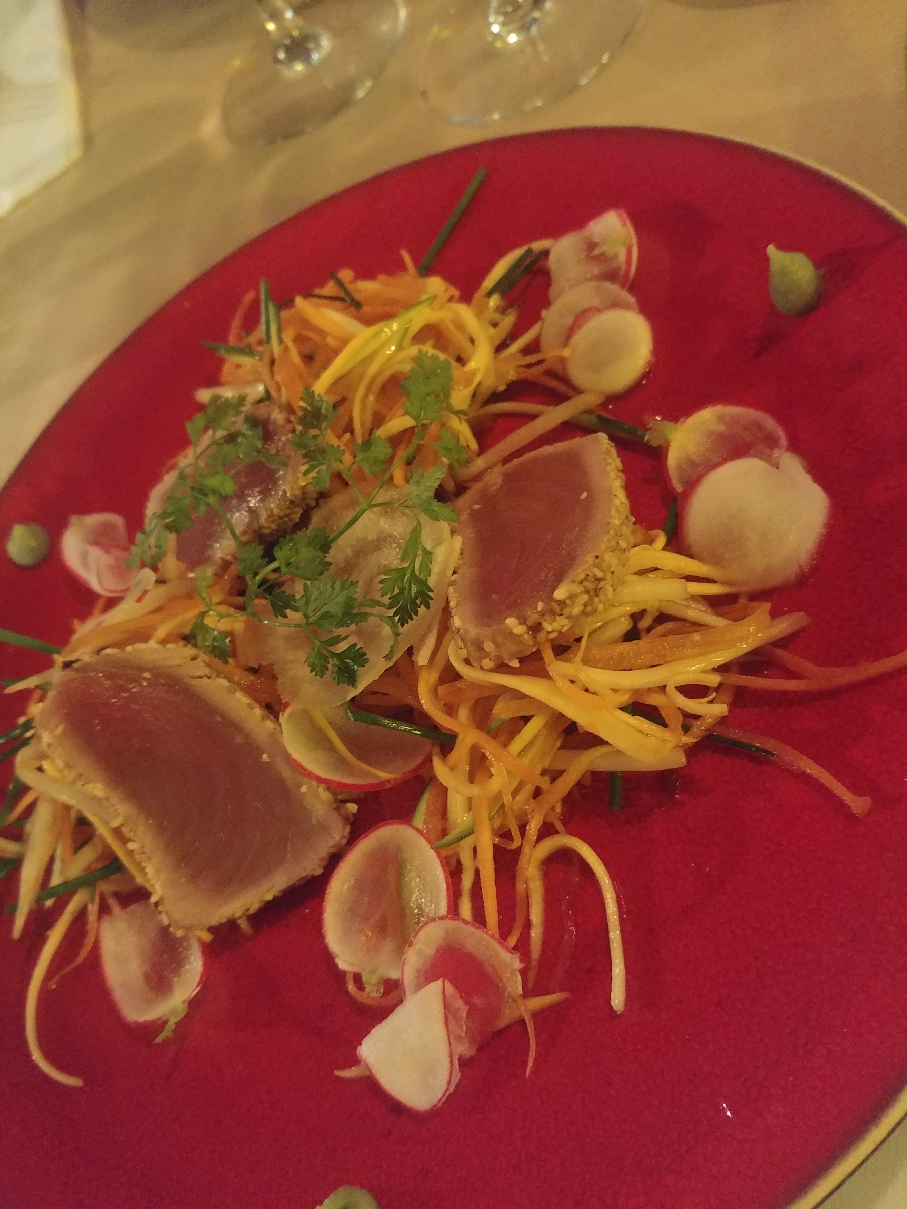 Restaurant en couple. Ce restaurant est ce qu'on appelle un restaurant touristique, donc horaires larges, déco tendance (donc du faux naturel) mais aussi plats à la qualité et aux saveurs décevantes!! et, du coup, prix élevés pour la qualité de ce qui est dans l'assiette! Le thon en entrée était fade et le plat, au visuel coloré, l'était malheureusement tout autant... Nous sommes vraiment déçus de ne pas avoir mieux choisi le restaurant !