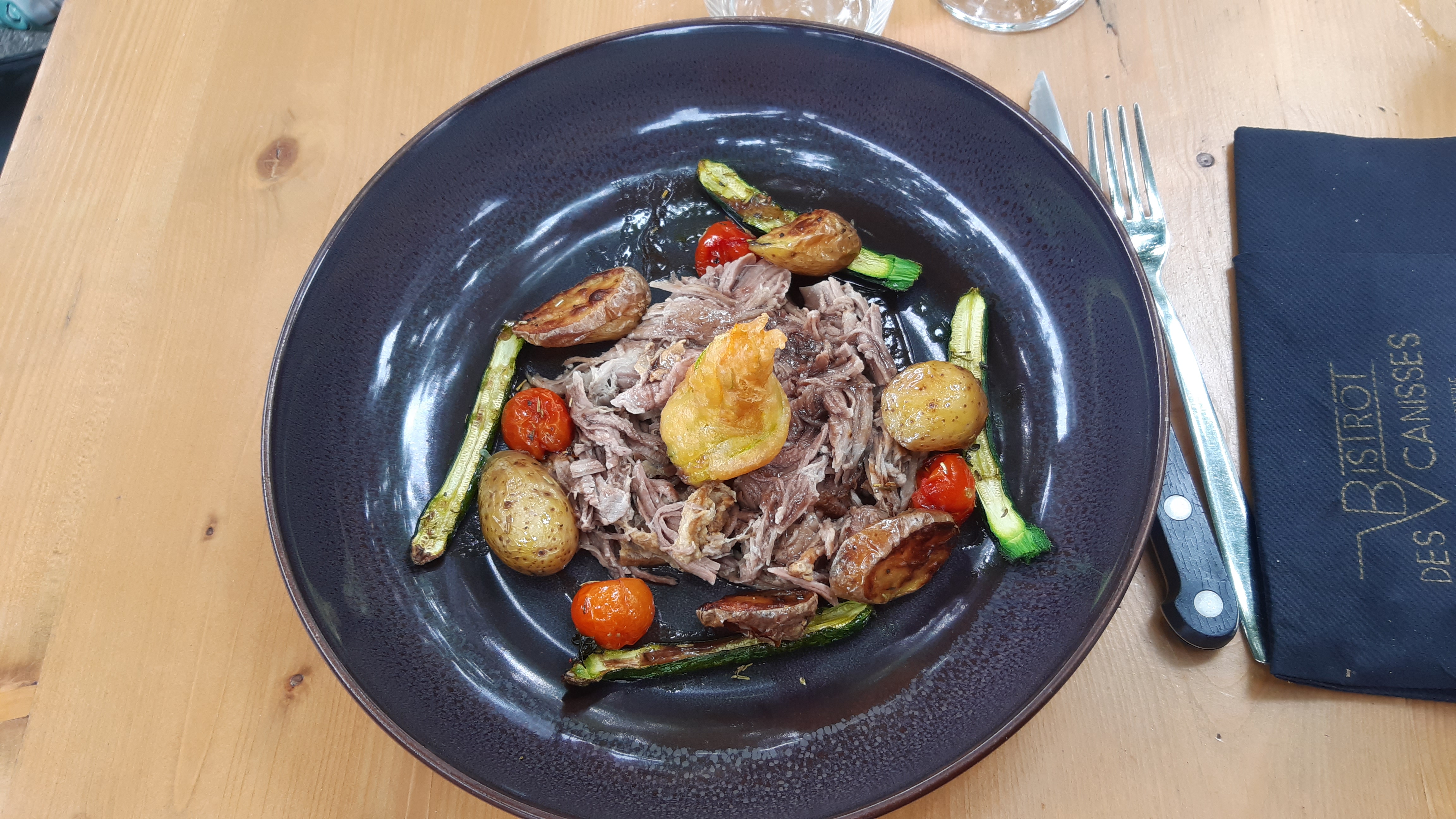 Un jour entre Noël et nouvel an, après une randonnée, nous improvisons un restaurant. Malheureusement beaucoup de restaurant aux alentours étaient complets ou fermés. Par chance, nous tombons sur le Bistrot des Canisses avec une vingtaine de minutes d'attente. On nous installe sur une table haute et nous avons à boire très rapidement, une très bonne bière pression Castor (4,50€), attention tout de même quand le verre est gradué à respecter les 25 CL et pas moins, ça se voit... Le lieu est convivial, on s'y sent bien, joliment décoré. L'attente ne se fit pas ressentir, et notre hamburger fut servi, à défaut du magret de canard qu'il n'y avait plus. Les frites sont faites maison et généreusement servies, très bonne mais beaucoup trop salées par contre. Le burger est très bon, le pain moelleux, la fourme d'Ambert est goûtue, la patate douce ajoute une note sympa. Gros bémol sur le steak haché demandé saignant mais beaucoup trop cuit, ça a tout gâché. Au prix du burger à 24 euros quand même (18 le magret !). Déçue. Enfin, le verre de vin rouge à 3 euros était bon. Pour conclure, un endroit sympa, mais plus pour boire une verre que pour y manger.