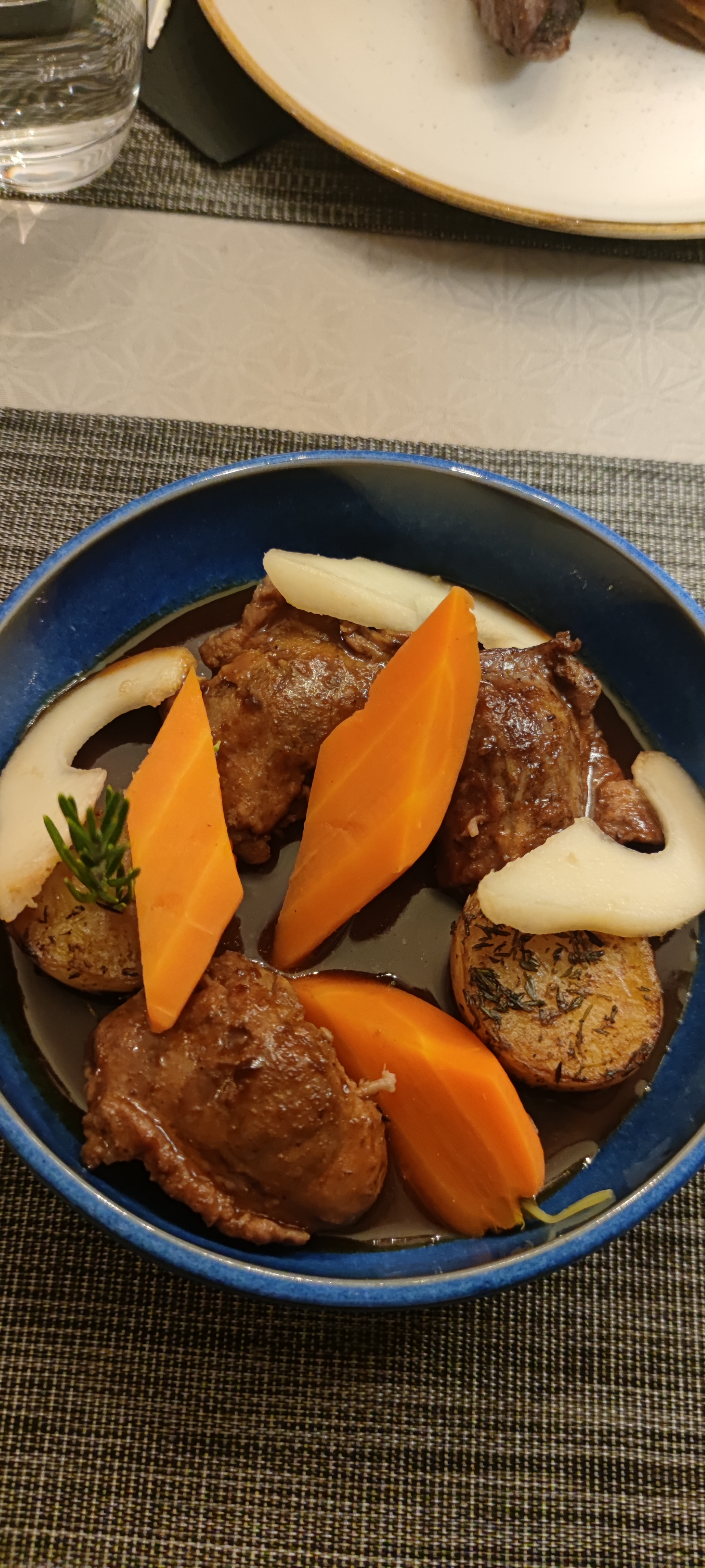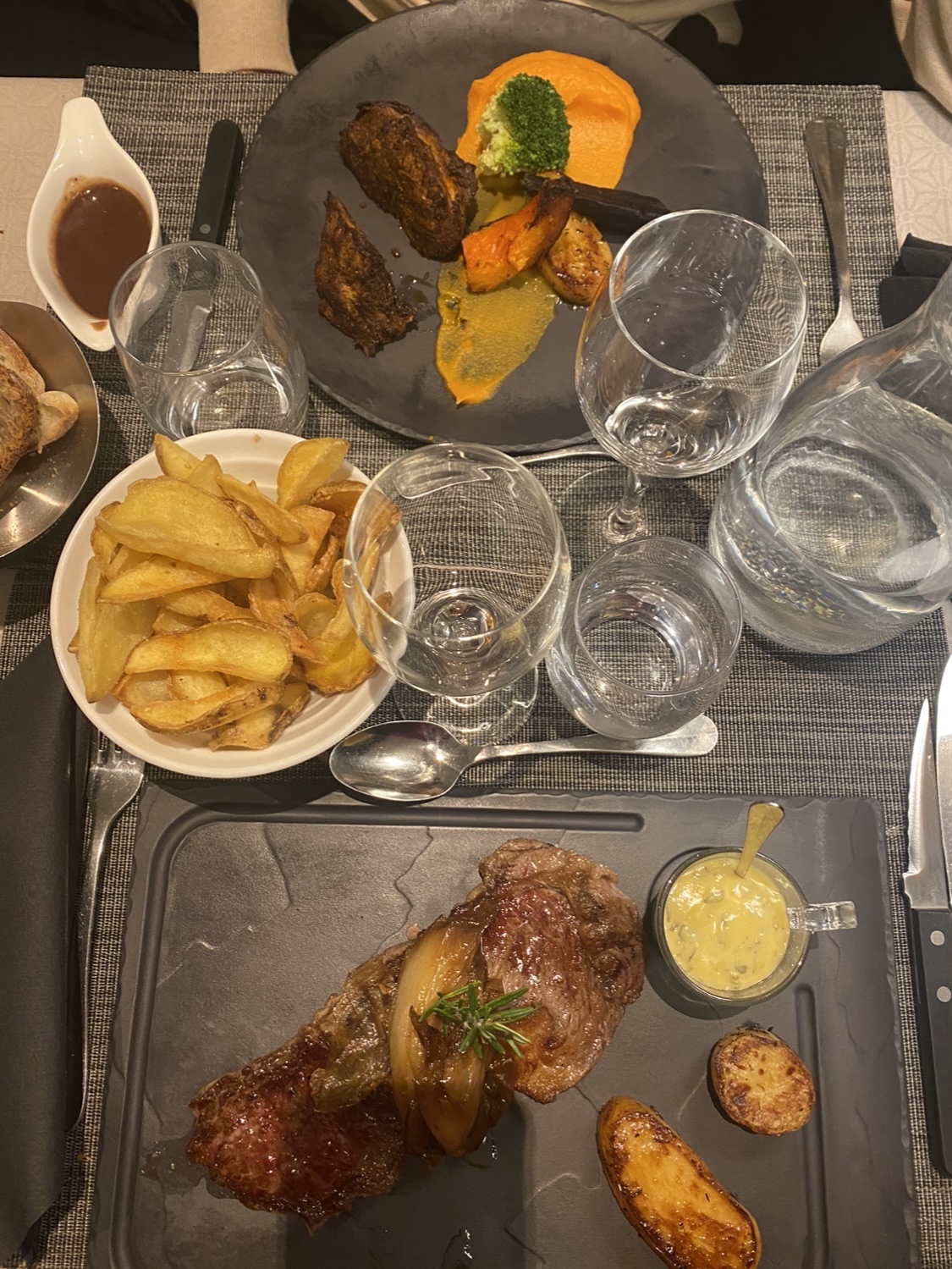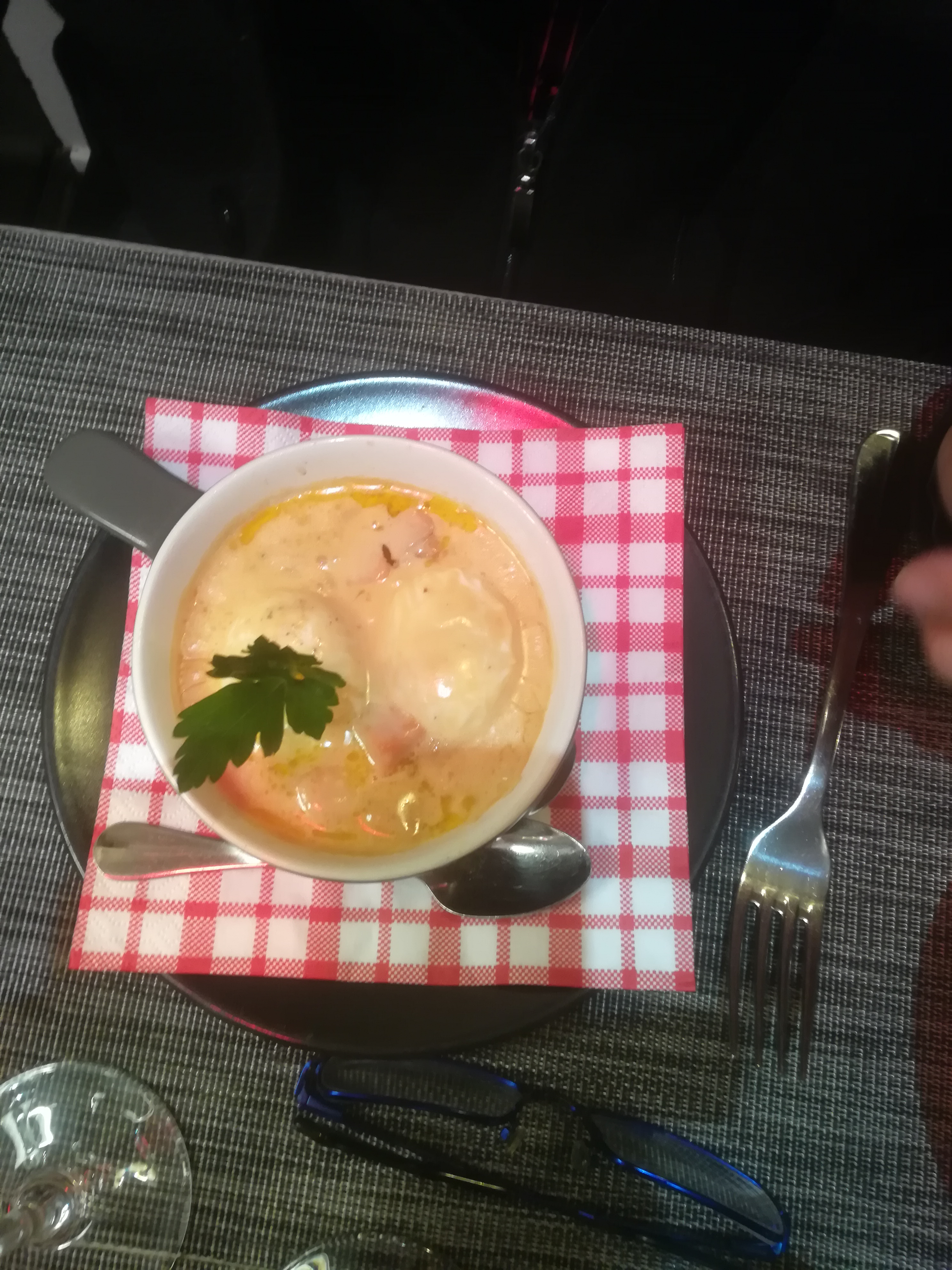 Soirée très sympa en amoureux au Bistrot des Ducs. Apéro avec un punch maison du pain et un ramequin de crème aux herbes Entrée, escargots pour mon conjoint et gravlax de saumon pour moi. Plat, une dorade légumes de saison avec beurre blanc et un suprême de poulet légumes de saison avec sauce à l'ail noir. Quel dommage tout est très bon et généreux et nous somme surpris de voir un bol de frites à partager en plus (nous aurions préféré le savoir avant et l'enlever de la commande pour éviter un gâchis alimentaire... nous n'avions plus faim et nous en avons donc laissé) Dessert, une dame blanche et une nage de fruits exotiques. Le repas était bon et très bien assaisonné. Le personnel agréable et attentionné.