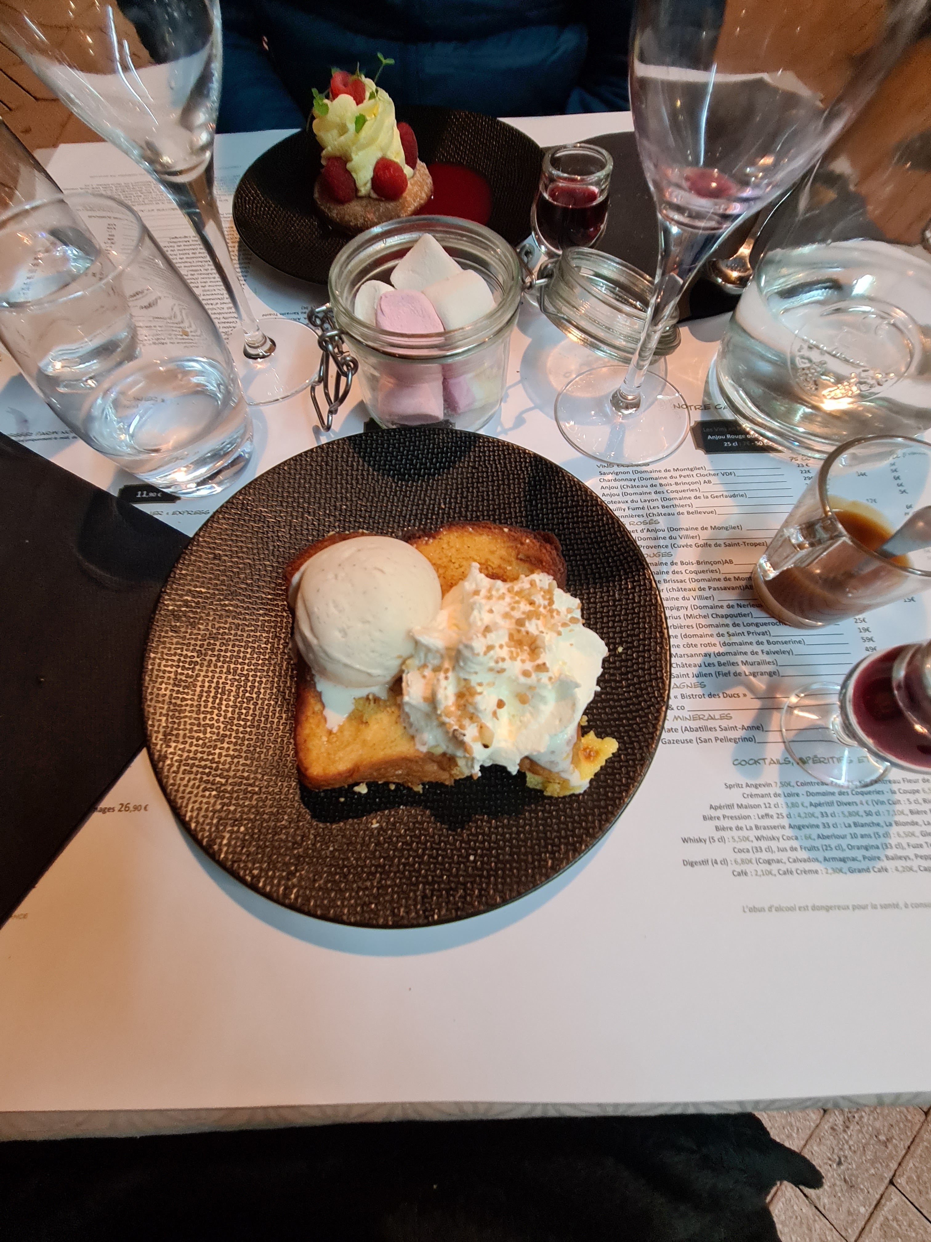 Quelle belle soirée passée dans ce restaurant : installée sur la terrasse du 1er étage, un filet de truite cuit à la perfection, un sublime vacherin, un bon vin blanc d’Anjou et surtout toute une équipe professionnelle et attentionnée Le tout pour 32 euros ! Bravo et merci