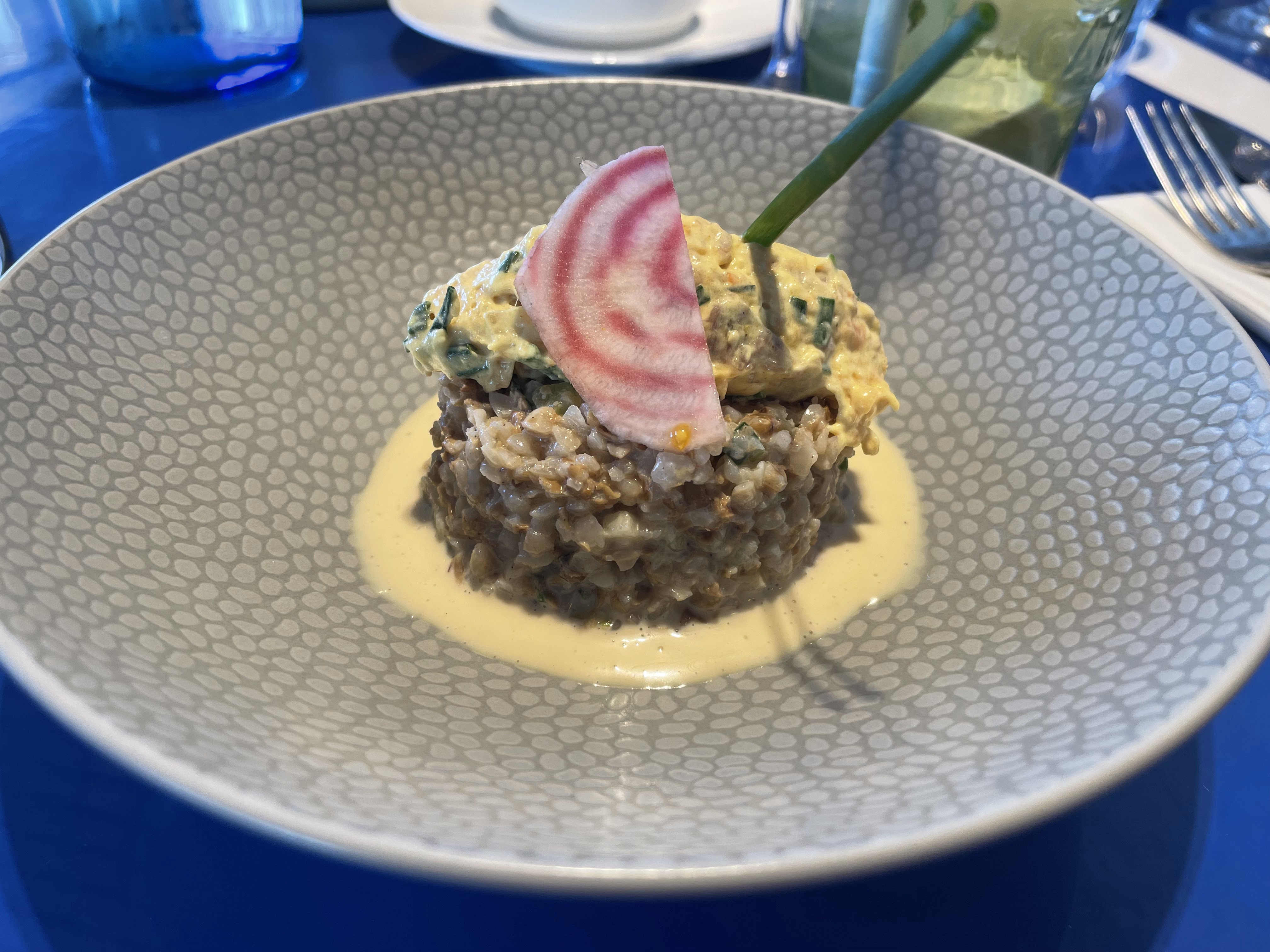 Soirée de Saint Valentin… Risqué ? Et bien pas du tout ! Vous prenez un Chef de rang aguerri accompagné d’une jeune femme et d’un jeune homme adorables et cela donne un accueil super gentil et attentionné . En entrée pour ma valentine : perle de wakame avec croustillant de sardines (un vrai délice) et pour moi huîtres de chez Cariou à l’île Trudy : parfaites. Ensuite lieu jaune ferme et suave à souhait avec risotto : délicieux. Le tout accompagné d’une flûte de champagne (Saint Valentin oblige ) et d’7n côte du Roussillon blanc à la fois fleuri et fruité à moins de 25 euros. Bref, une très bonne soirée pour un très beau lieu. Nous étions sur une table haute avec vue sur le port de sainte Marine… que demander de plus. À renouveler !
