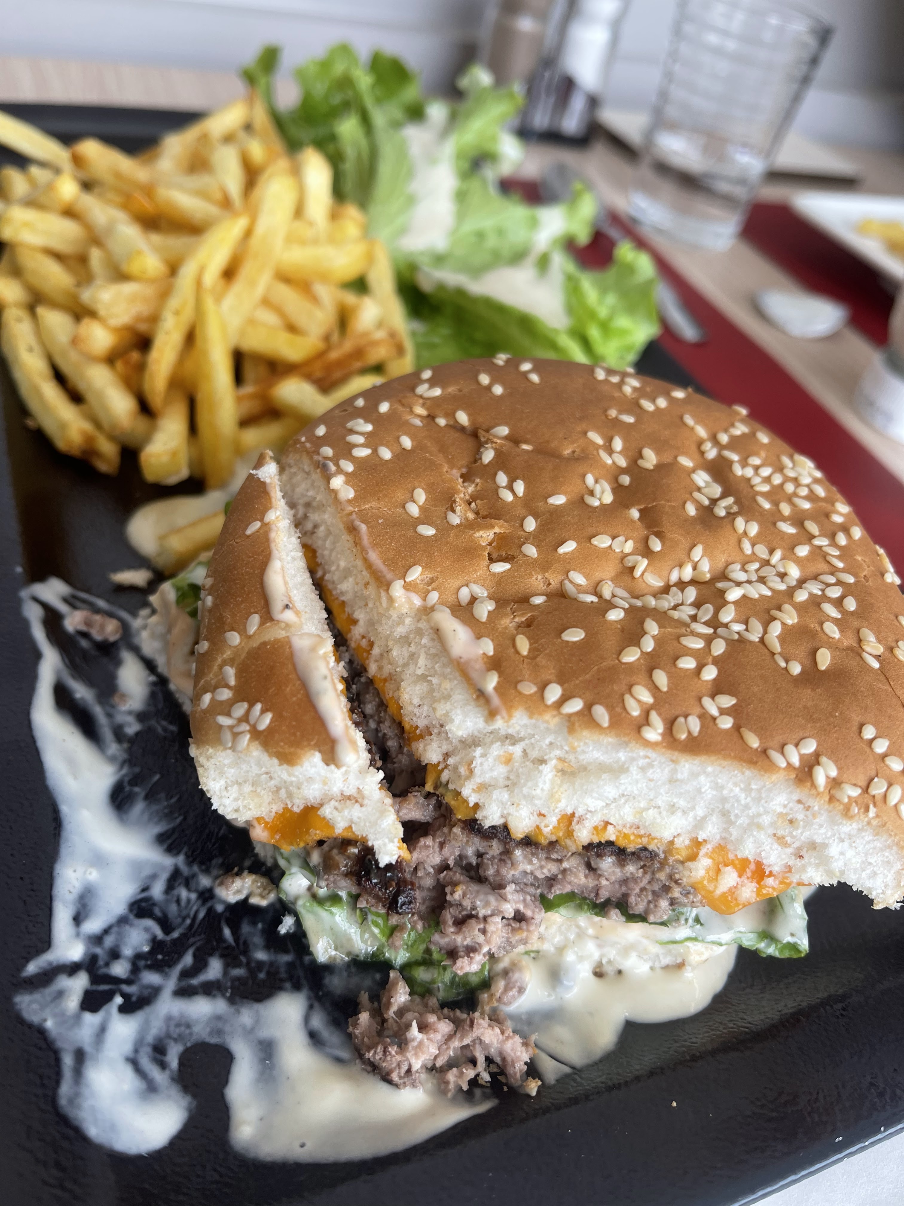 Hormis le pain à burger qui est industriel (alors qu’il y a la boulangerie à côté), idem pour les frites surgelées (mais ce ne sont pas les seuls), la viande à point qui était trop cuite par endroit, le repas était bon. La sauce fromagère du burger légère et en quantité suffisante, tout comme les frites. La salade ne baignait pas dans la sauce. La mousse au chocolat ferme et bonne, le tiramisu aérien. Rien à dire ! L’accueil n’est pas très souriant mais reste toutefois correct.
