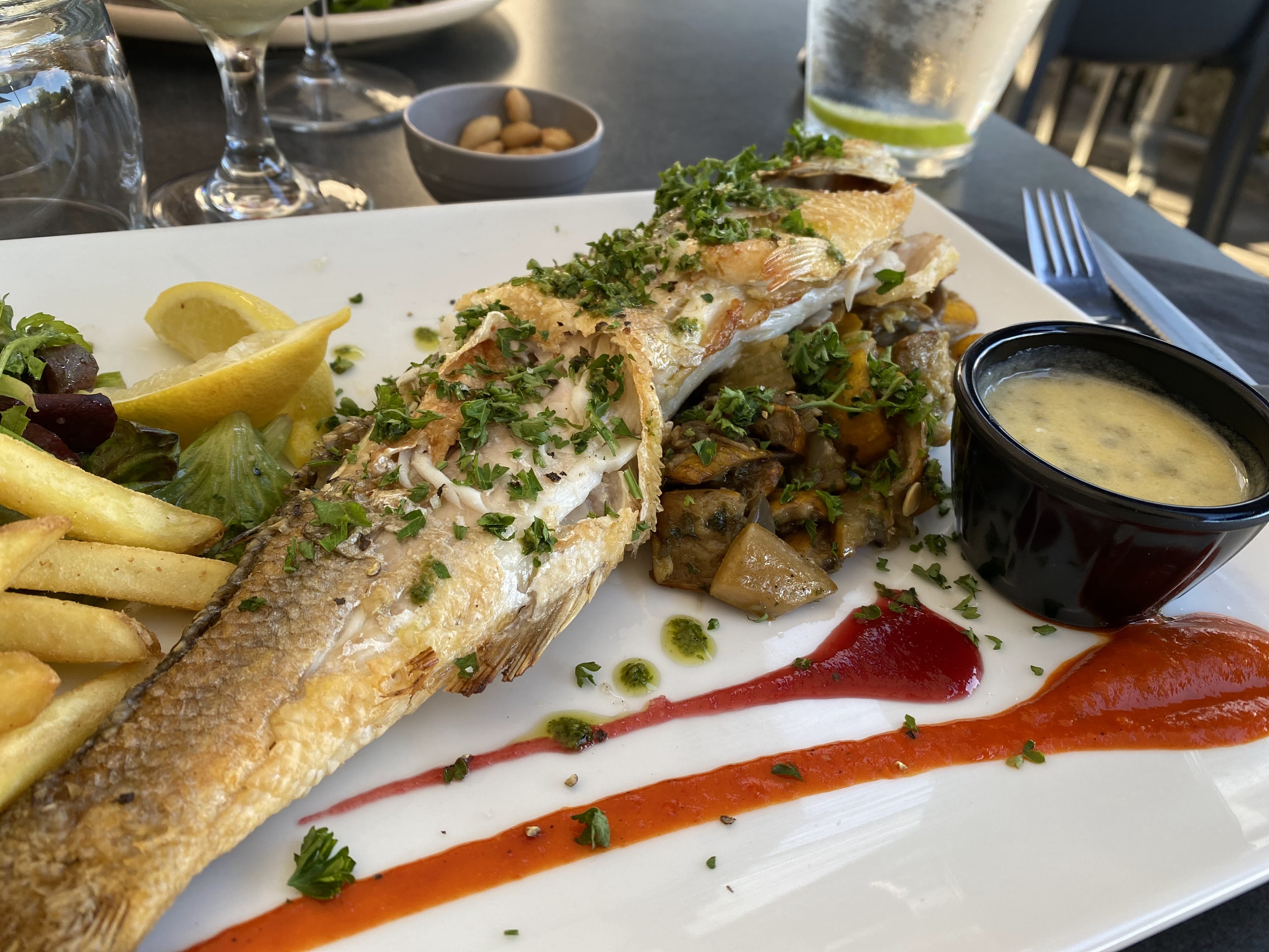 Un très agréable moment, une équipe active et attentive à sa clientèle, une terrasse ombragée, des planches variées (terre et mer) des plats très tentants, le tout à un prix très raisonnable, (pensez à réserver) merci pour ce bon moment.