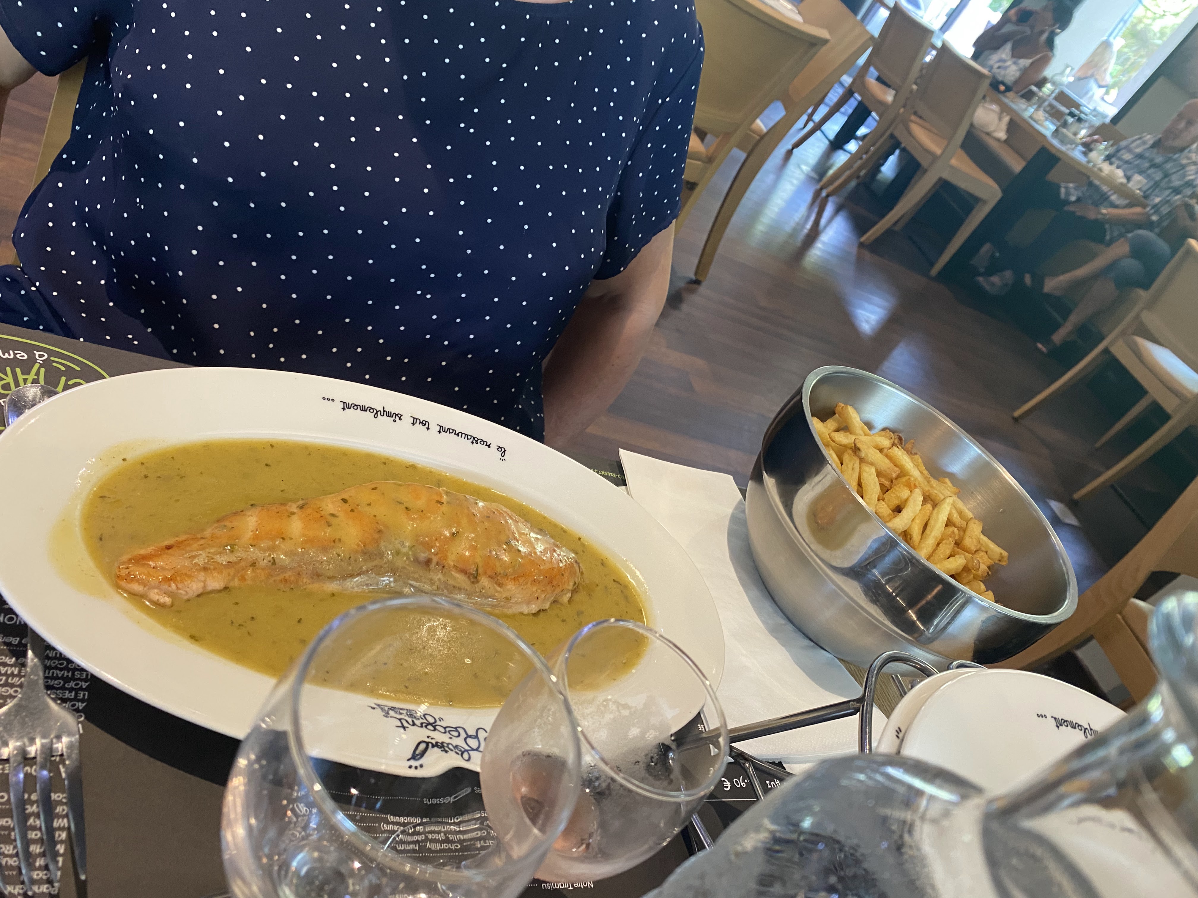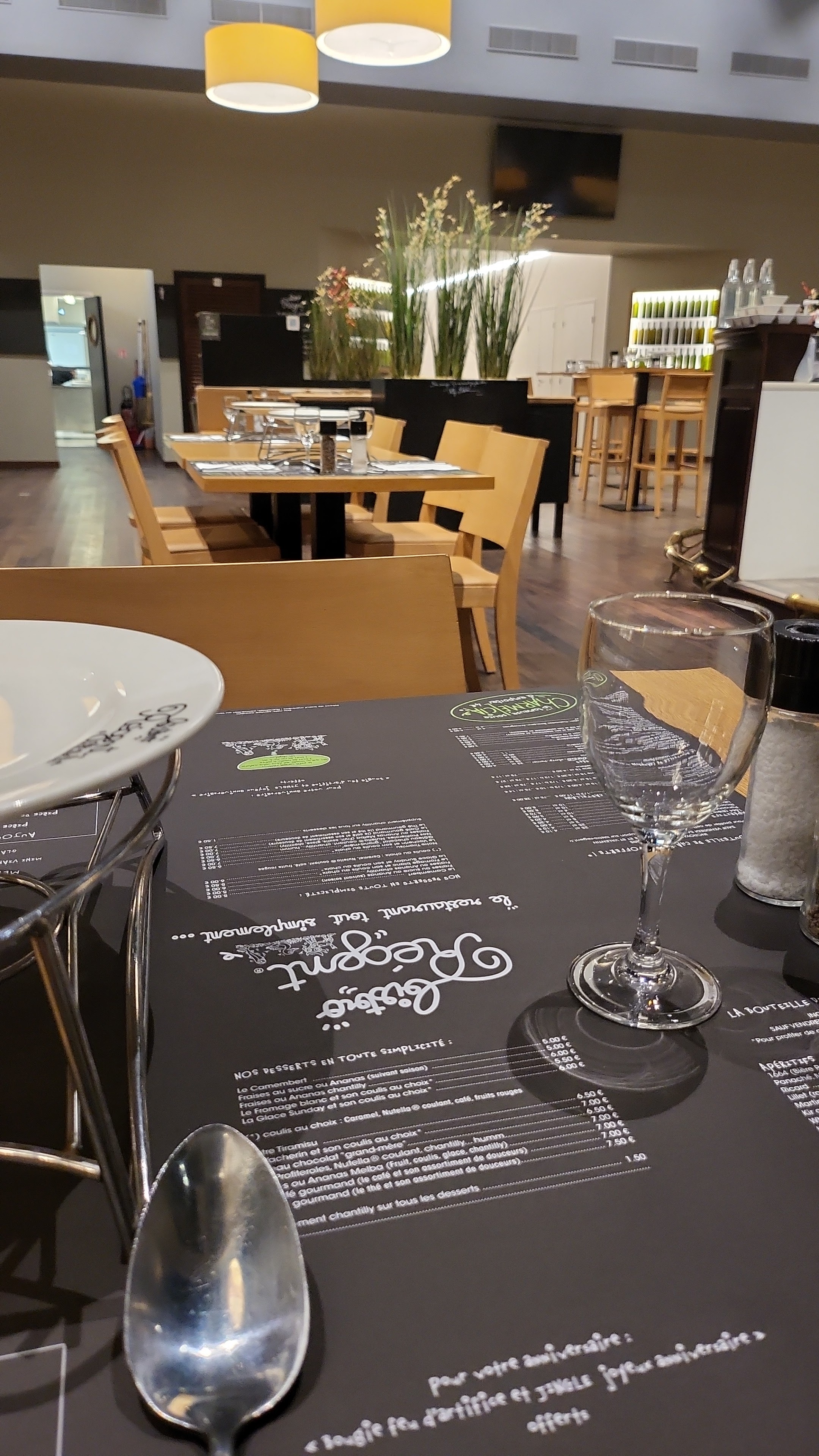 Belle salle et de la place. Par contre, frites un peu sèches, vin servi avec plus de dépôt que je n’ai jamais vu et tout au plus des excuses et resservi d’un fond. En général, on l’offre ou on sert en verre plein pour s’excuser. D’autant qu’il n’a fallu me déplacer pour faire observer. Ça donne l’impression de réclamer pour qq chose de normal