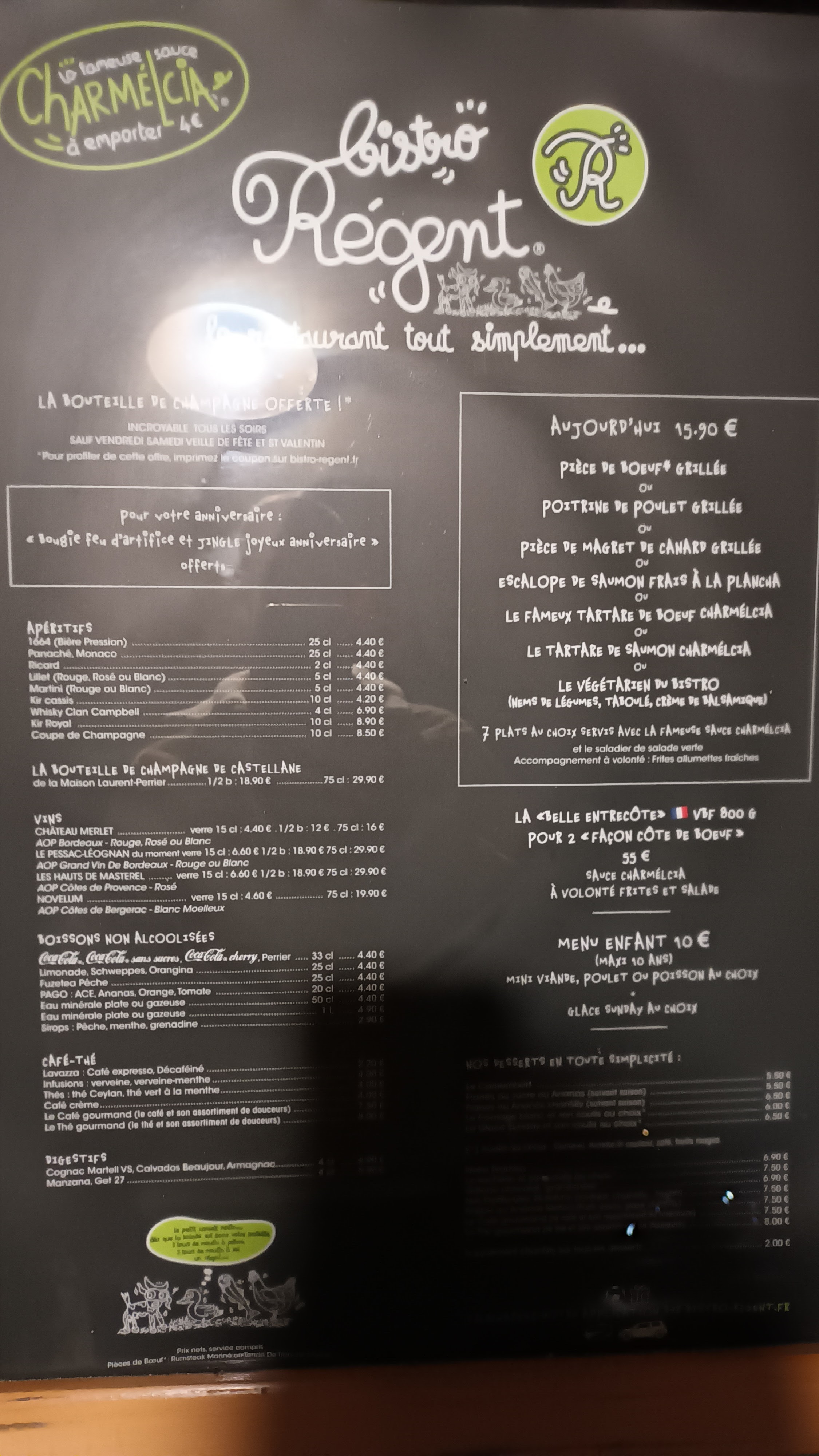 Le bistro régent qui est une grande, belle et bonne chaîne de restaurant j’ai toujours apprécié se restaurant que se soit dans le centre ville de bordeaux, Carbon blanc / Saint Eulalie j’ai toujours croisé des serveurs ou serveuses très agréables souriants et surtout polies mais malheureusement ce qui n’est pas le cas dans votre restaurant! Nous sommes arrivés avec un groupe de 30 personnes peut-être un peu tard pour vous je le conçois que le personnel soit déçu peut-être de débaucher plus tard que prévu (je me mets à votre place aussi) mais ça arrive peut-être rarement mais ça arrive à tout le monde pas qu’au restaurateur, être servis et le montrant très clairement de son mécontentement que se soit du service de la façon de ramener les plats ainsi que les accompagnements (pains, les boissons, les salades et les frites et surtout quand on redemande à être servis c’est toute une autre chose) et bien sûr en partant dire bonsoir ne même pas levé la tête et ni les yeux ne donne même plus envie de revenir manger dans se restaurant c’est bien dommage sinon tout ce qui est le plat il n’y a pas de problème. Sur ce je vous souhaite bon courage pour la suite avec votre équipe! Bon week-end