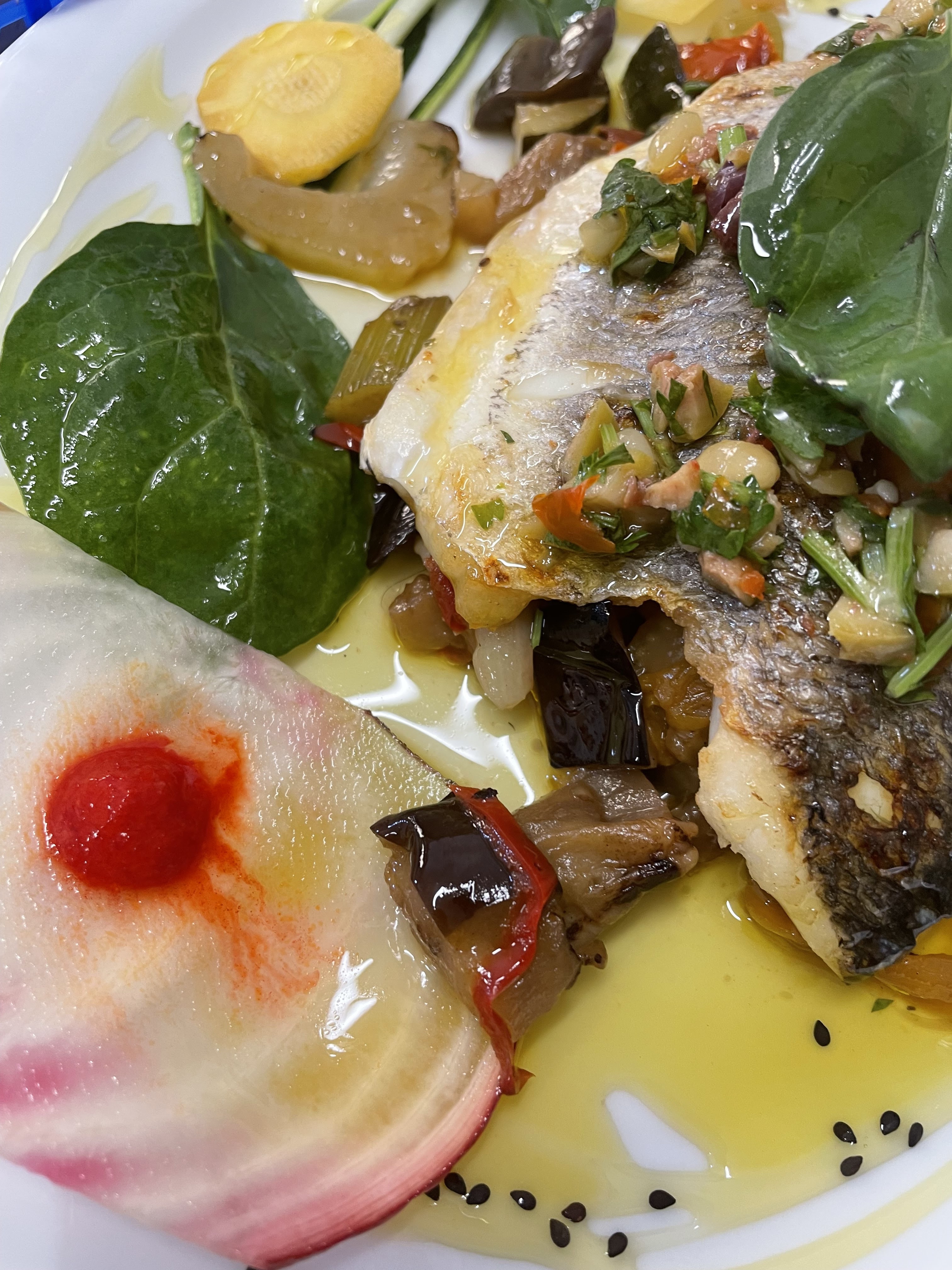 Très bon service, accueillant et chaleureux. Nous étions 5, notre Bar était très bien cuit et le crumble de légume était délicieux, les frites étaient croustillantes et dorées. Belle présentation des assiettes. Bonne qualité prix, nous recommandons.