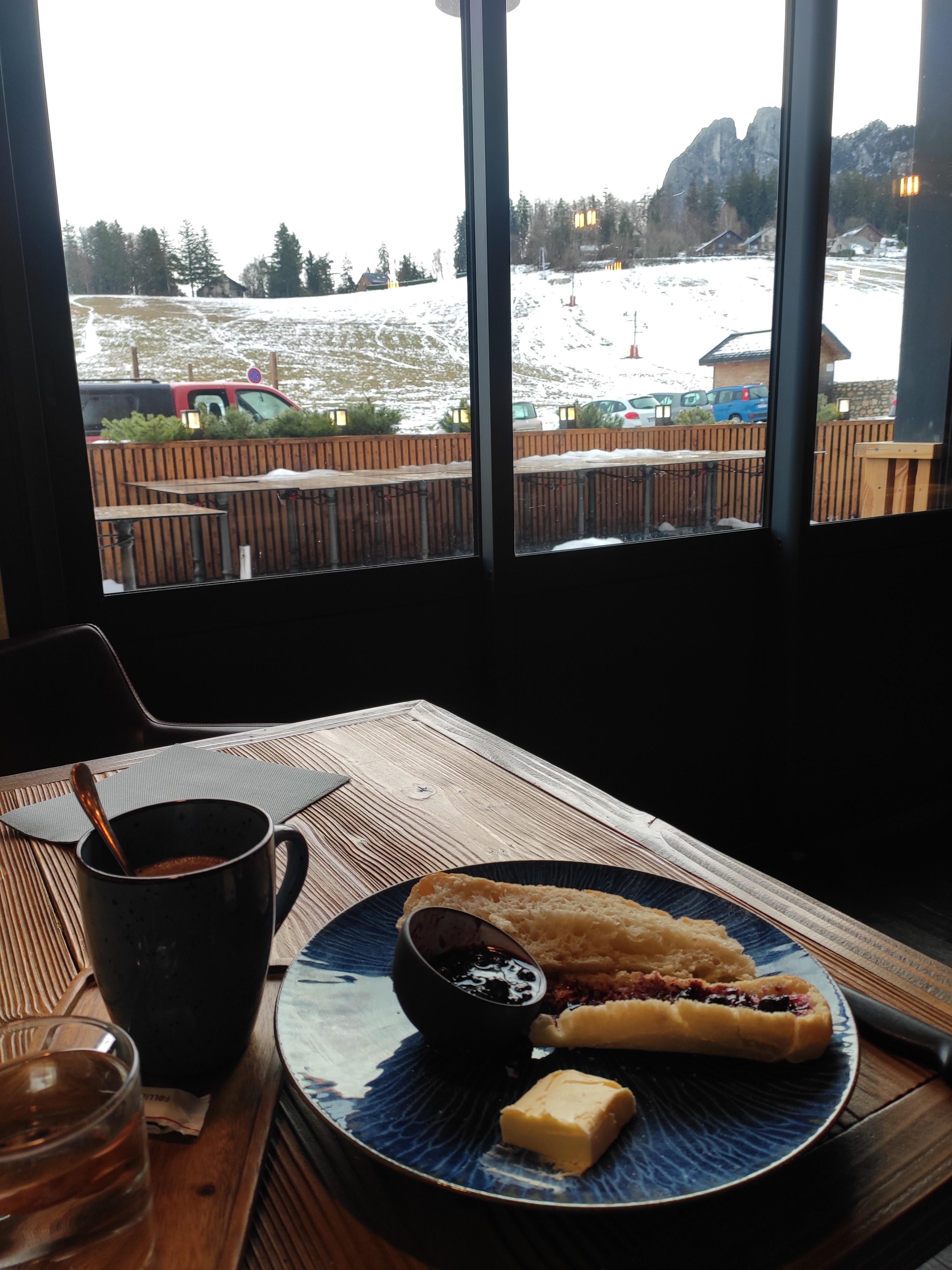 Super p'tit déj chocolat, tartines baguettes chaudes beurre et excellente confiture de myrtilles dans un bistrot ambiance montagne comme on les aime ! 😜 Je recommande !