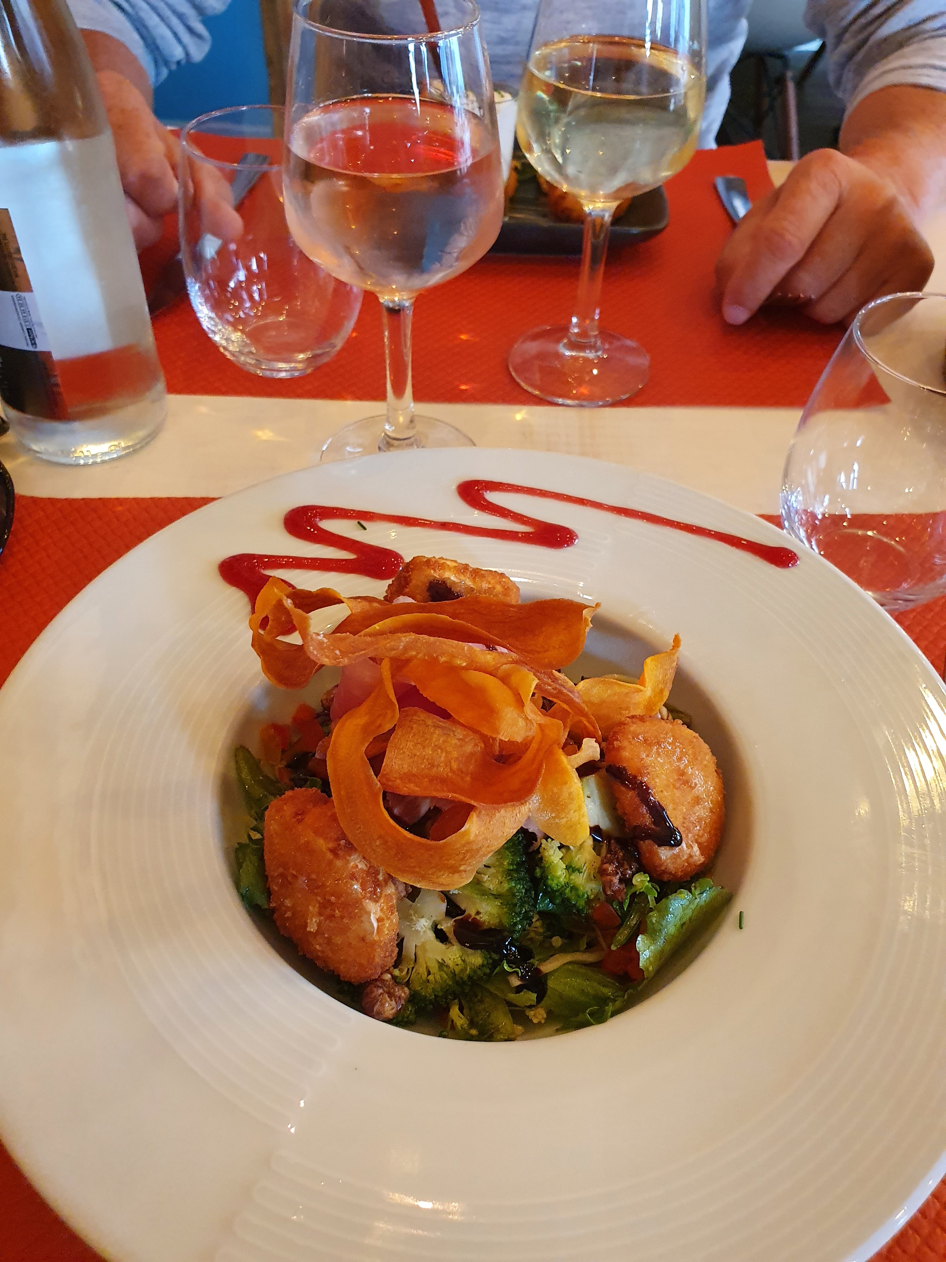 Accueil sympathique mais la cuisine manque de légèreté et de simplicité. (Photo jointe brandade revisitée).Une chaleur dans ce restaurant annoncé comme etant climatisé mais qui ne fonctionne pas bien et sans aucune fenêtre pouvant s ouvrir, c est dommage car il y avait du vent et de la fraîcheur à l extérieur. De plus, pas de glace pour conserver la bouteille de vin blanc pendant le repas!