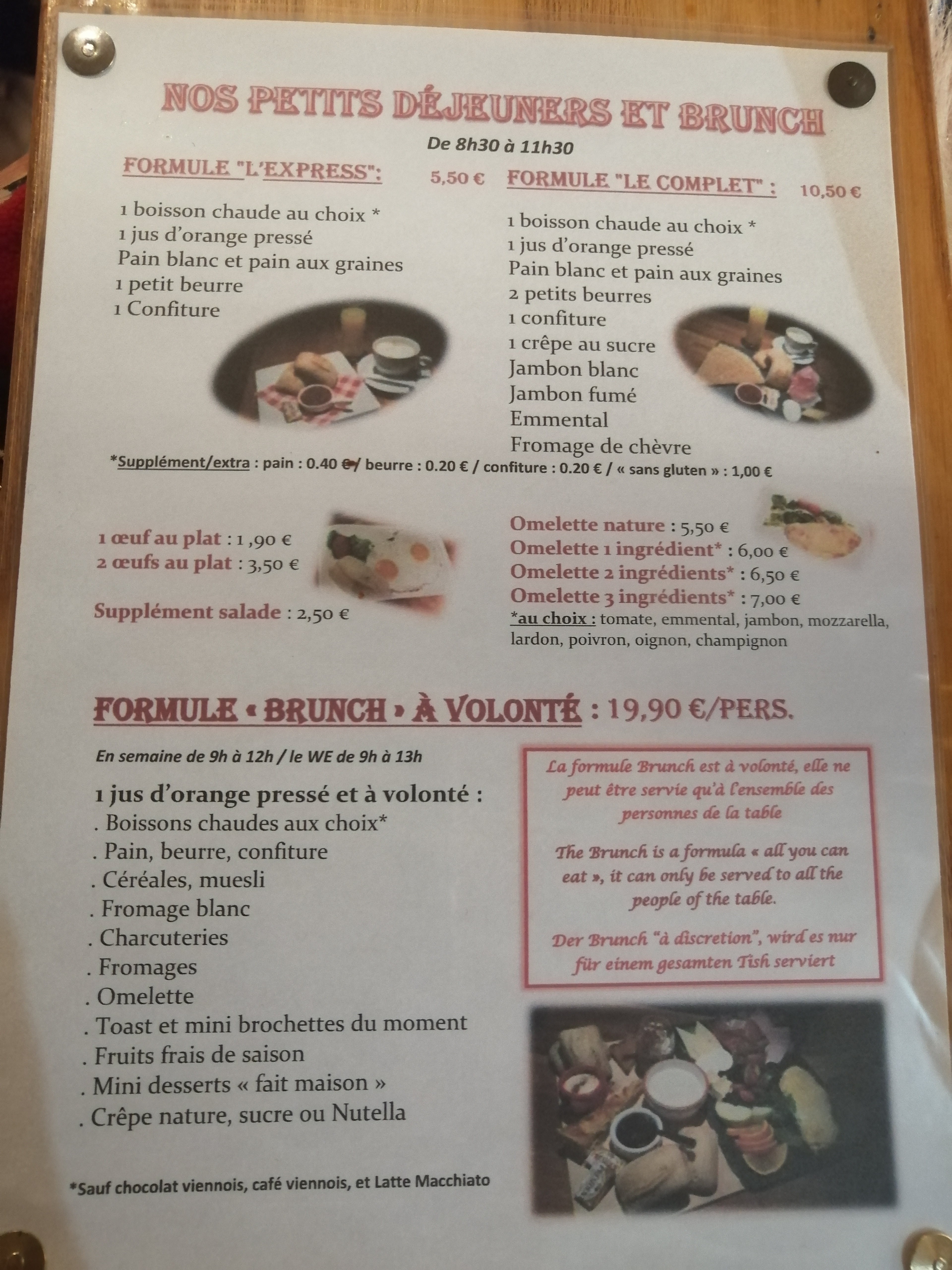 Je modifie mon avis ou j'avais mis 5 étoiles avant COVID ou les brunchs était vraiment copieux et fait maison mais la nous y sommes retournés pour un brunch a volonté mais c'était la grosse déception déjà le prix a augmenté je comprends inflation etc. Mais la qualité n'est plus du tout au rendez-vous déjà avant les boissons chaudes était à volonté c'est fini c'est dommage mais ça peut ce comprendre Mais franchement le brunch a volonté est vraiment très basique et pas de choix vraiment le minimum de l'Emmental du jambon cru jambon blanc saucisson salami brie et c'est fini pour la charcuterie... Du pain des oeufs brouillés même plus de désert fait maison juste des fruits coupé et deux sorte de crêpes .ça ne vaut plus du tout les 21 euros 50 c'est bien dommage cette baisse de qualité.!!! Vous voulez bruncher aller voir ailleurs car ça ne vaut plus le prix et la qualité d'avant ... Les photos étaient pour les brunchs et petits déjeuners avant COVID En revanche le service c'est top serveuse a l'écoute et souriante