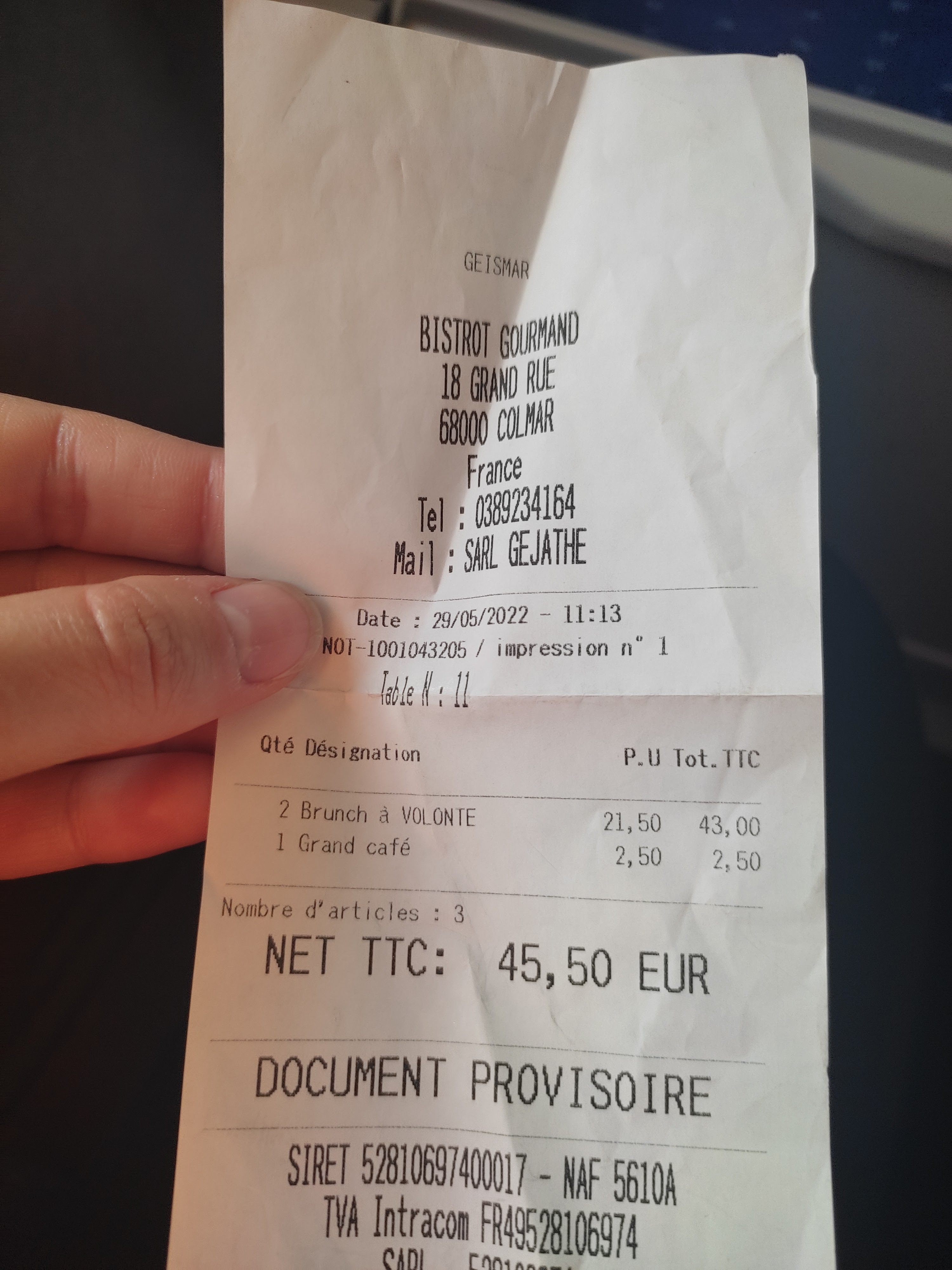 Un brunch de qualité au milieu de Colmar, une expérience que je recommande vivement, le jus d’orange pressé : un vrai délice. Petit point d’amélioration : un café supplémentaire aurait été le bienvenu 😉