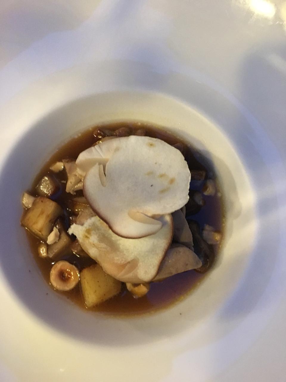 Peut-être est-ce lorsque l'on n'attend rien que l'on reçoit plus ? Un village charmant, une terrasse au détour d'une jolie petite rue, et voilà, la merveille : accueil charmant et attentif pour une cuisine merveilleuse. Ce jour, le chef propose une carte autour de 3 produits principaux: l'asperge, le Saint-Pierre et le veau, chacun décliné en 1 plat et 1 entrée, le client choisissant librement son entrée et son plat. C'est malin 😊 Le résultat est brillant : 1) les filets de Saint-Pierre juste flashés avec des artichaut émincés, superbes ! 2) Ensuite j'ai pris le veau en 2 préparations rôti et braisé servi avec une sauce du genre mayonnaise (excusez mon manque de vocabulaire) à l'œuf cuit et au citron confit, ce fut incroyablement subtile, vif, parfaitement équilibré J'ai goûté aussi le Saint-Pierre en plat servit avec un bouillon À chaque fois ce mélange d'originalité et de précision, aller chercher le goût, trouver l'équilibre d'une sauce qui vient souligner la cuisson produit mais sans alourdir le trait