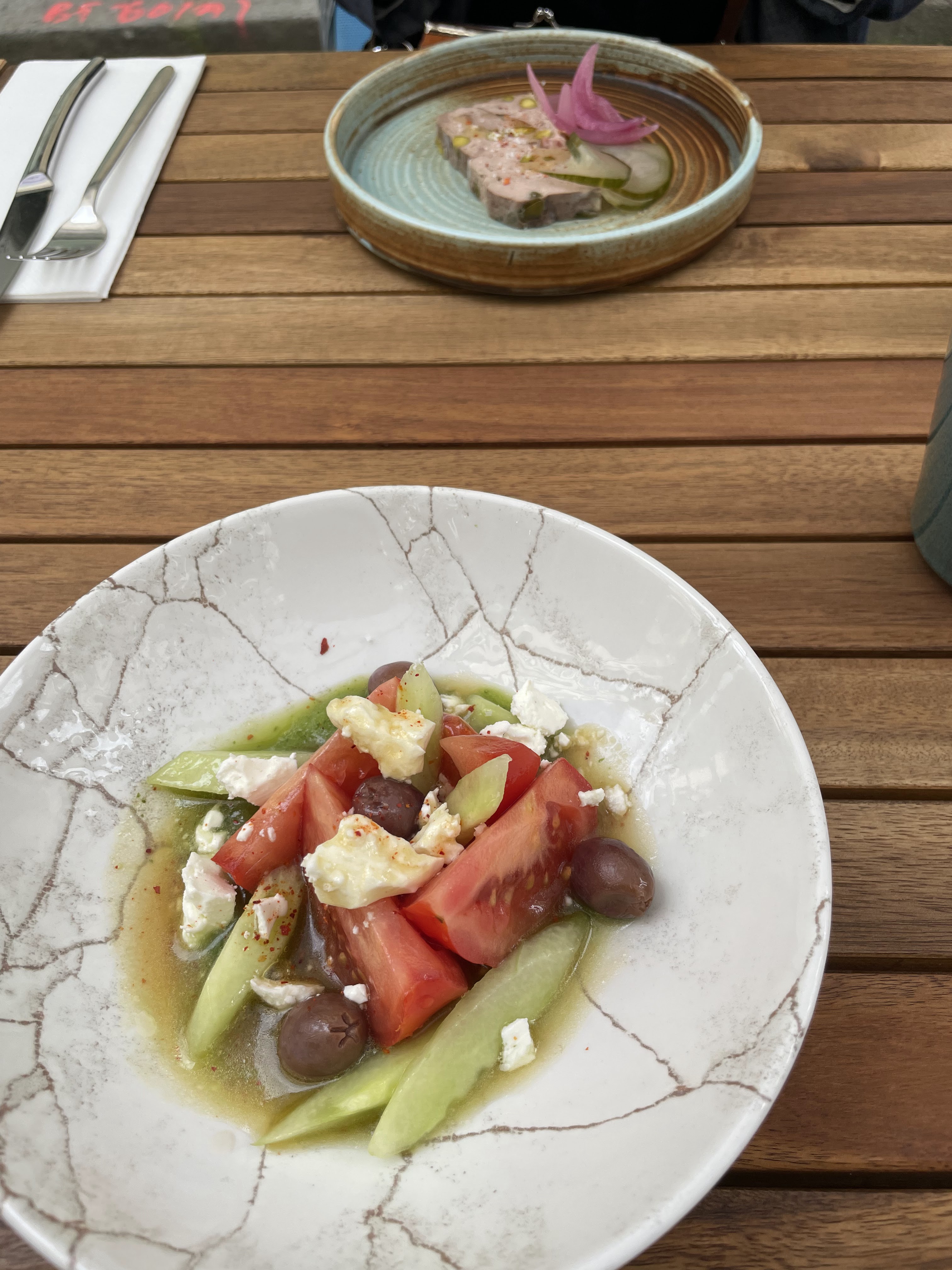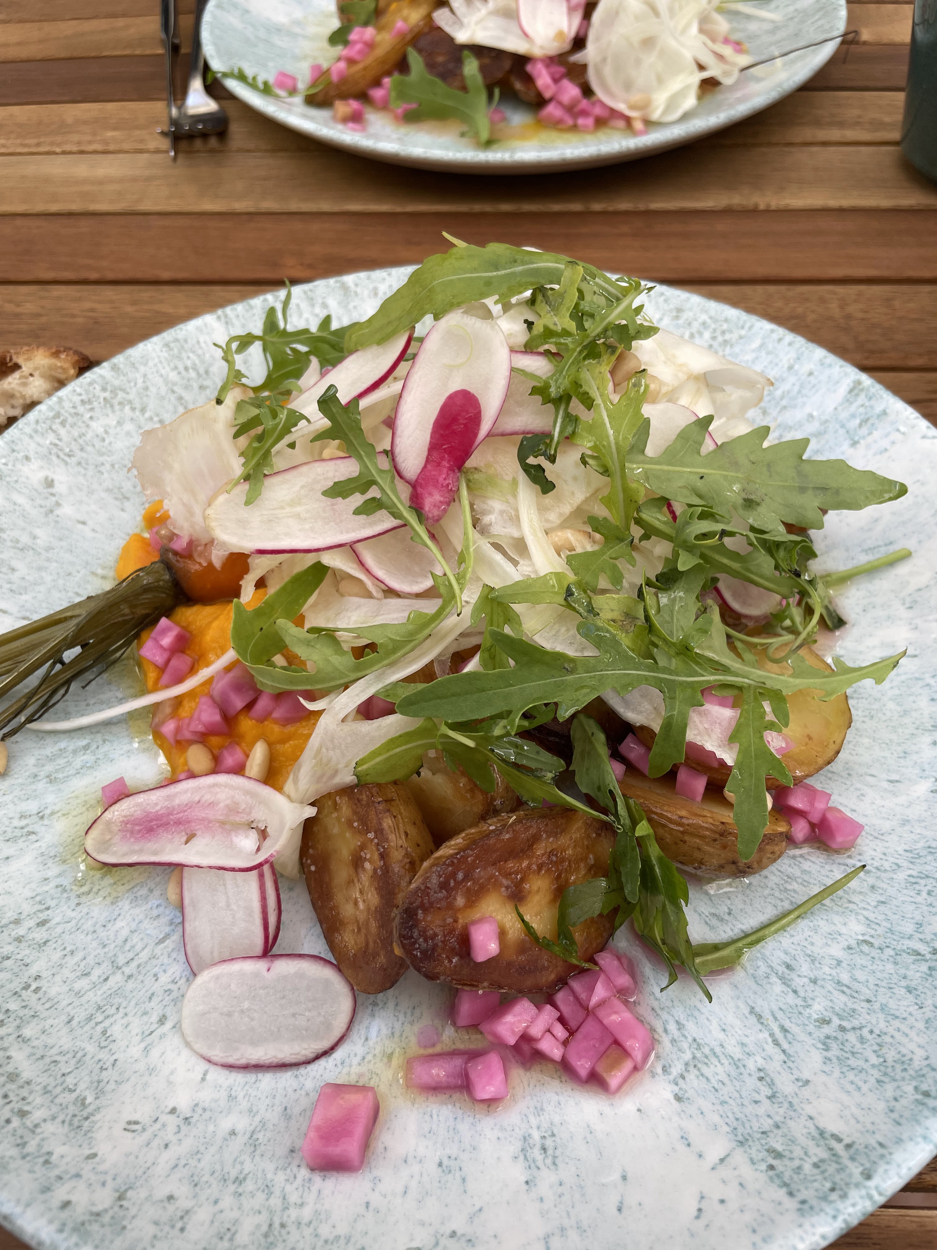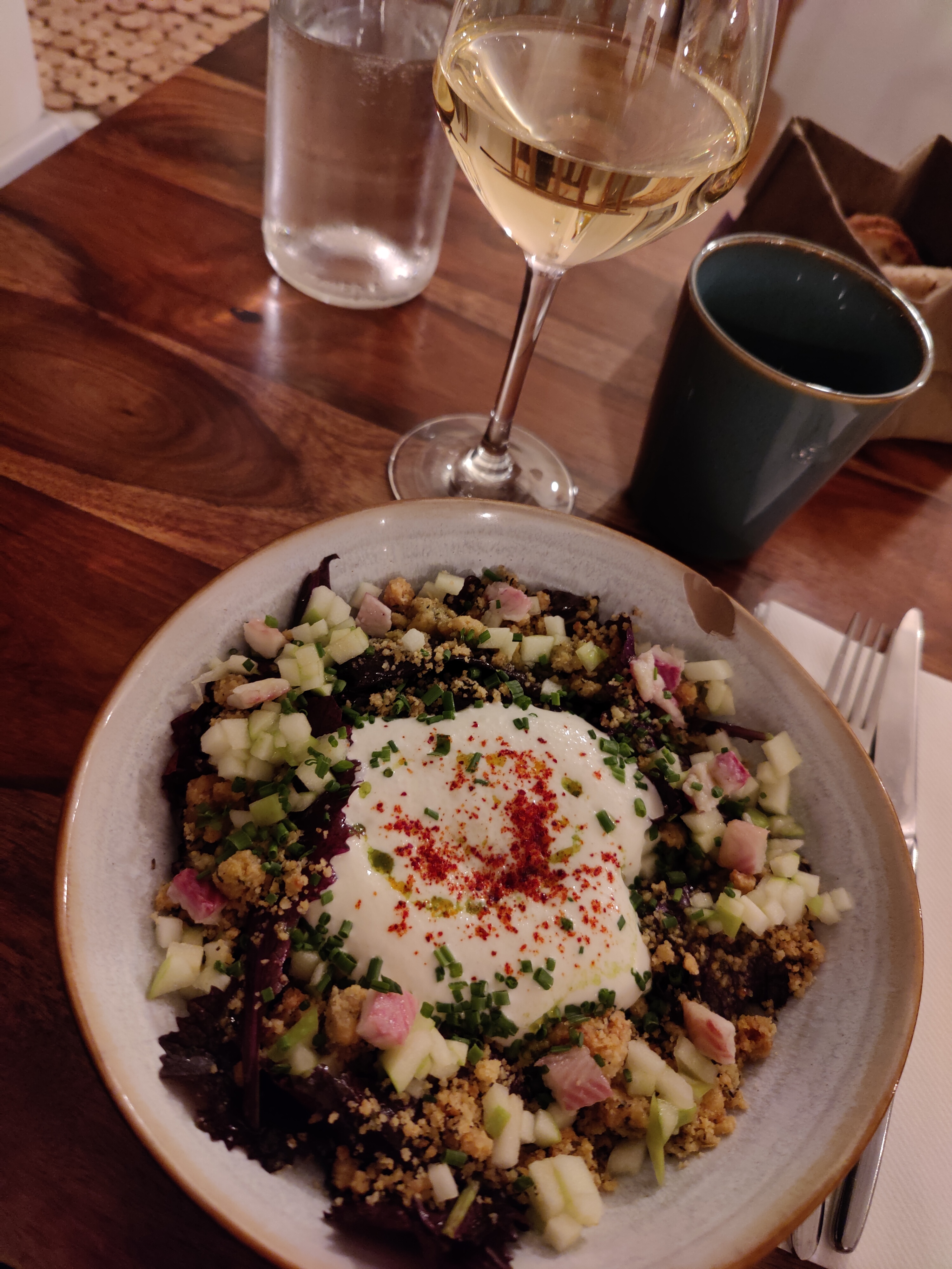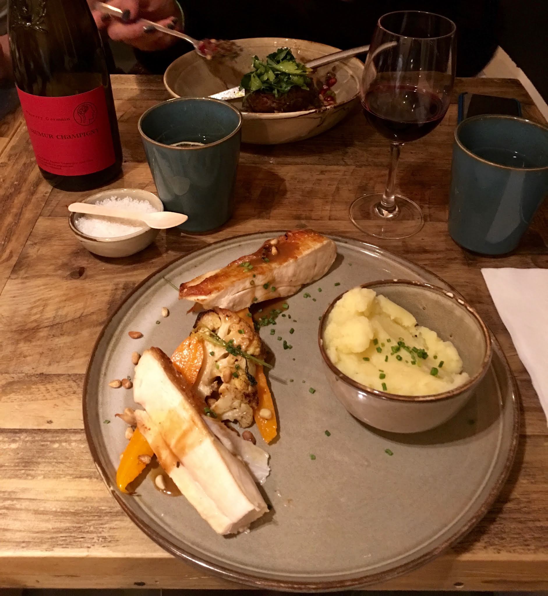 J’avais pris le plat végétarien qui était quasi identique au plat poisson sans le poisson. Un chaud froid de légumes cuits et crus. Le reste était bien mais rapport qualité prix trop élevé. Idem pour les vins une bonne carte mais prix trop élevés. Et pas d’échange de couverts
