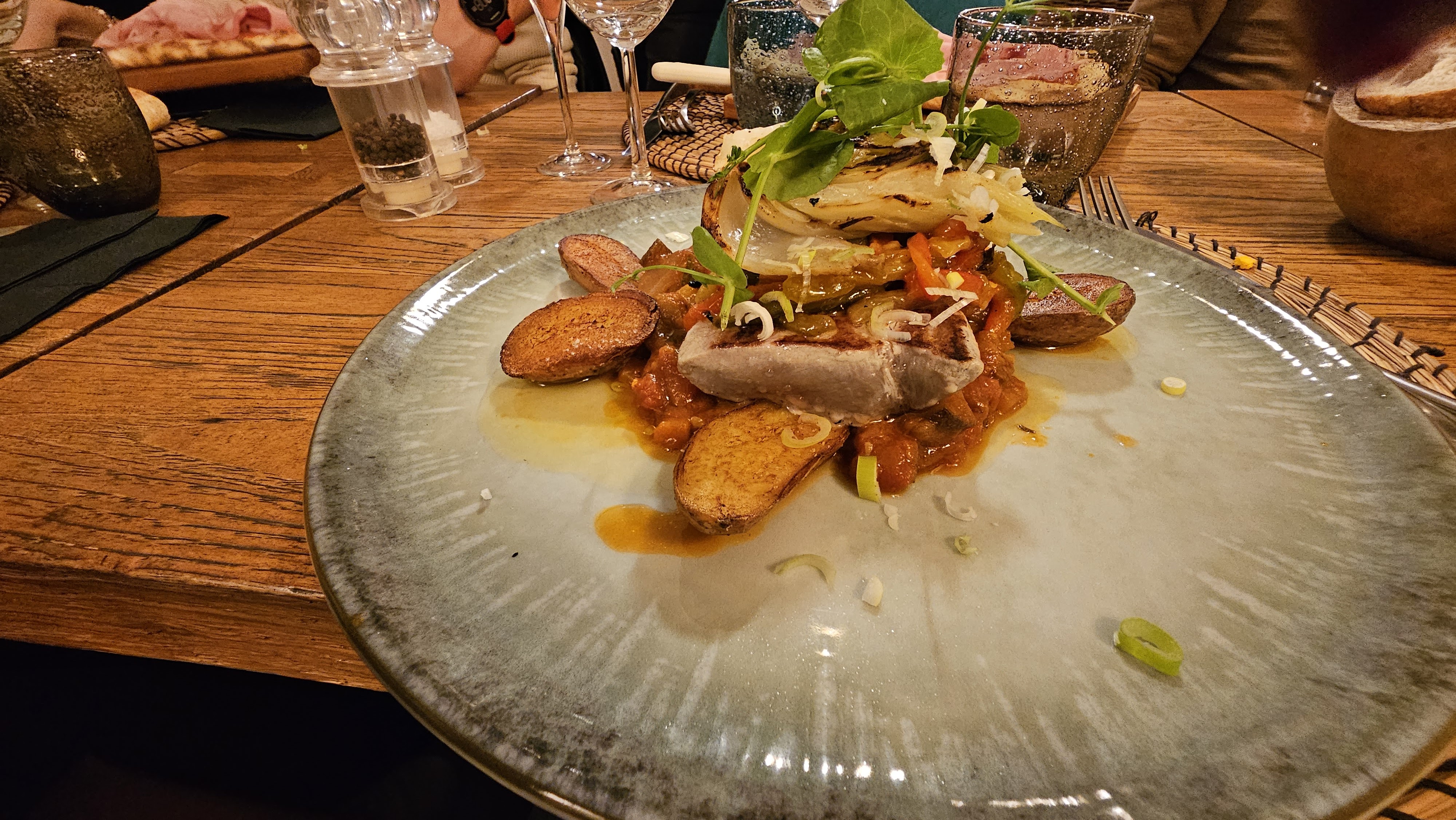 Bonne cuisine...et belle présentation.. Ambiance detendue...cadre bohème chic . Le patron est de bons conseils . Peut être à la carte des desserts..proposer un dessert plus léger genre glacé que ceux proposés( cependant très bons) ..pour faire digérer ce bon repas. Nous reviendrons.