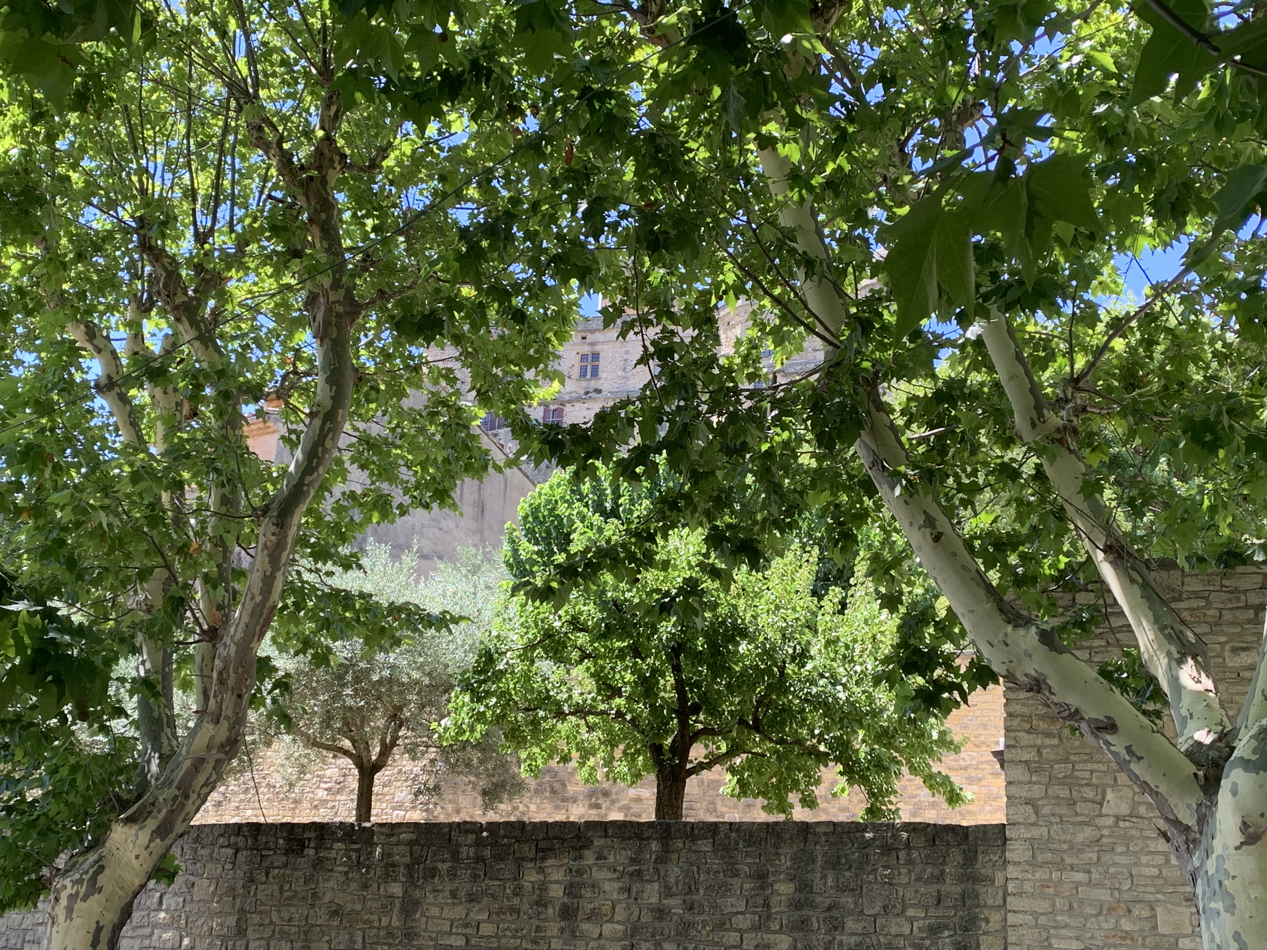 Parmi les platanes, ombragé avec un doux mistral qui nettoie le ciel bleu. On a bien mangé, atmosphère familial, bon prix, je le conseille.