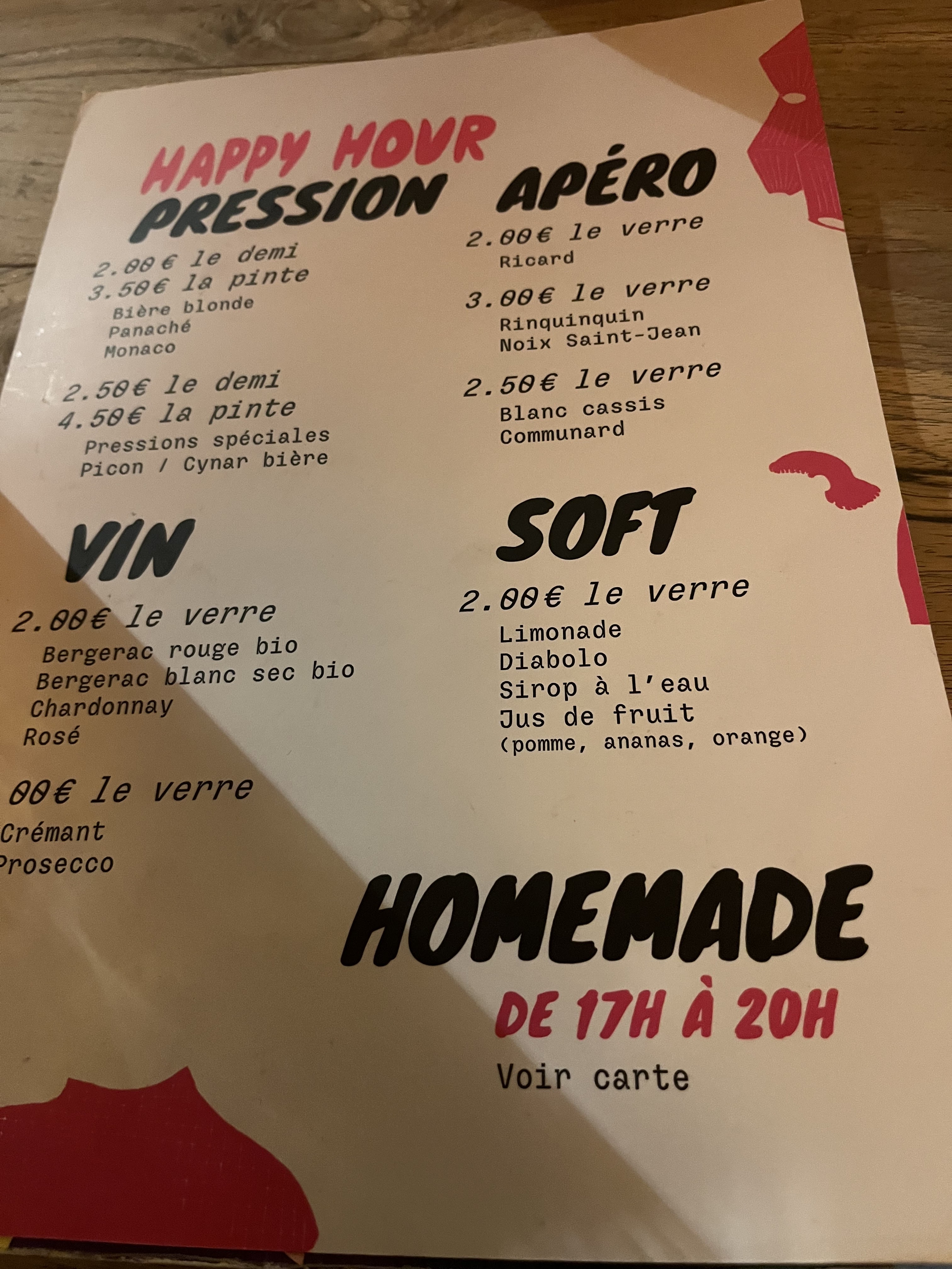 Mention spéciale pour le vin au verre, la charolaise cuite selon vos goûts. Je vous assure que le FAT BURGER est gourmand, choisissez votre BURGER, le chef double la viande et garnitures pour le FAT... ambiance conviviale de quartier, avec beaucoup d habitués, service sympa, wifi gratuite, bon rapport qualité prix...on est en Alsace, on triche pas à table...et en plus happy hour à tester absolument....Je vous le recommande