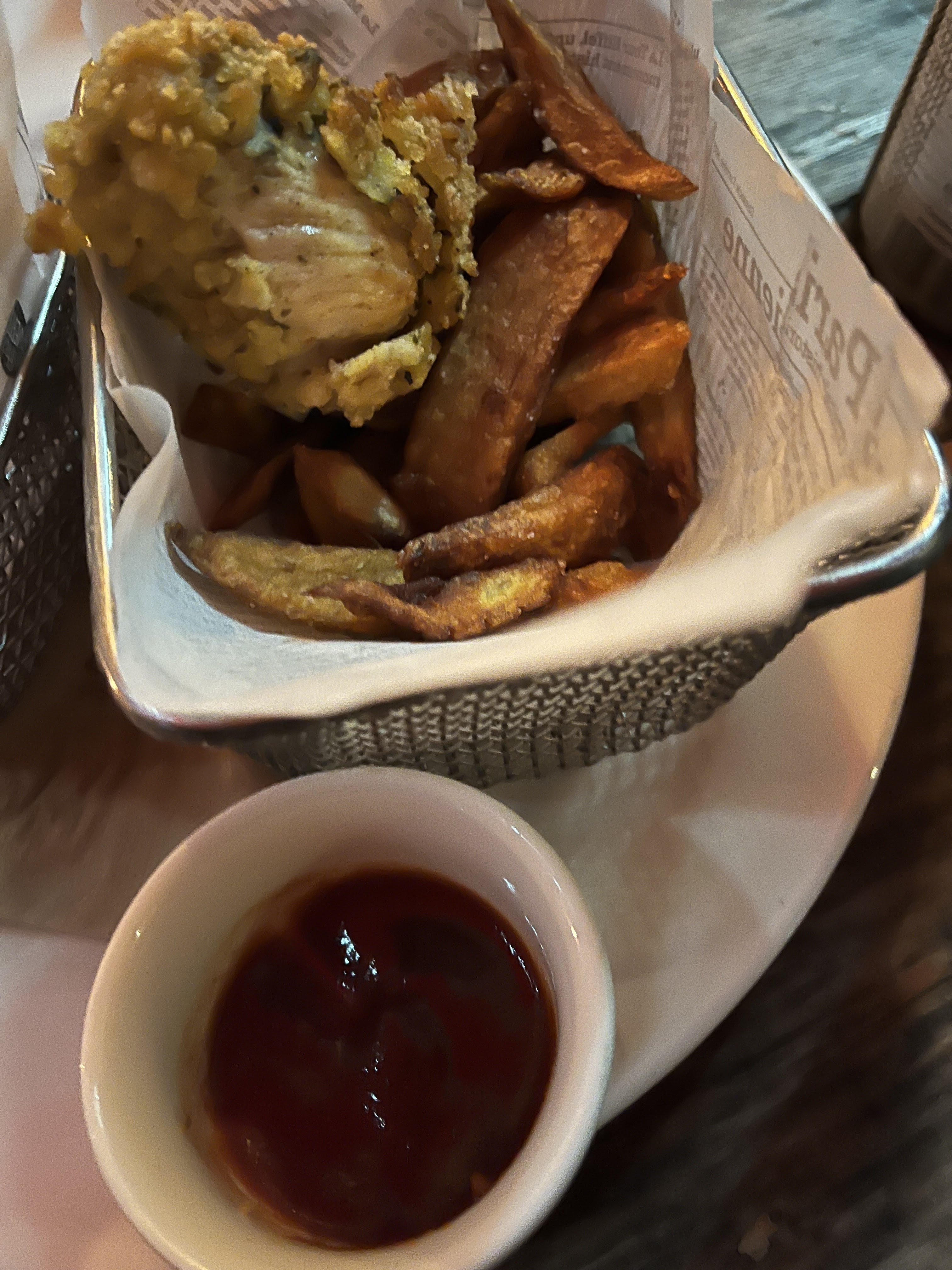 Cet endroit a du potentiel, avec des sièges sur le trottoir et un service amical. Cependant, la nourriture était assez décevante. La panure du poulet tombait et les frites étaient brûlées et grasses. La (très petite) sauce barbecue était trop salée et avait un goût bizarre.