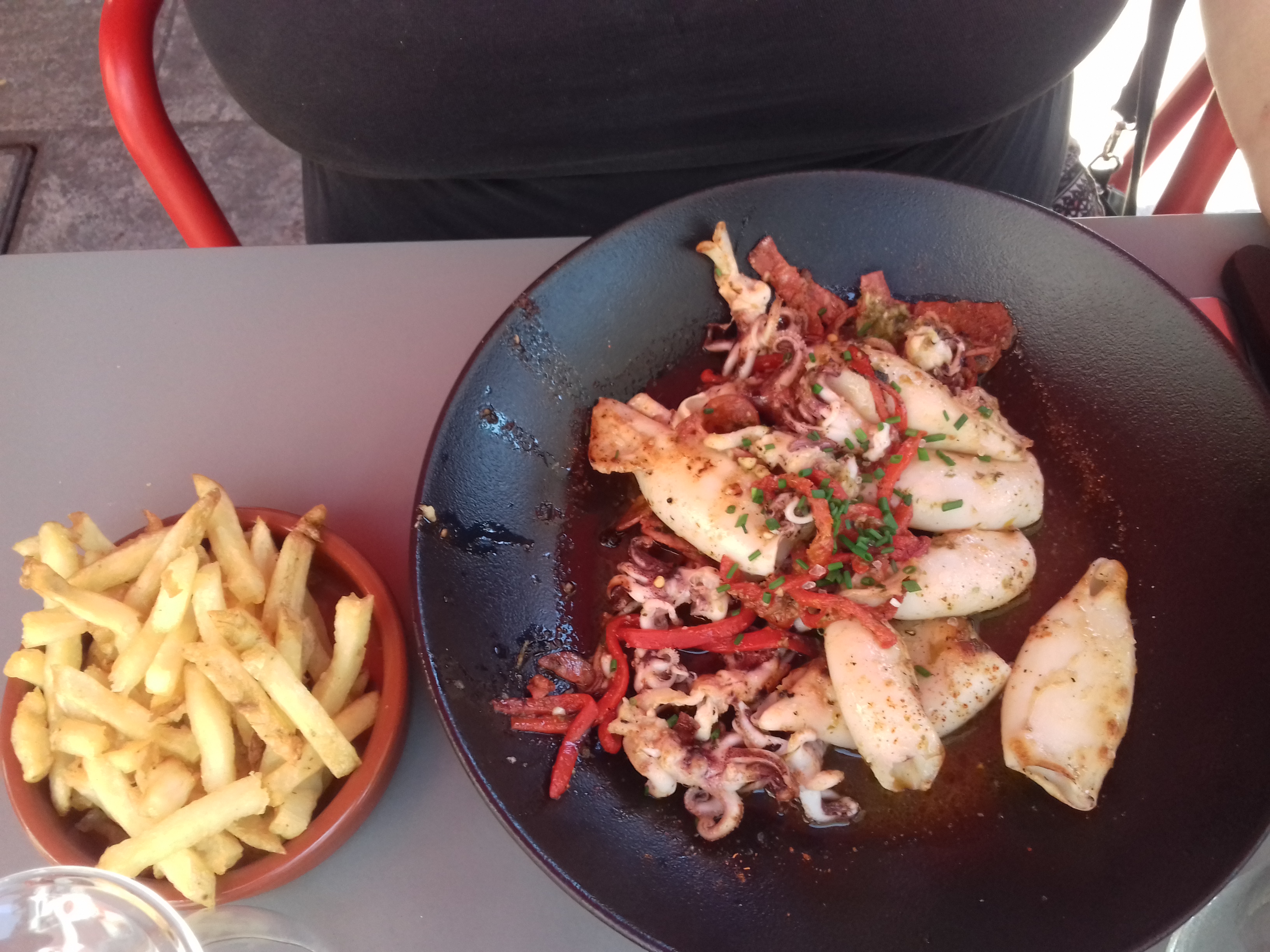 Bon moment passé avec mon conjoint. Nous étions en terrasse, servis rapidement et agréablement. Les plats sont assez copieux et de bonne qualité ! Monsieur a pris le plat du jour et moi les chipirons avec risotto. C'était très savoureux pour un rapport qualité/prix au top. Je recommande