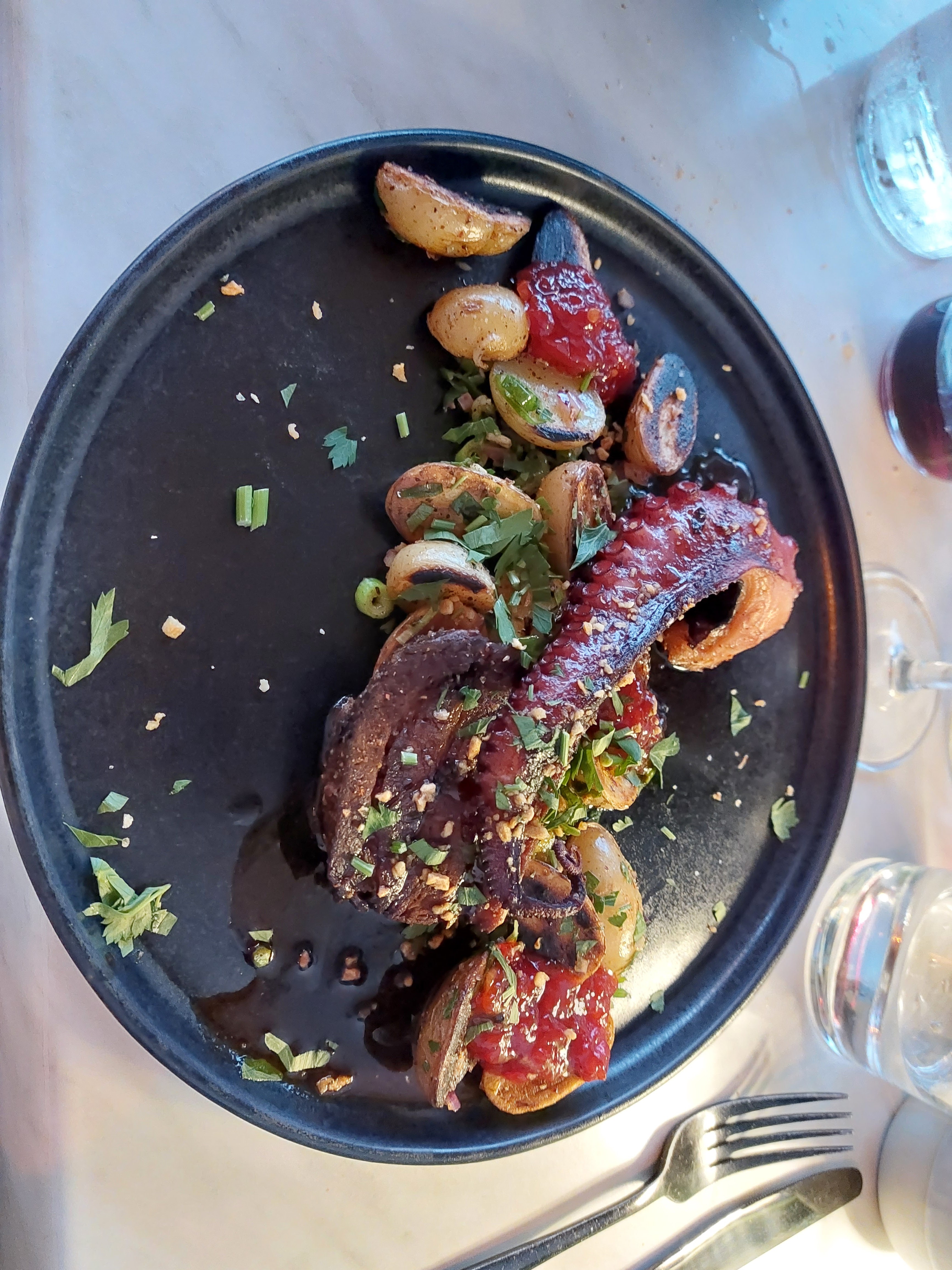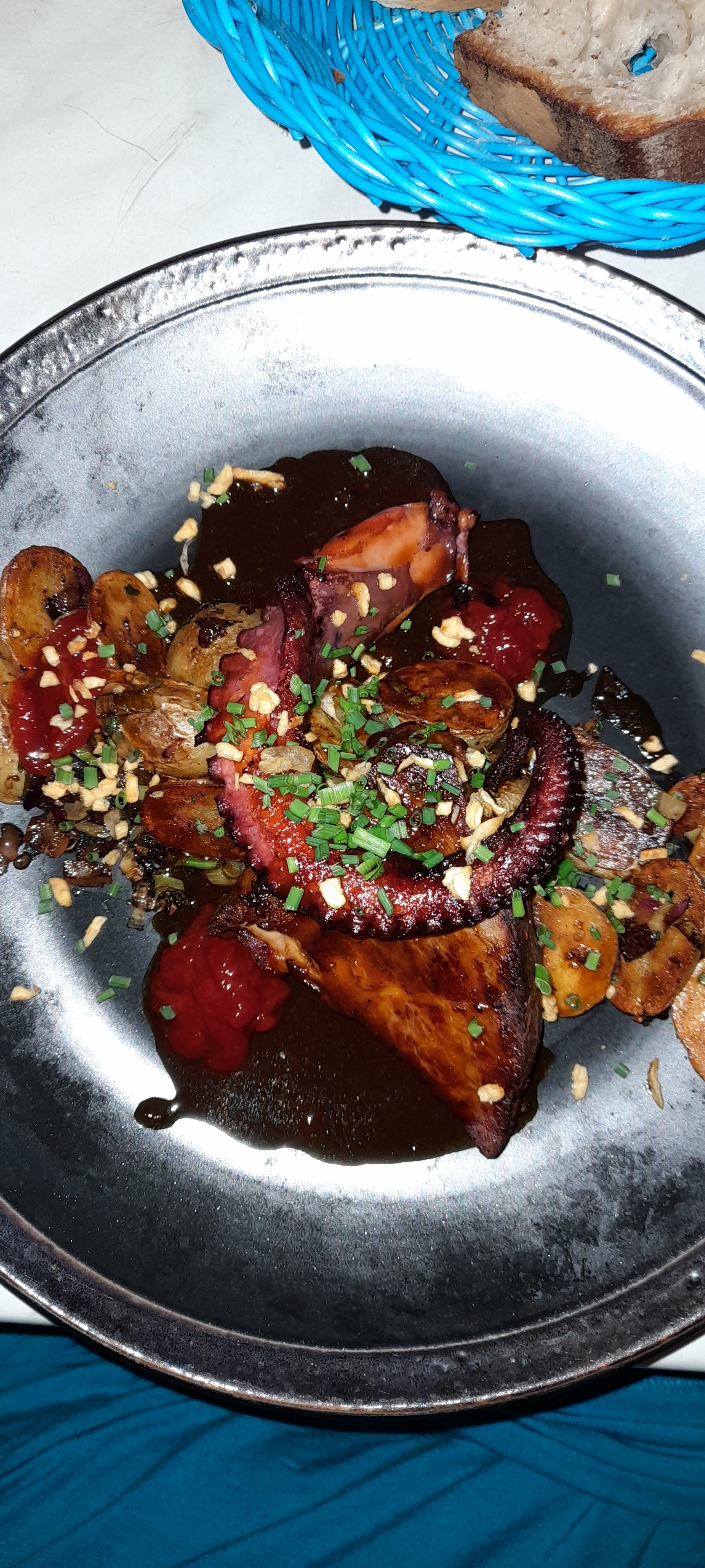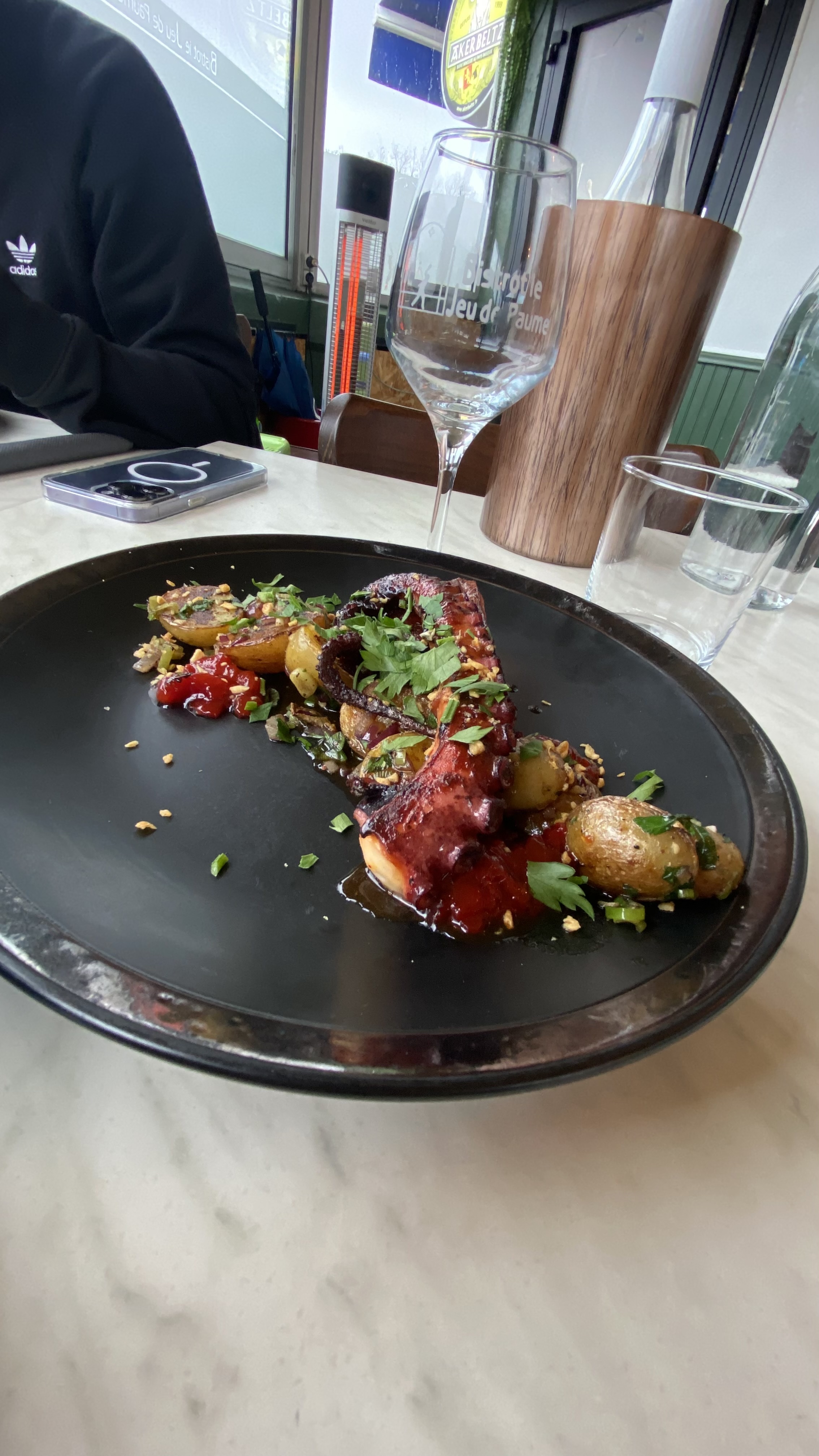 Il faut passer outre le cadre vraiment pas attrayant (et c'est dommage) mais côté cuisine c est une bonne adresse avec des produits frais bien cuisinés et de beaux mariages. Le poulpe et cochon à la marmelade de pimiento toutefois trop sucré. J'ai pris un apéritif et j'aurais apprécié un petit truc à grignoter en attendant (il y a des planches et tapas à commander cependant mais seule c'est trop copieux) Bref une bonne adresse mais qui mériterait encore mieux avec quelques améliorations