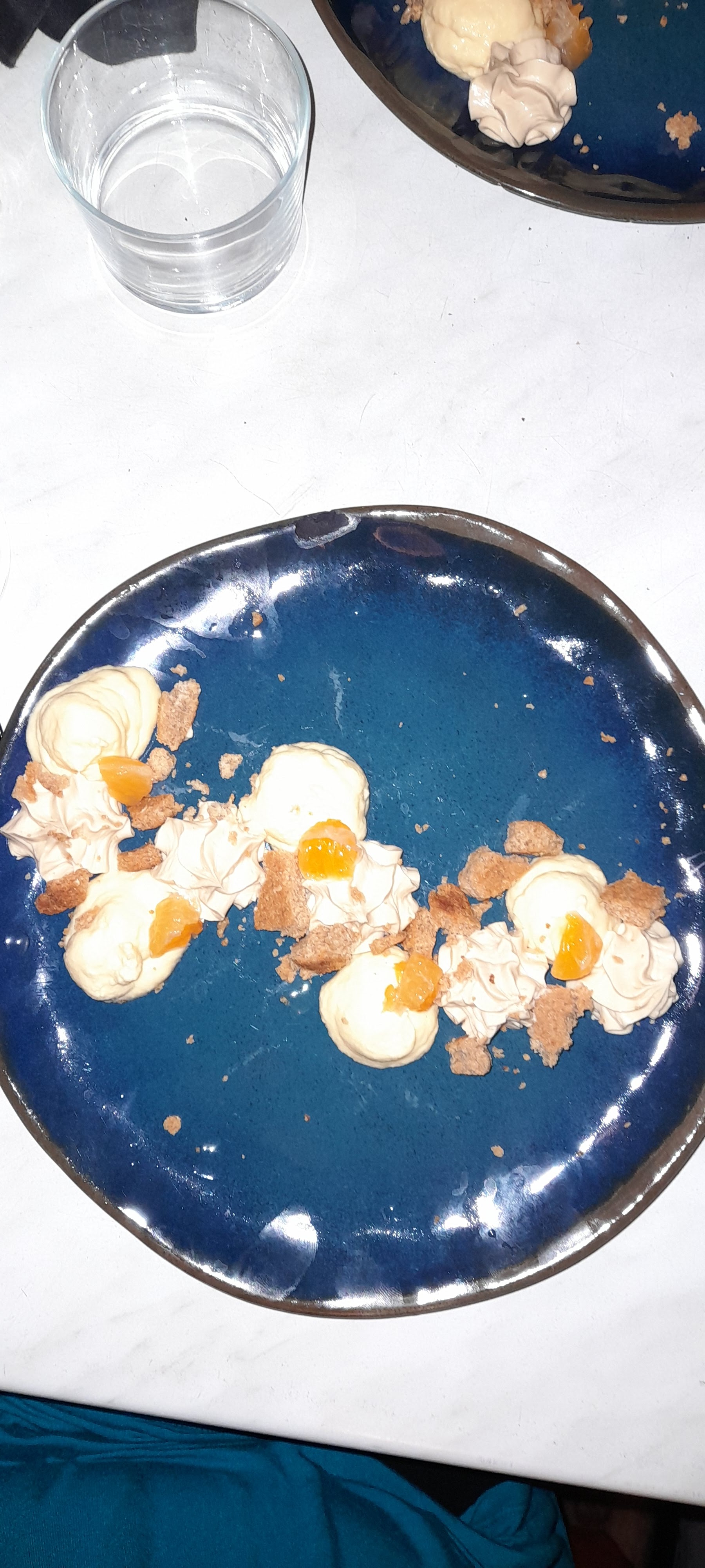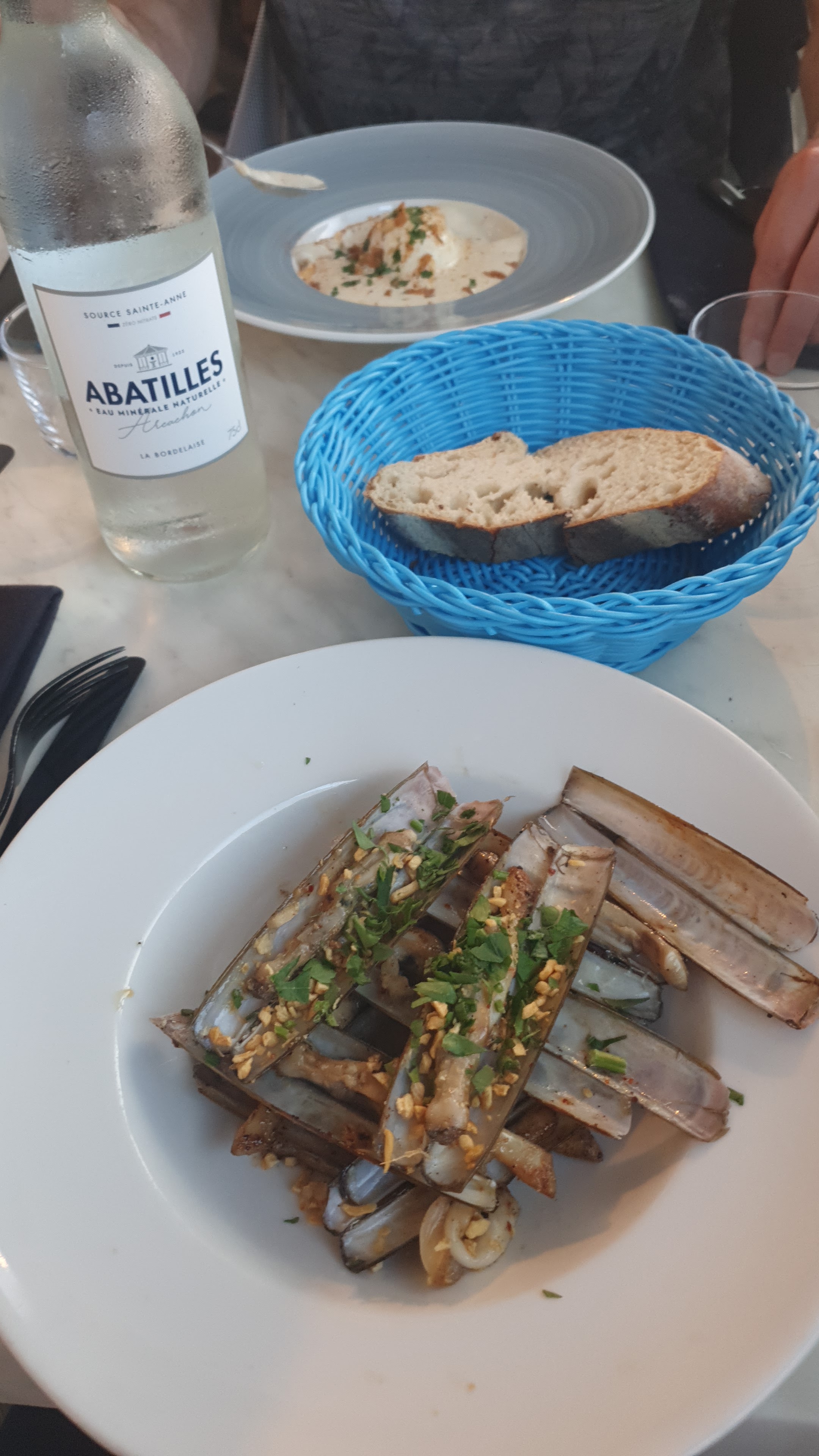 Une perle rare pour nos noces de Saphir, une vraie découverte, une vraie surprise ! on peut choisir dans la carte les yeux fermés. De la finesse, de l'équilibre, de la variété de goûts et de couleurs, de l'inattendu, tout ça sans surcharger l'estomac ! Une mention particulière pour la pâtissière : si la carte paraît banale, c'est un vrai festival inattendu dans l'assiette, on croit savoir les goûts et les textures, mais on va d'heureuse surprise en merveilleuse surprise, l'assiette garde toujours un temps d'avance sur notre attendu ! C'est purement extraordinaire, la pâtisserie réinventée dans des sommets inégalés. Honneur à cette jeune pâtissière ! Et pour l'eau, le bistrot propose Abatilles, la fameuse eau alcaline d'Arcachon, en bouteille verre. Le service ? Précis, efficace, patient, dans les temps, cultivé, honorable, ah, pas de cœur de pierre ou d'arrogance envers les anciens, rien qui nous retiendrait de laisser un bon pourboire ! Au mur, quelque chose de bleu sur blanc, qui évoque une île, l'île d'origine du patron, mais on vous la laisse deviner ...
