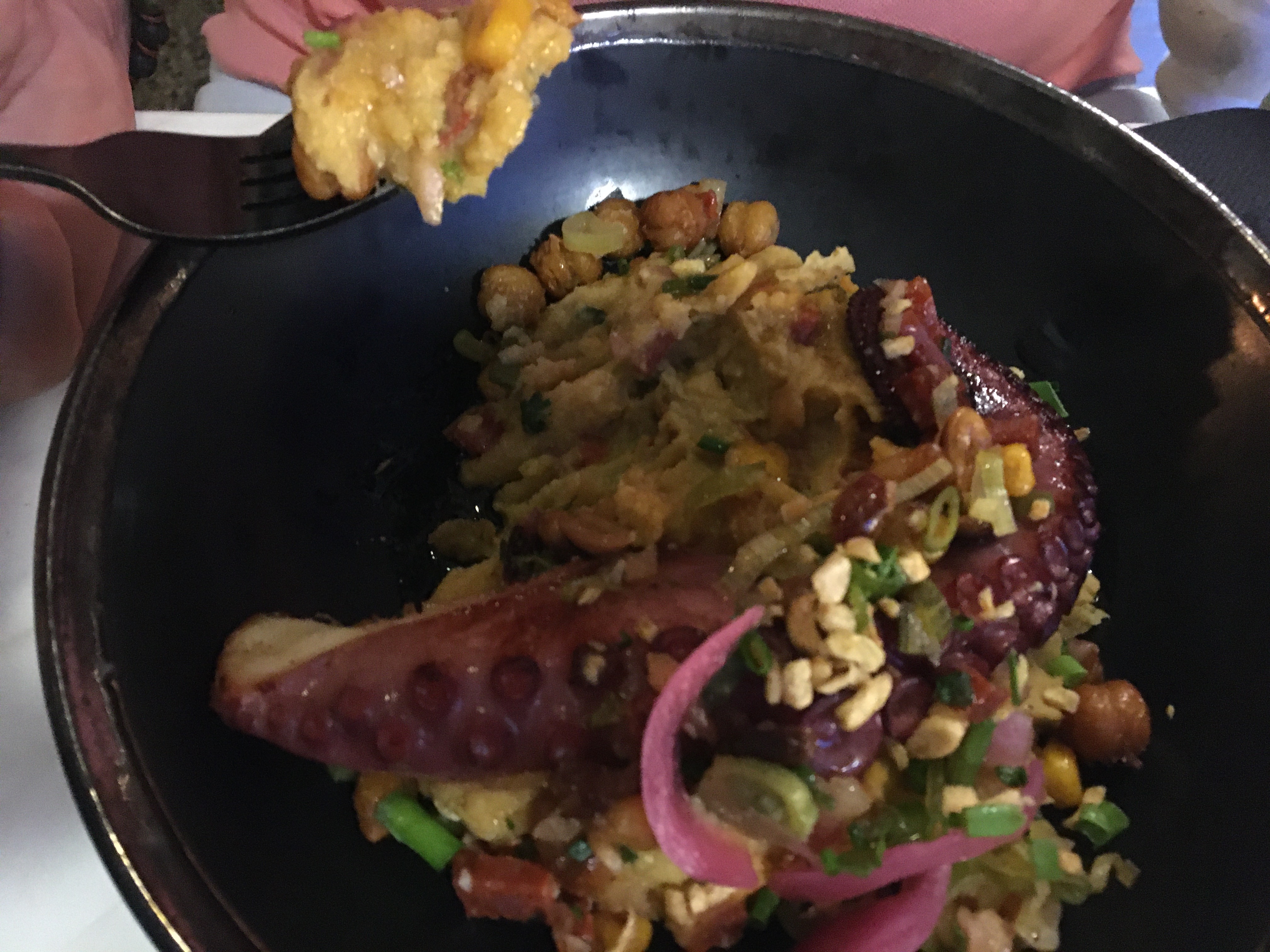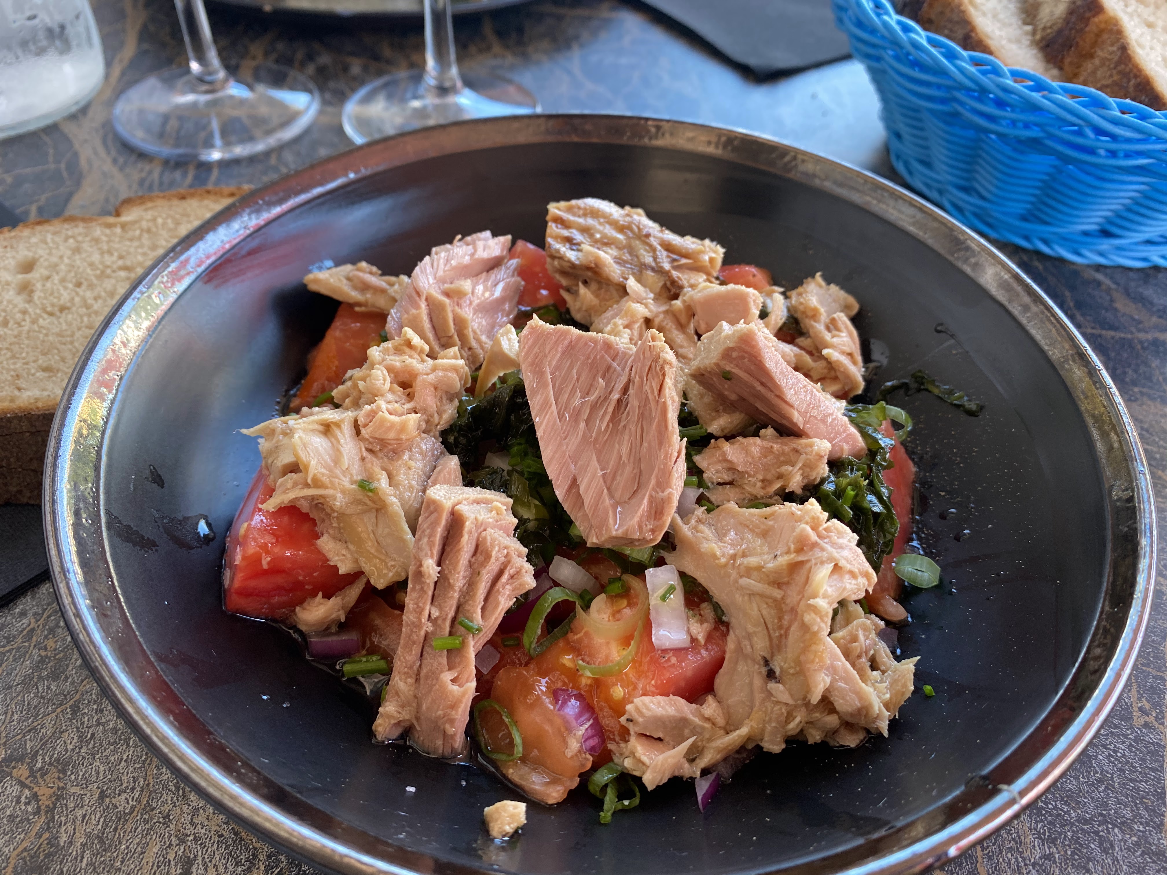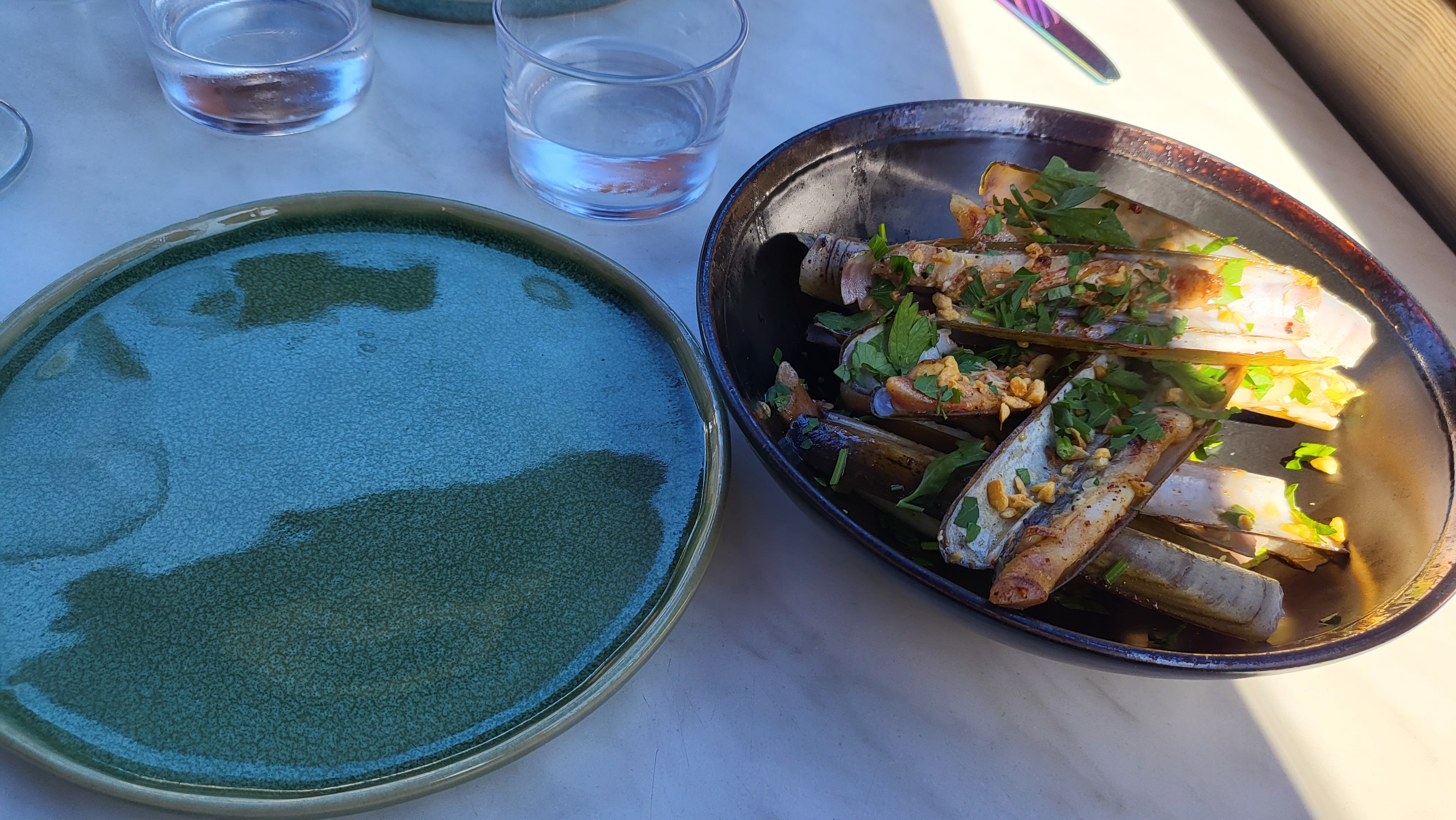 Repas délicieux ! Couteaux à partager à la plancha,. Poulpe accompagné de son houmous à la menthe et gâteau basque. Je reviendrai !!!