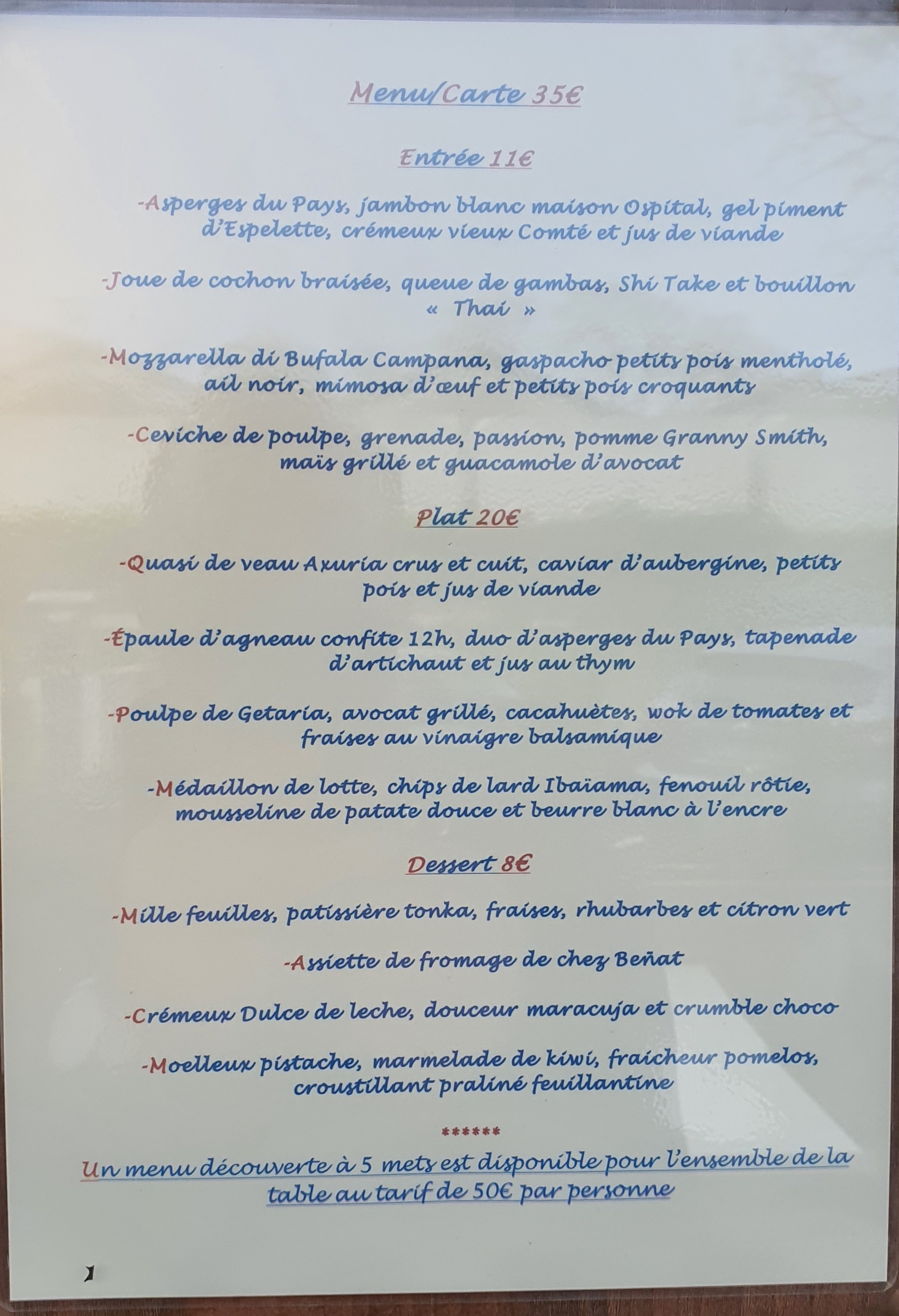 Accueil parfait. La carte est courte car le fait maison est à l'honneur, courte mais variée. Terre et Mer y sont délicatement représentées. Cuisine très raffinée.