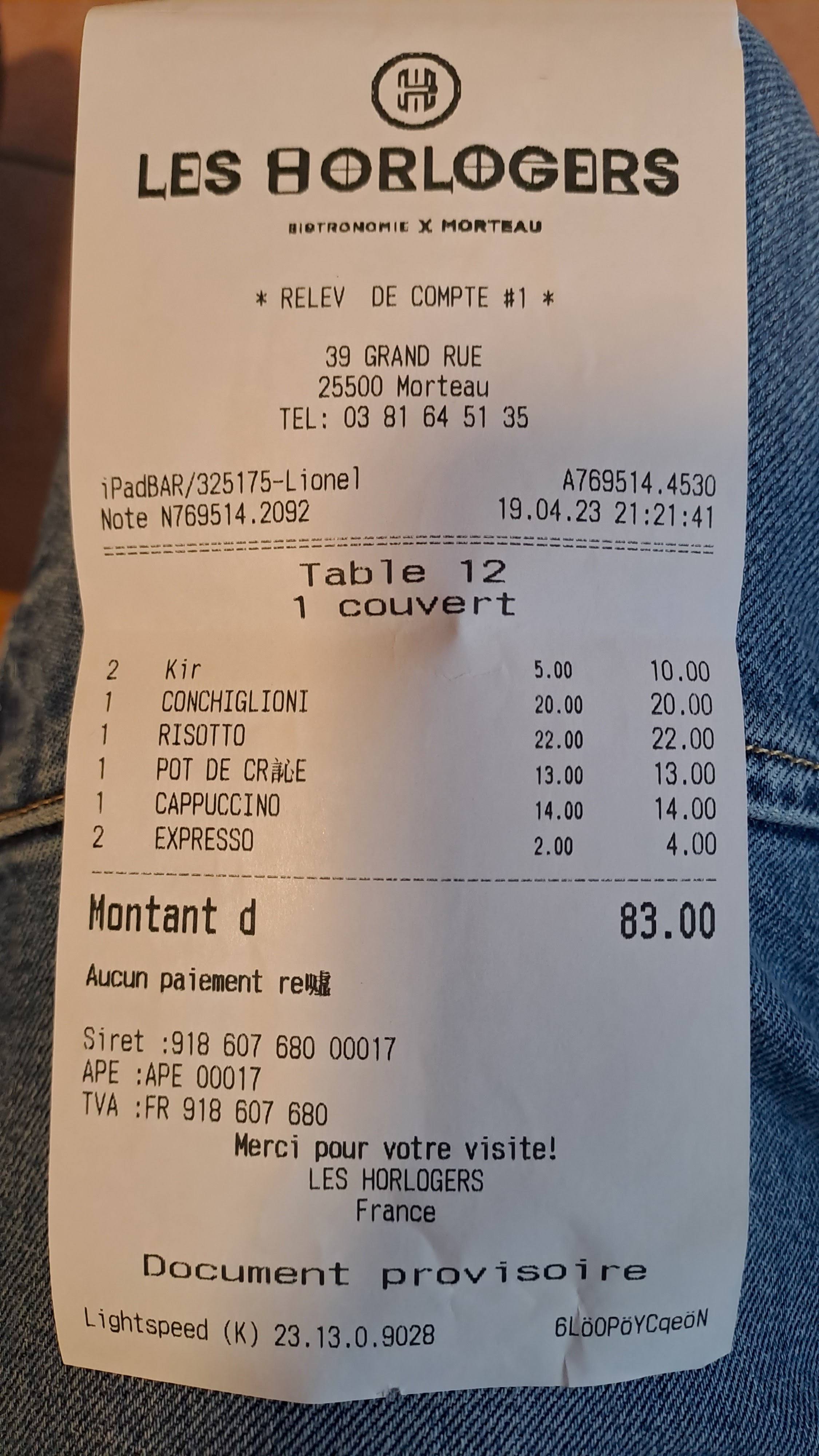 Nous sommes allés manger à 4 personnes pendant les vacances de noël. Entrée, plat, dessert, 2bouteilles de rouge, cafe, digestif. env.450euros. On parle d'un bistrot et je n'ai pas l'ambiance d'un tel établissement. Le serveur est peu accueillant, avec une impression qu'on le dérangeait. On commande foie gras en entrée, côte de boeuf au repas avec un premier vin ... vacqueyras de 2019, le serveur nous sert un 2021. C'est pas ce que nous avions commandé, on le dit etc. bref on laisse, en espérant avoir une petite ristourne sur le prix du vin ou café offert. La côte de bœuf arrive sur table. Les couteaux sont à lames lisses, malheureusement 2 couteaux ne coupent pas. Un pote se lève pour amener les couteaux et revient sans. On attend 3,4 minutes puis on se relève pour aller chercher ces fameux couteaux et là le cuisinier est en train d'aiguiser nos couteaux. Pourquoi ne pas avoir un jeu de couteaux aiguisés voire carrément des couteaux à lames dentelés ? Après le repas, dessert puis café, ca c'est ok ca fonctionne mais les serveurs commencent à nettoyer les toilettes + la salle alors qu'on est encore à table. On finit par s'installer au bar, boire un digestif. Il est 23h 23h30. Je ne suis pas convaincu, dommage, les produits sont de qualités, mais ce jour l'ambiance général était froide. L'accueil laisse à désirer et le service est peu professionnel, ça ne ressemble pas une bistronomie conviviale que j'attend à Morteau. Avec les prix pratiqués je connais plus accueillant chez les concurrents (malheureusement il faut sortir de morteau) voir de l'autre côté de la frontière.