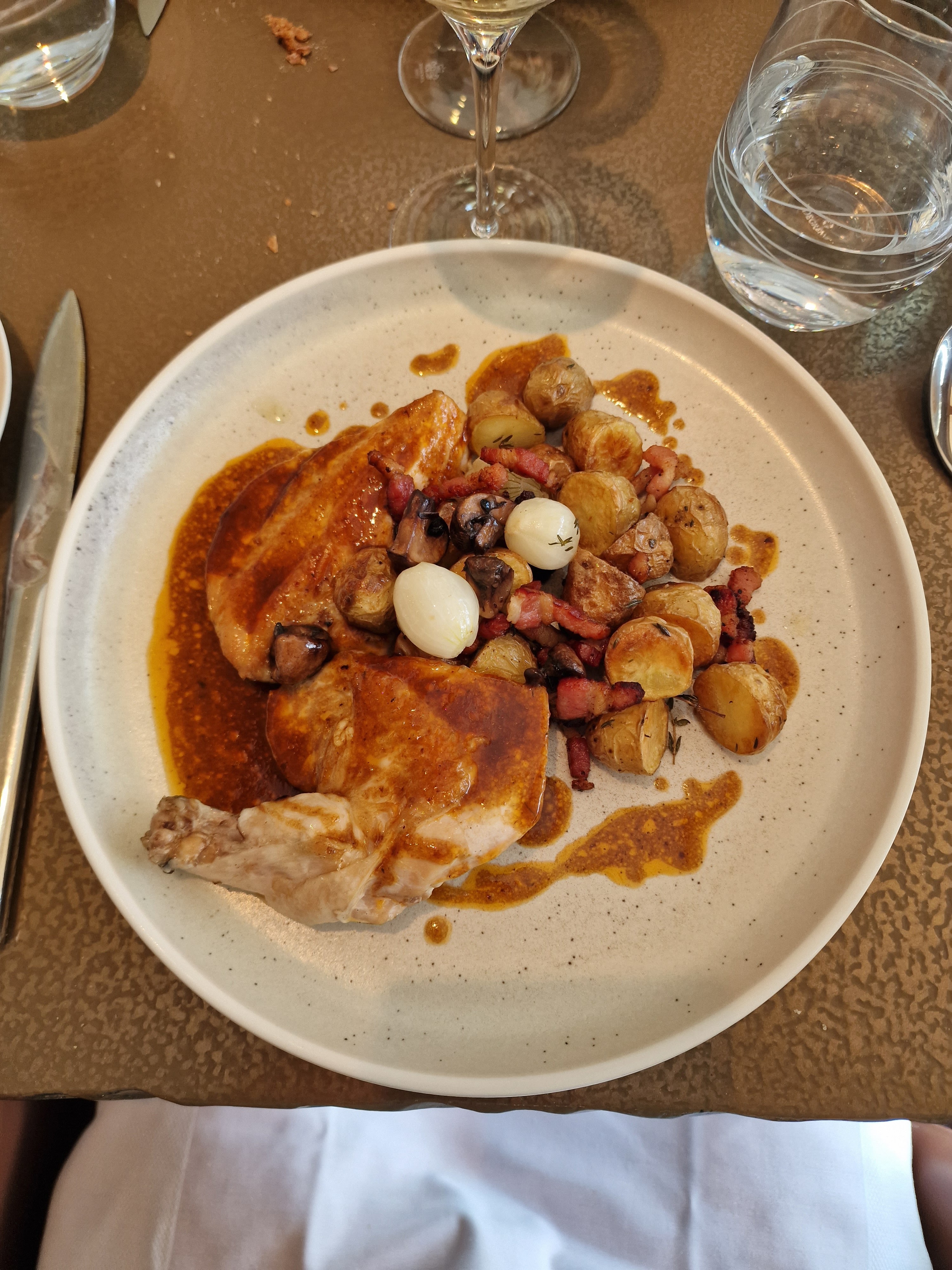 Chaleureux encouragements pour la belle maîtrise en cuisine à l'exception d'une poitrine de cochon un peu trop sèche et à l'assaisonnement tristounet. Egalement, attention au cerfeuil qui décore beaucoup de plats sans que ça se justifie ... Sinon, un vol au vent délicieux dans son jus corsé, une côte de bœuf remarquable, une belle cuisson de la lotte, le tout avec des assaisonnements réussis. Un bourgogne 2019 délicieux, un chariot de pâtisserie très gourmand avec notamment un éclair au caramel très sérieux... Décors un poil douteux mais très confortable, accueil charmant ... Bref à quelques détails près bravo et à très bientôt