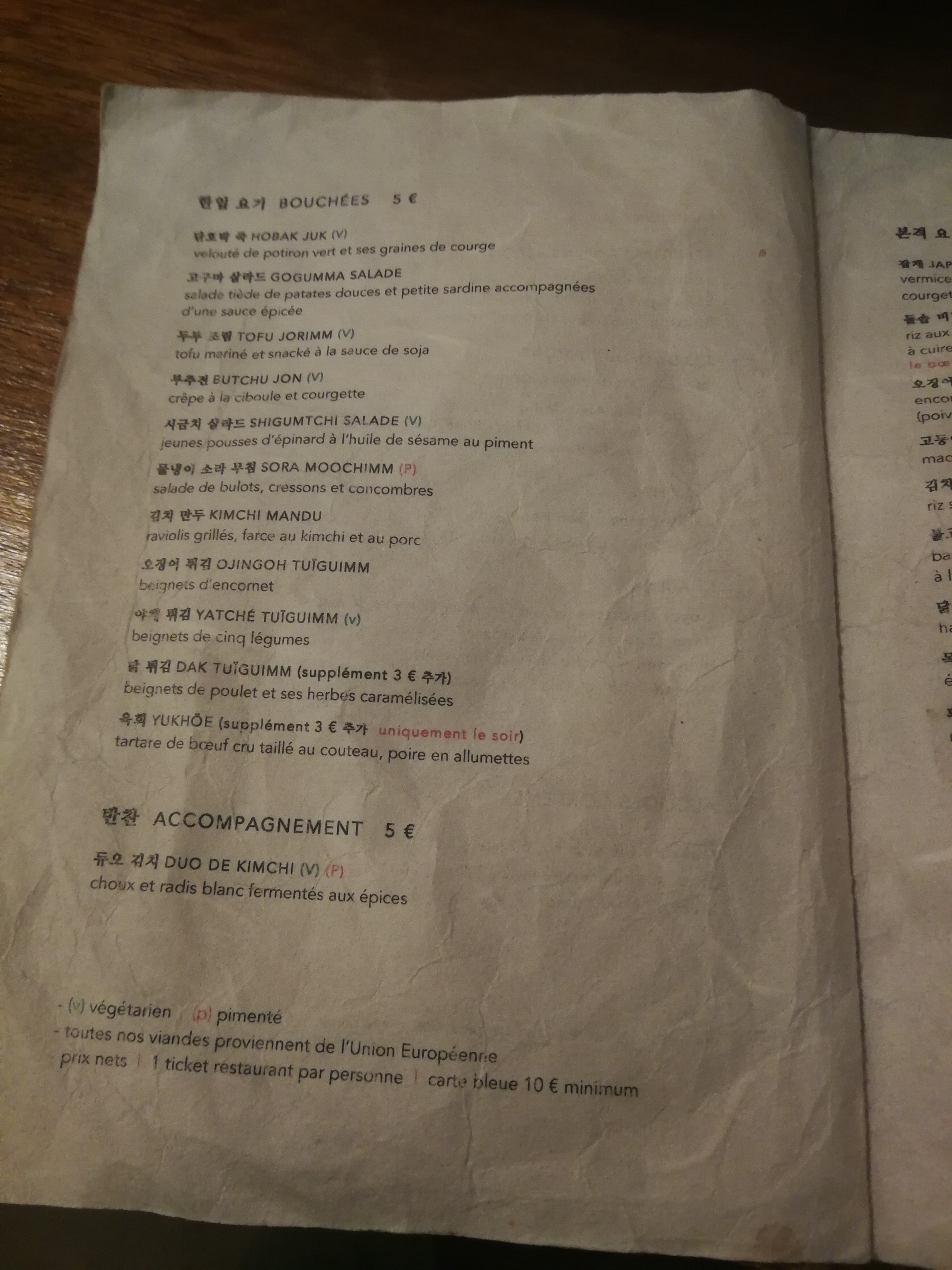 Cadre sympathique, jolie carte avec des plats typiquement coréen. Mais manque de saveurs… un peu déçue par la qualité des plats.