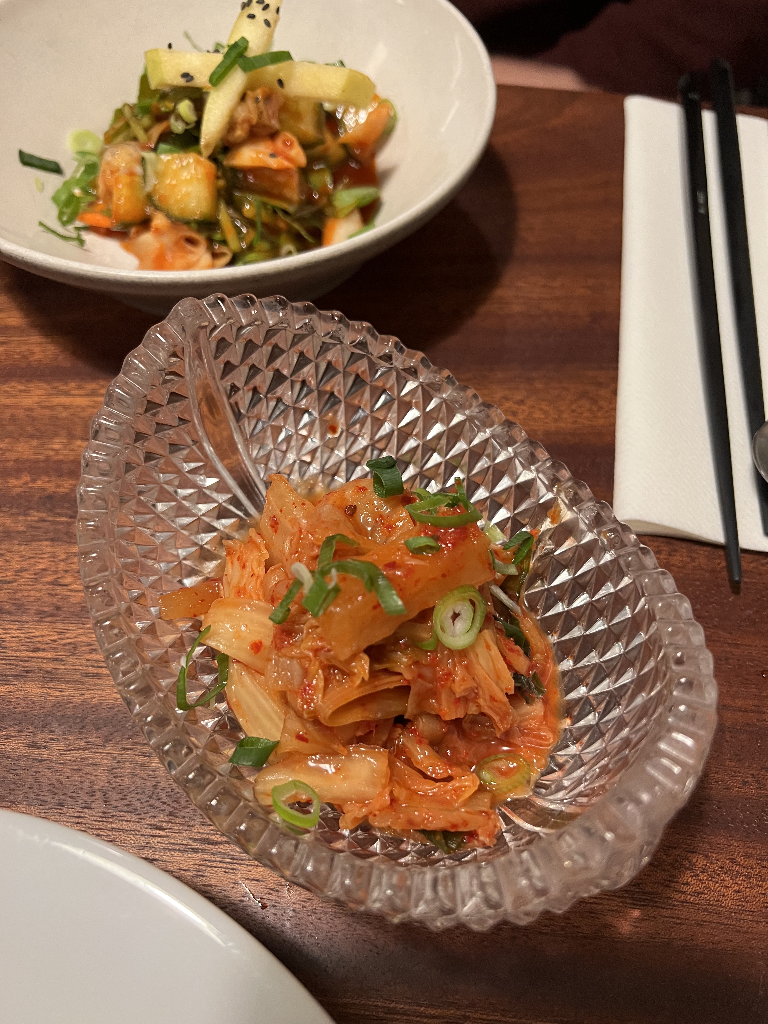 Le lieux est décoré en mode sombre, avec de la belle vaisselle et des gobelets en inox. Le service est agréable. Nous avons partagé des kimchi mandu, et j'ai mangé comme plat principal un bulgogi accompagné d'une bière blonde koréenne. Ce fût un diner très agréable, je reviendrais.
