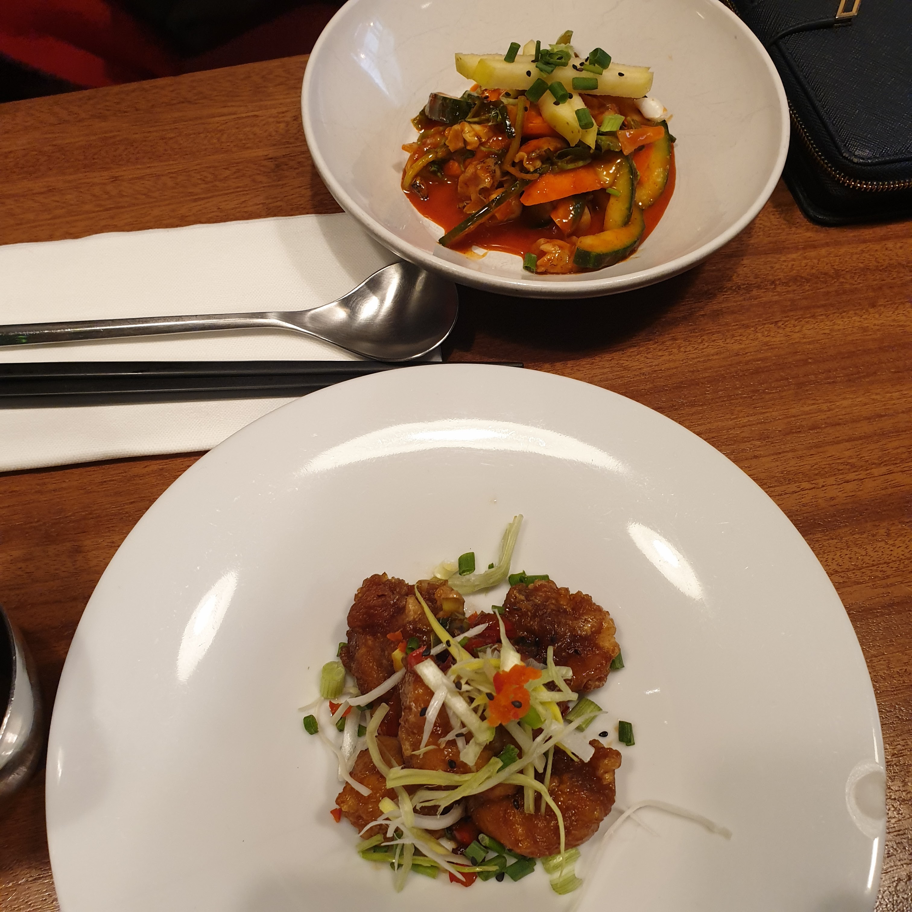 Le lieu est beau et agréable, le service était très correct, personnel poli et attentif. Par contre, je suis restée mitigé sur les plats. Les quantités sont assez restreintes, entrées bien présentées, nous avons pris le tofu et une autre entrée à base de patate douce et de poisson (trop piquant à mon goût, qui prend le dessus sur les autres épices). Grosse déception sur le bimbimbap, composé principalement de riz et de salade verte, pour 14€... Et en dessert, nous avons pris du riz cuit avec des jujubes et noix, j'ai trouvé le dessert plutôt sec, il aurait été meilleur plus crémeux.